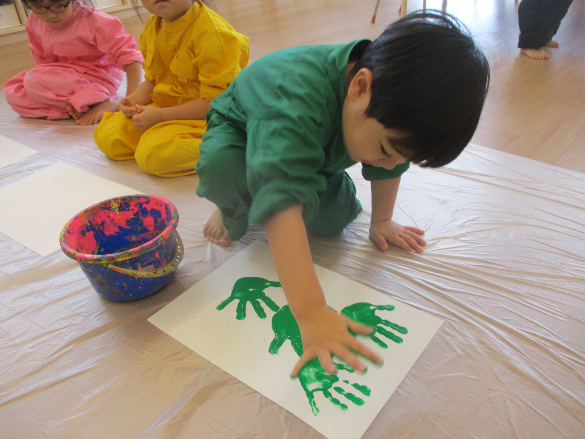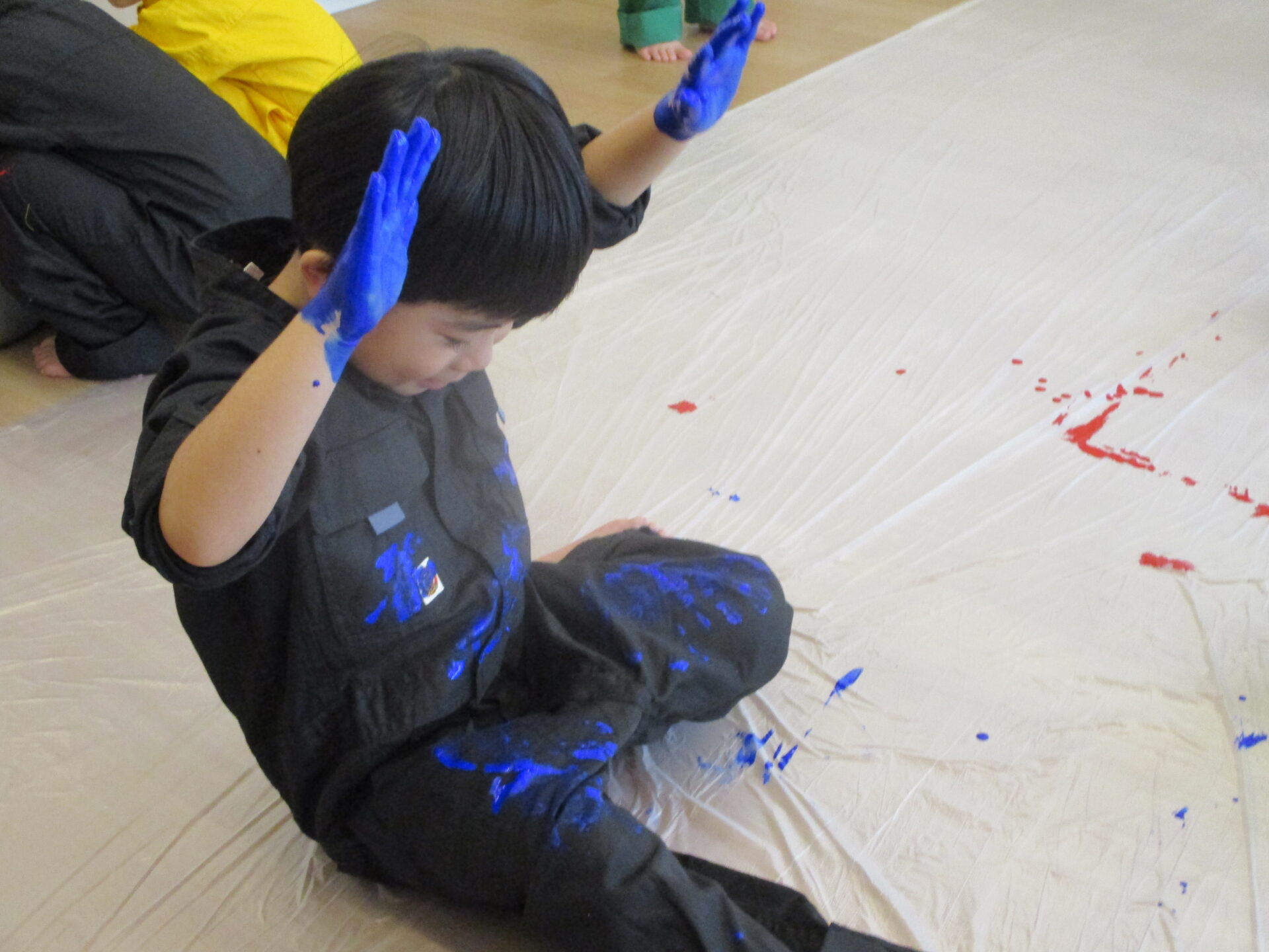 色とりどりのつなぎに着替えて好きな色、好きな方法で絵の具遊びを楽しんでいます。
