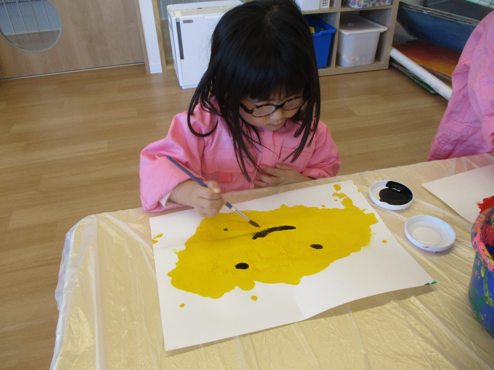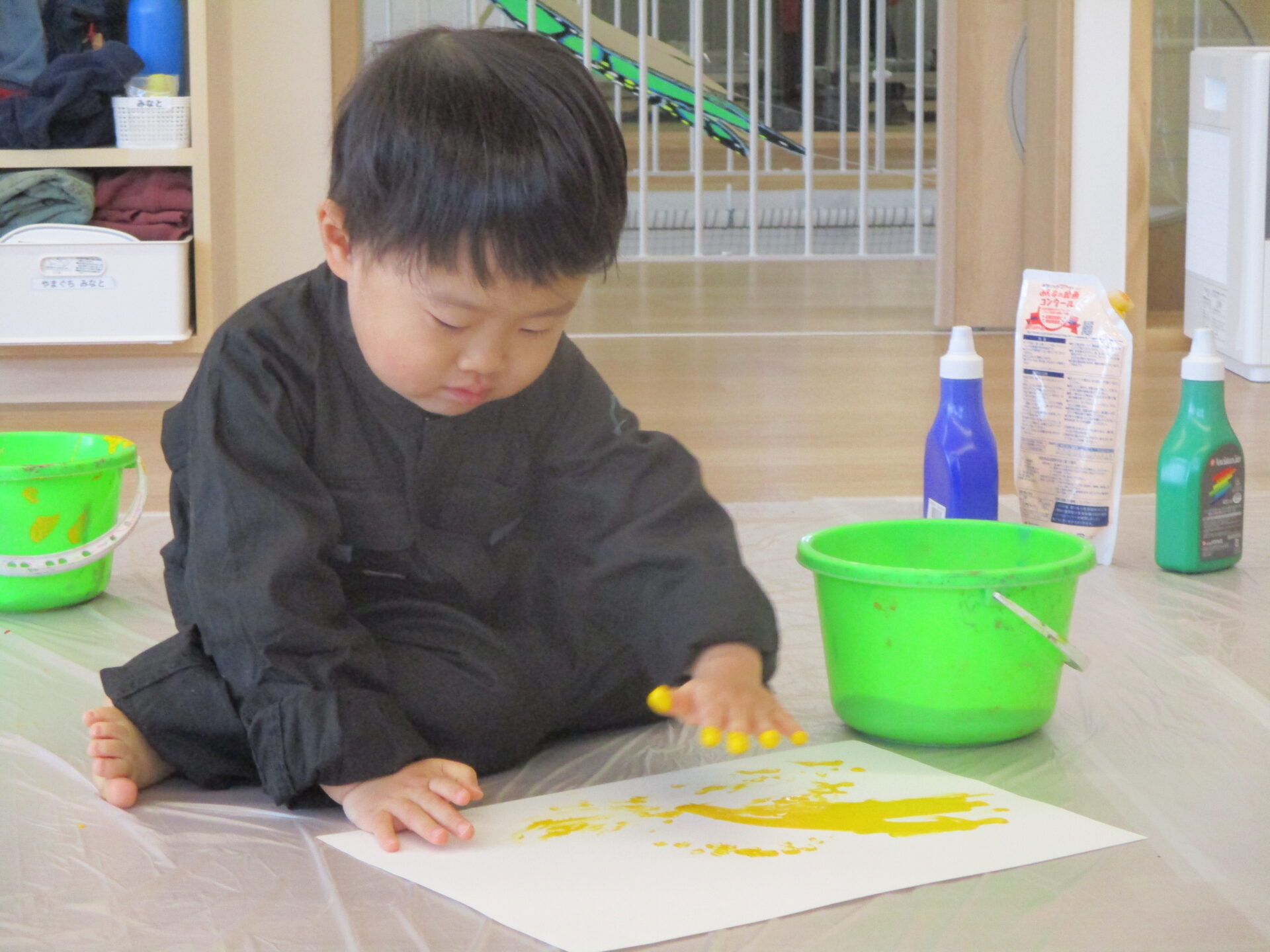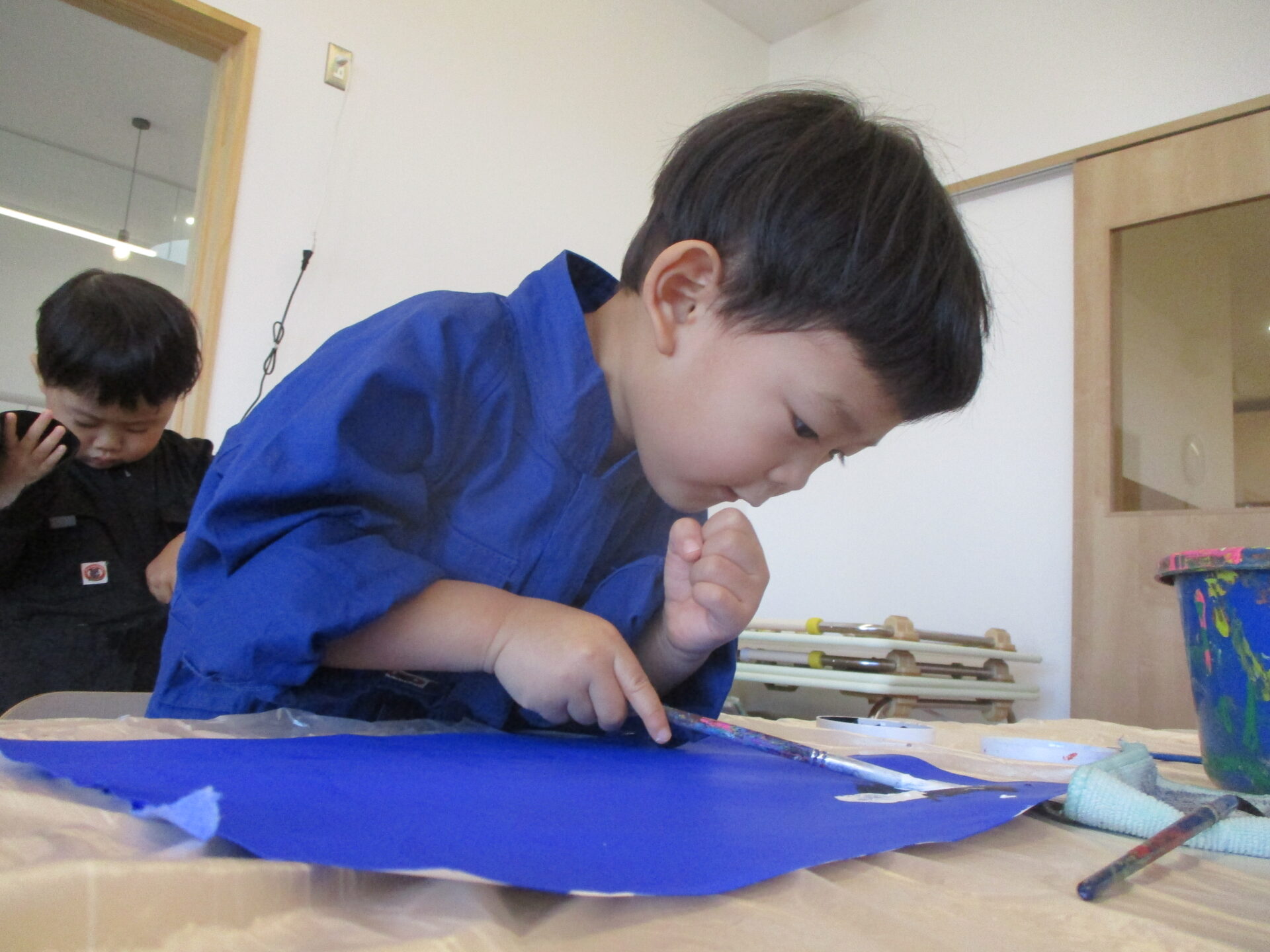 当園では汚れることを気にすることなく、絵の具を遊びを楽しめるように3歳以上児クラスでは絵の具用のつなぎを用意しています。