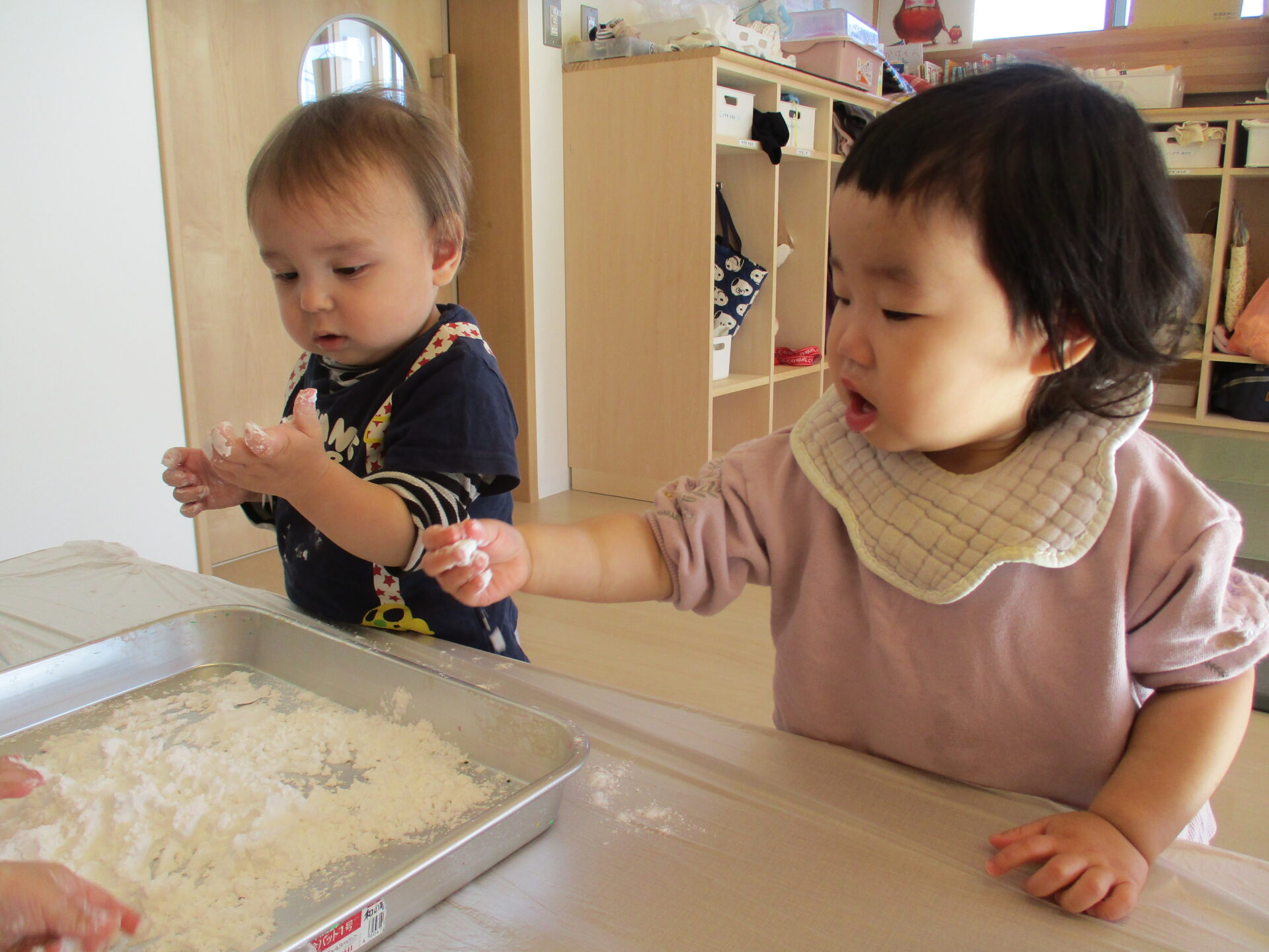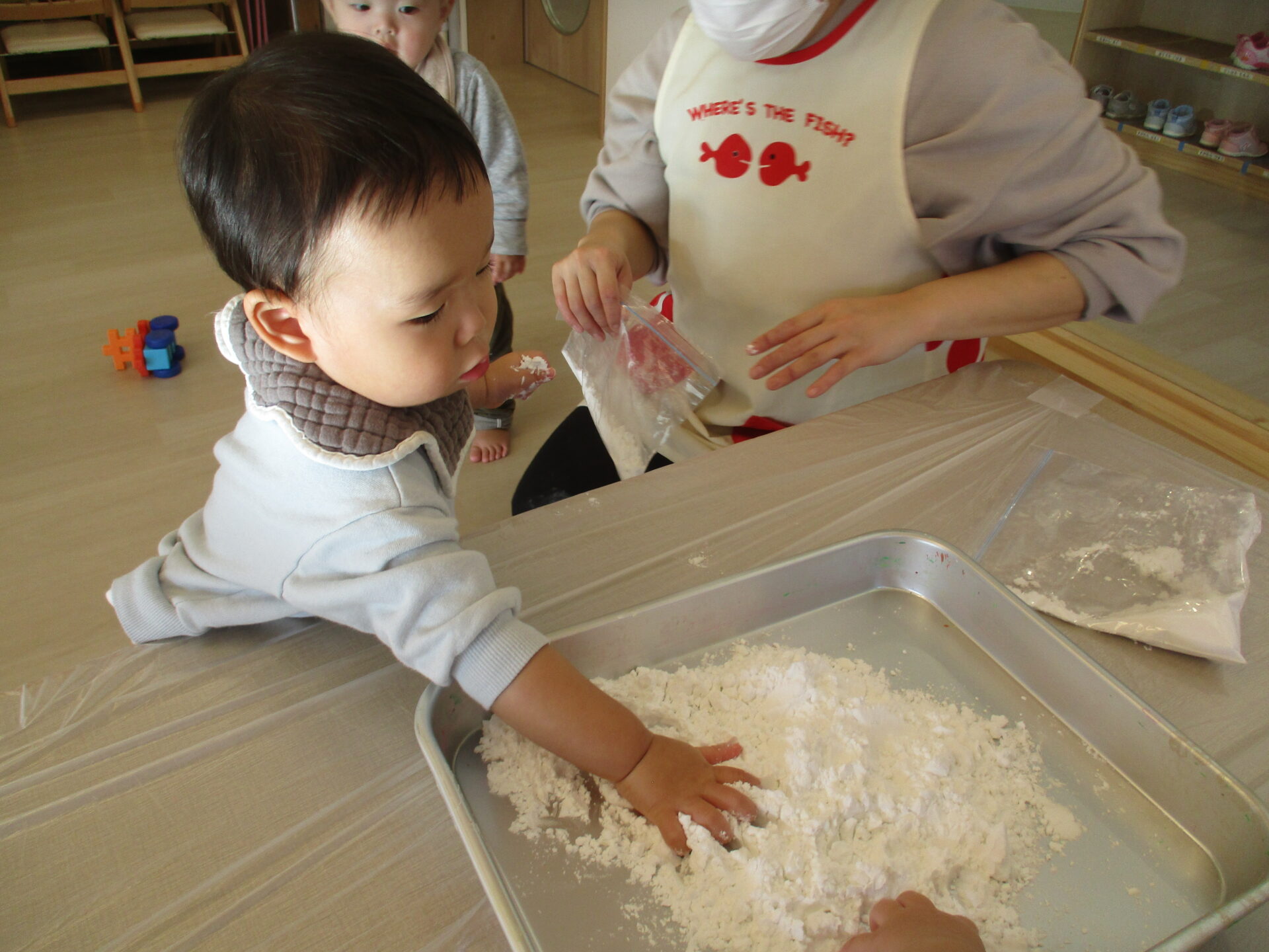 すぐに手を伸ばして触ったり、指先でちょっとずつ確かめたり、小麦粉の感触と手が白くなる変化を手指だけではなく、目でも感じているこどもたちが感じている想いに寄り添いながら、その想いを言葉に変えて表現しながら、一緒に楽しんでいきたいと思います。