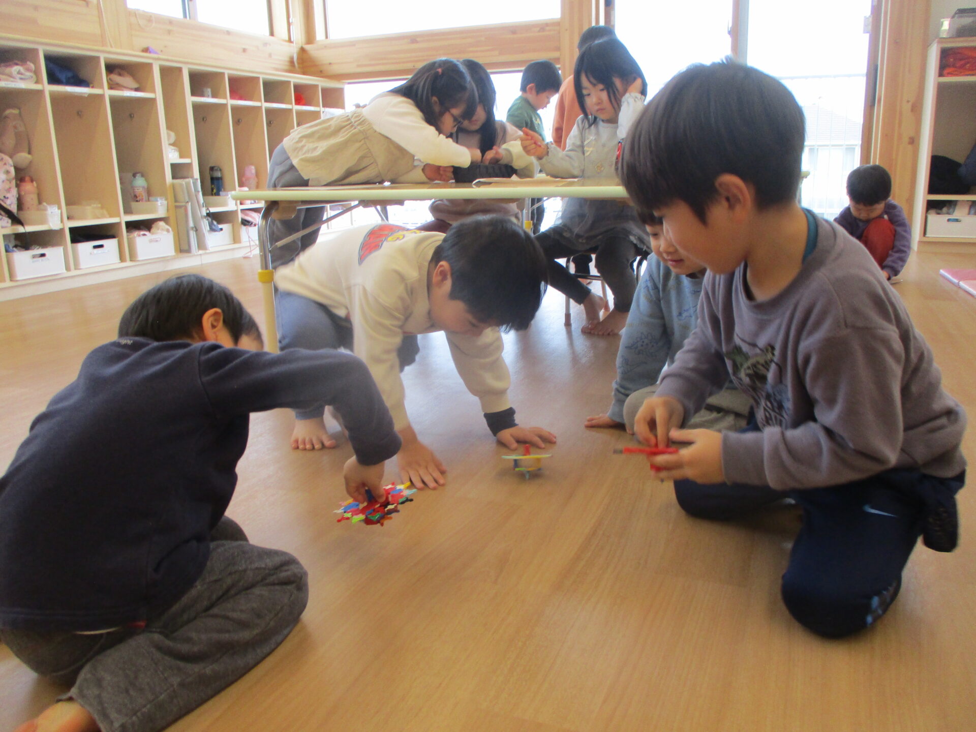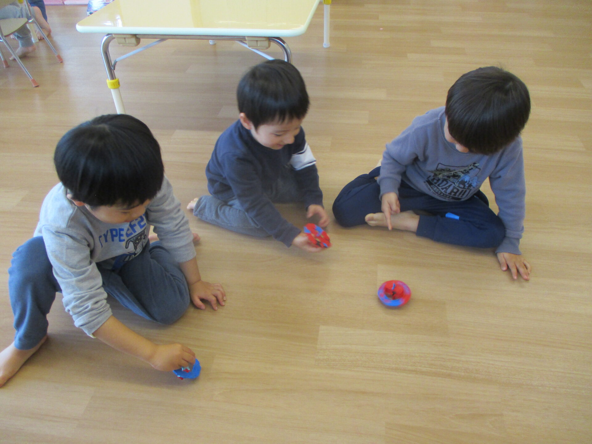 にじ組(3歳児)のこどもたちが何かを回して遊んでいます。