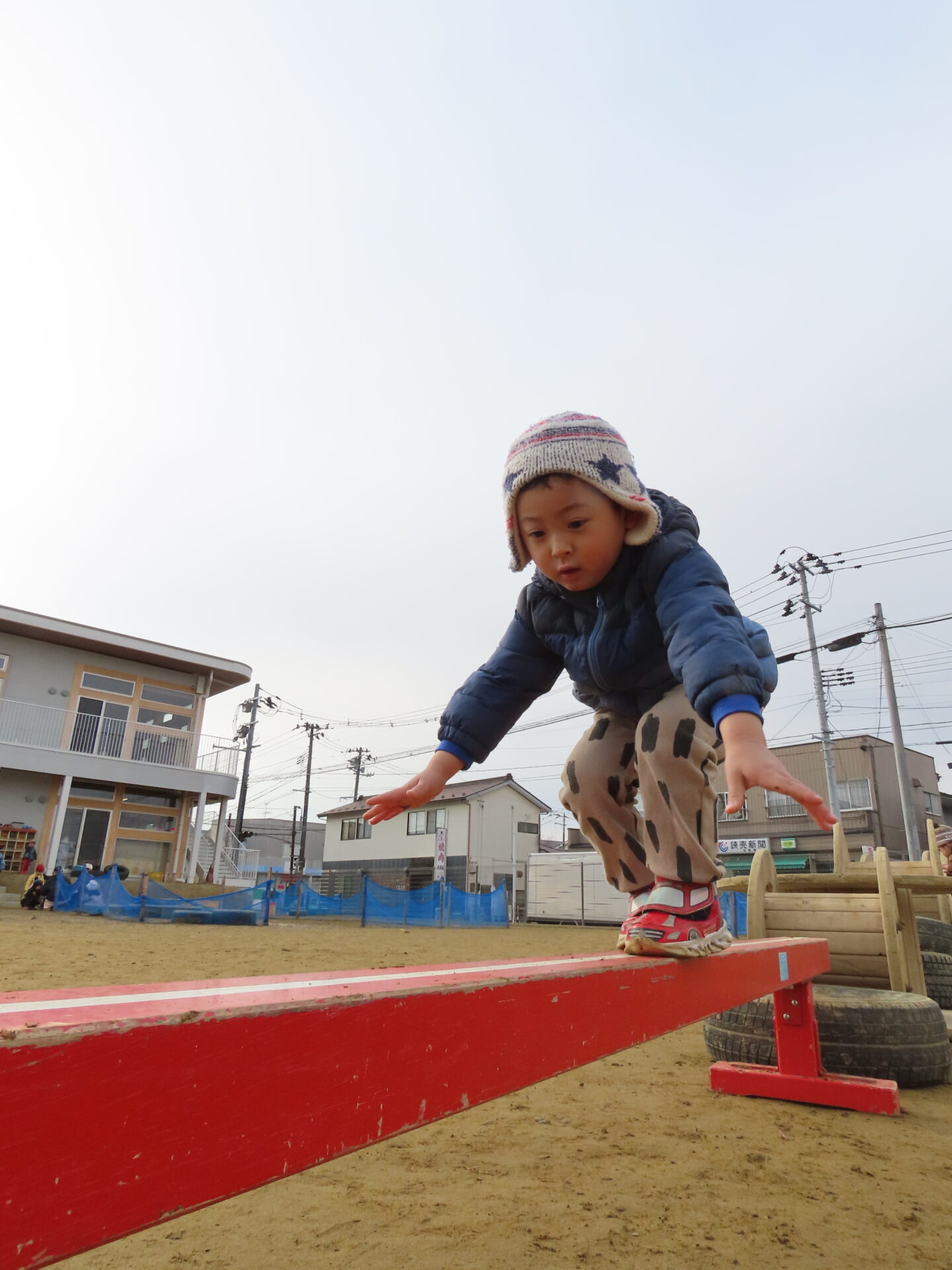 「できるかな~?」とドキドキする気持ちに寄り添いながら、保育者と手を繋いで渡ったり、