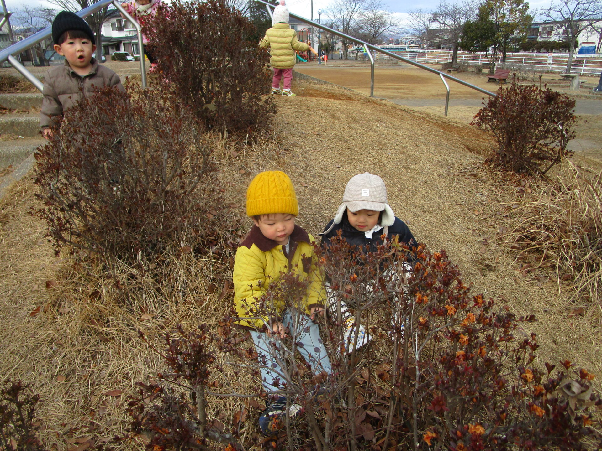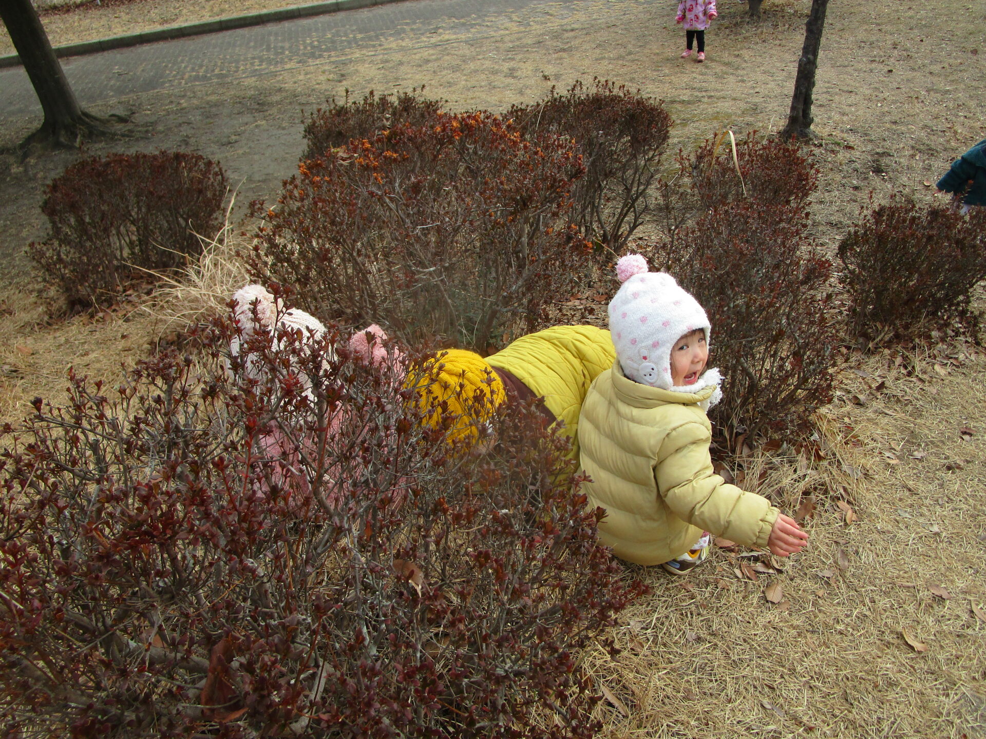 だいち組(0・1歳児)のこどもたちが大手町2丁目公園での好きな遊びのひとつに「かくれんぼ」があります。築山の植え込みに座り込んで隠れ始めるこどもたちの姿を見て、保育者が「もういいかい?」と声を掛けると、あちこちで「まーだだよー」と、かくれんぼが始まります。