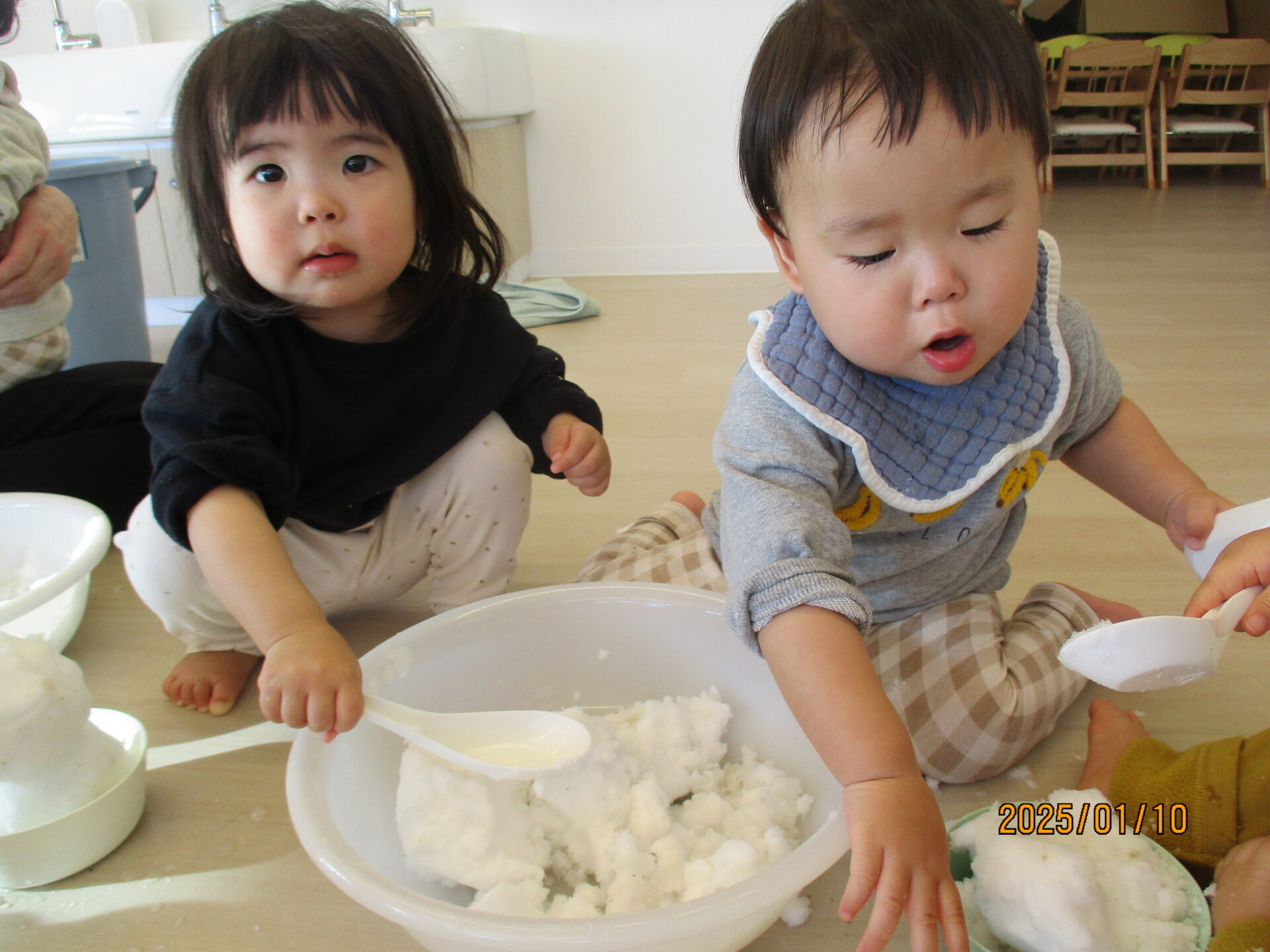 1月、雪が降った時にうみ組(0歳児)では室内で雪遊びを行いました。