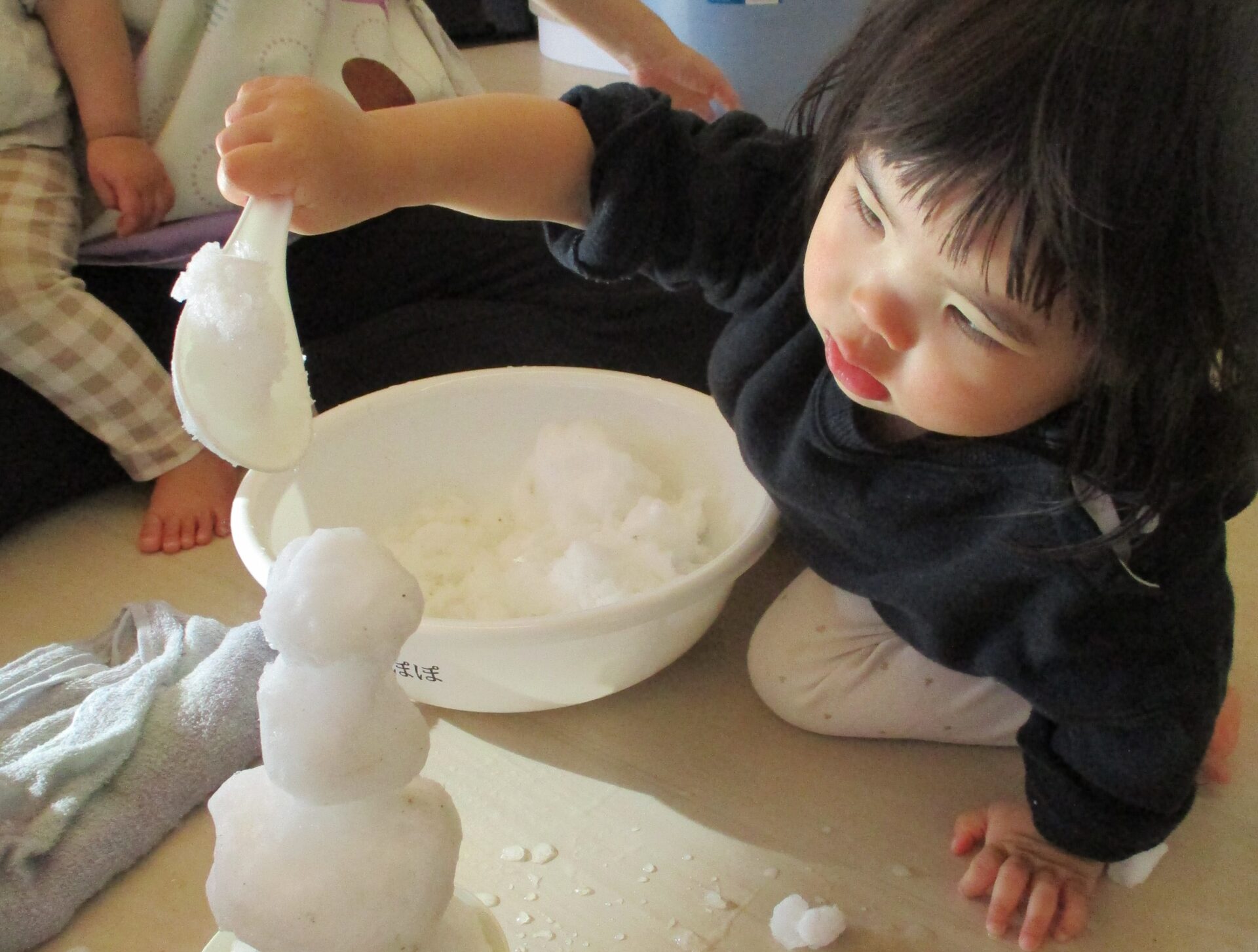 洗面器の雪を手で感触を確かめたり、ままごとのレンゲですくったり、
