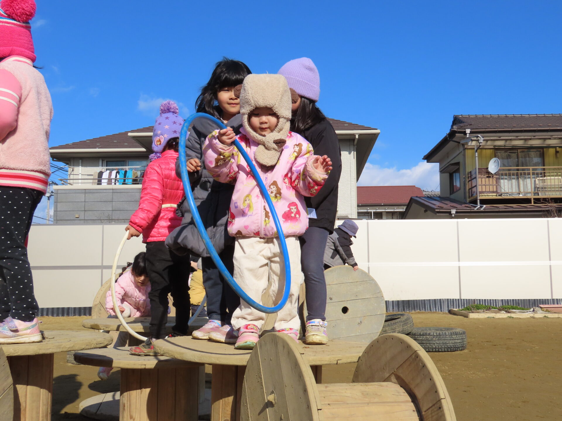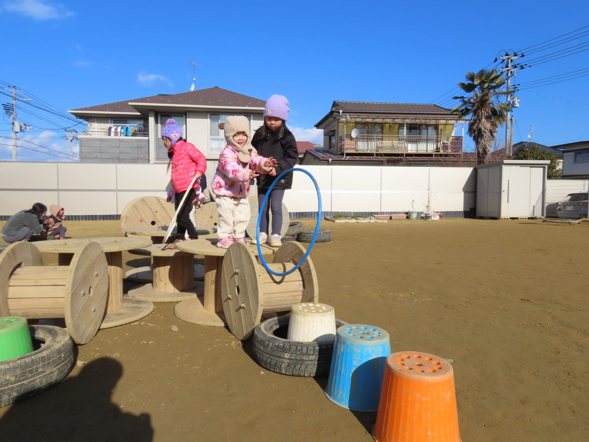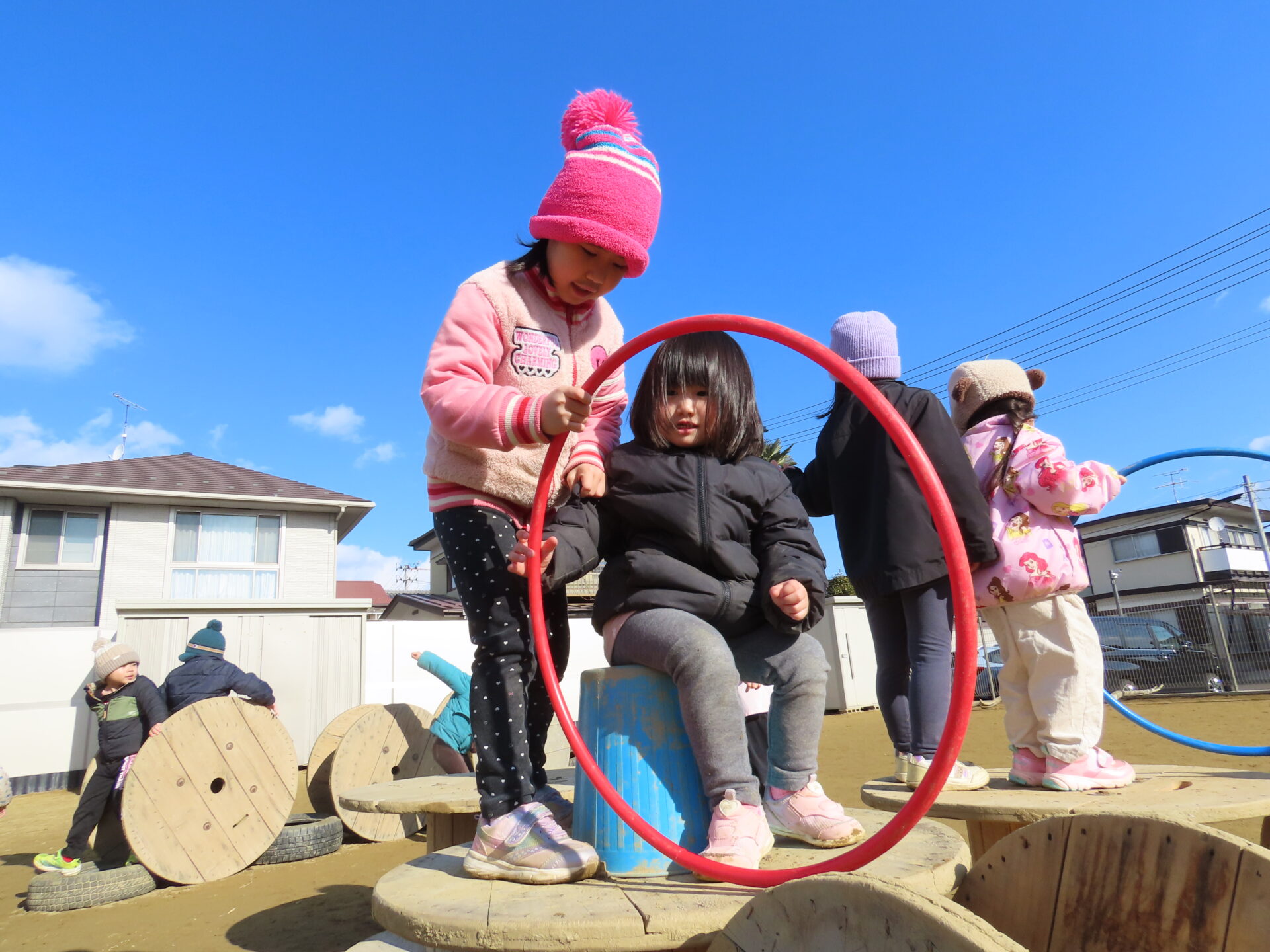 そら組(4歳児)のこどもたちがあめ組(2歳児)のこどもたちを誘って楽しそうに遊び始めていました。