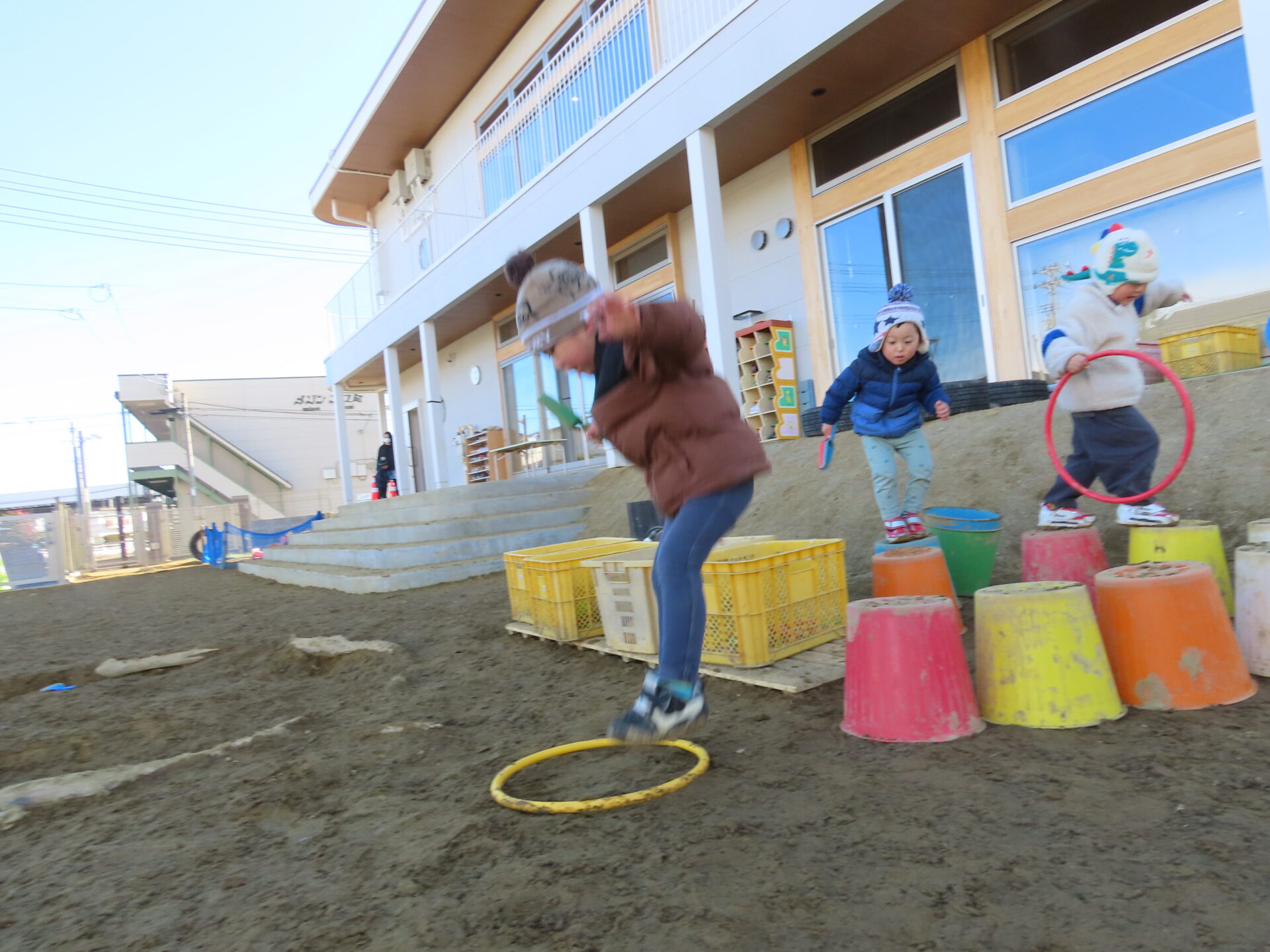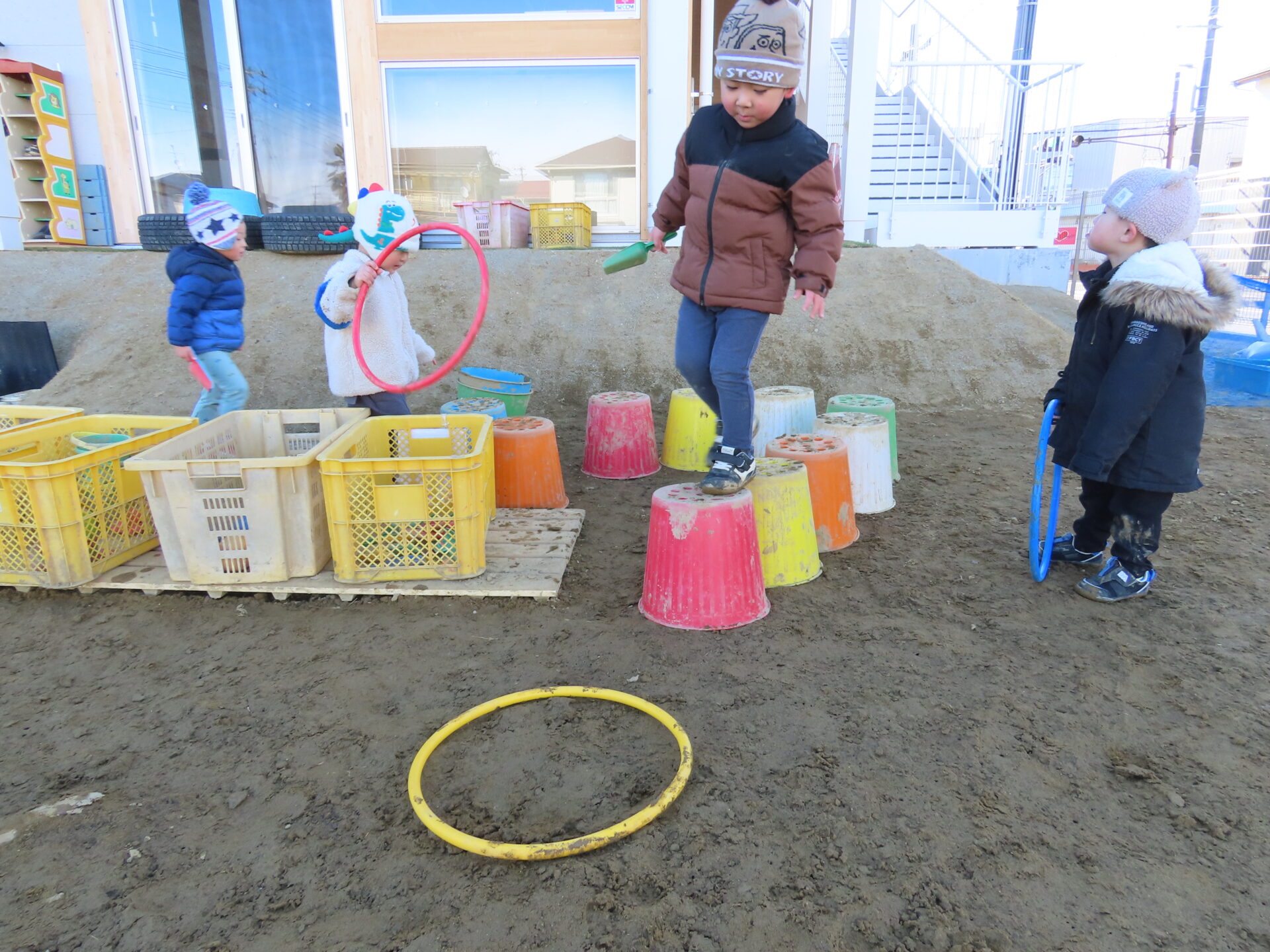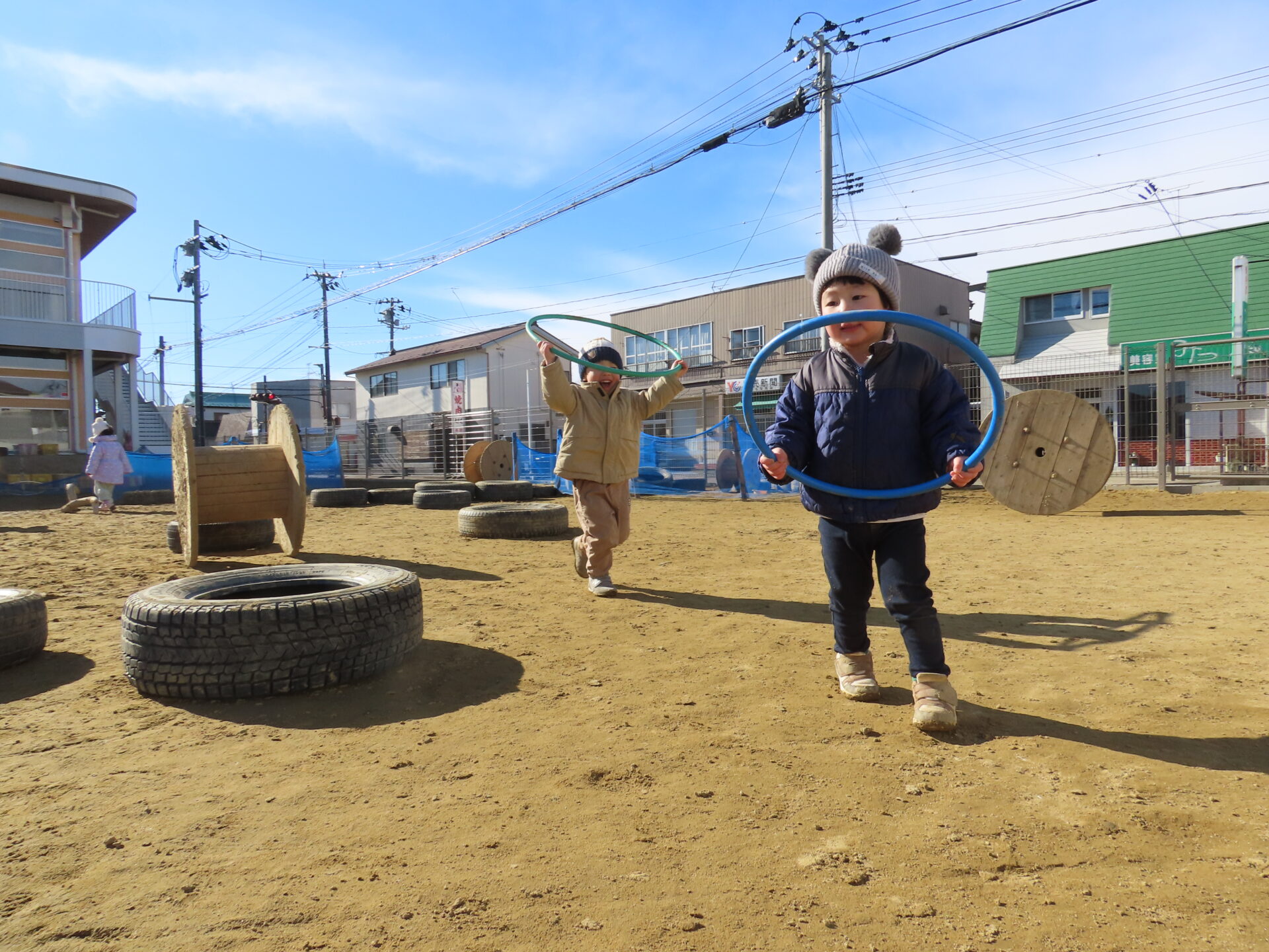 こどもたちの豊かな発想で道具も様々な使い方が生み出され、遊びが変化しながら友だちとの関わりを楽しんでいる様子は頼もしい限りです。これからもこどもたちの発見や発想を一緒に楽しんでいきたいと思います。