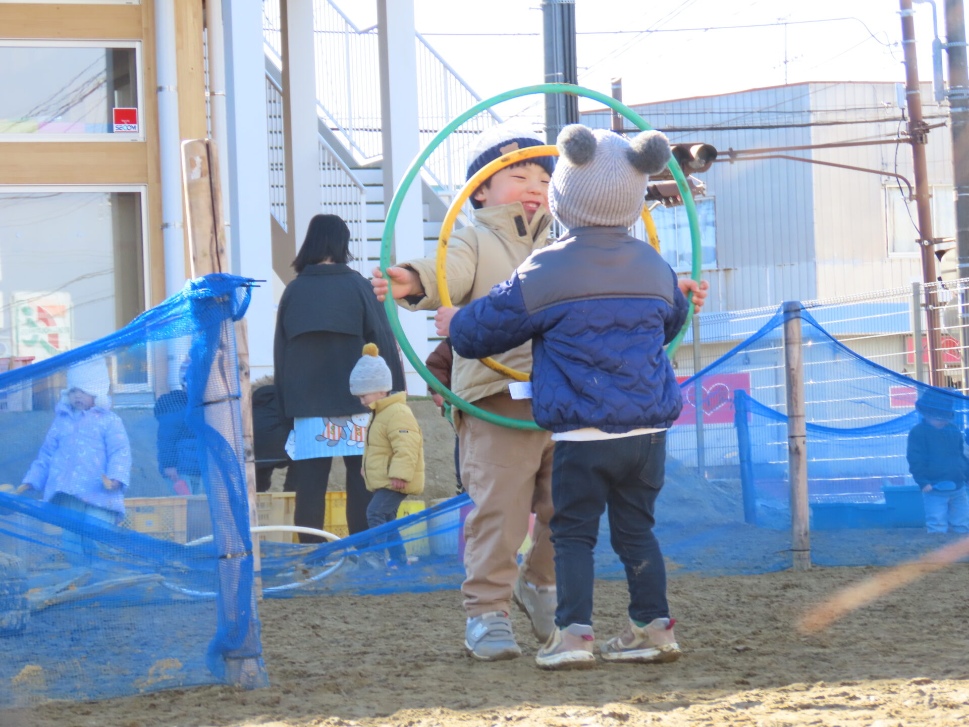 出会った友だちとフラフープの大きさを比べてみたりすることなどを楽しんでいます。