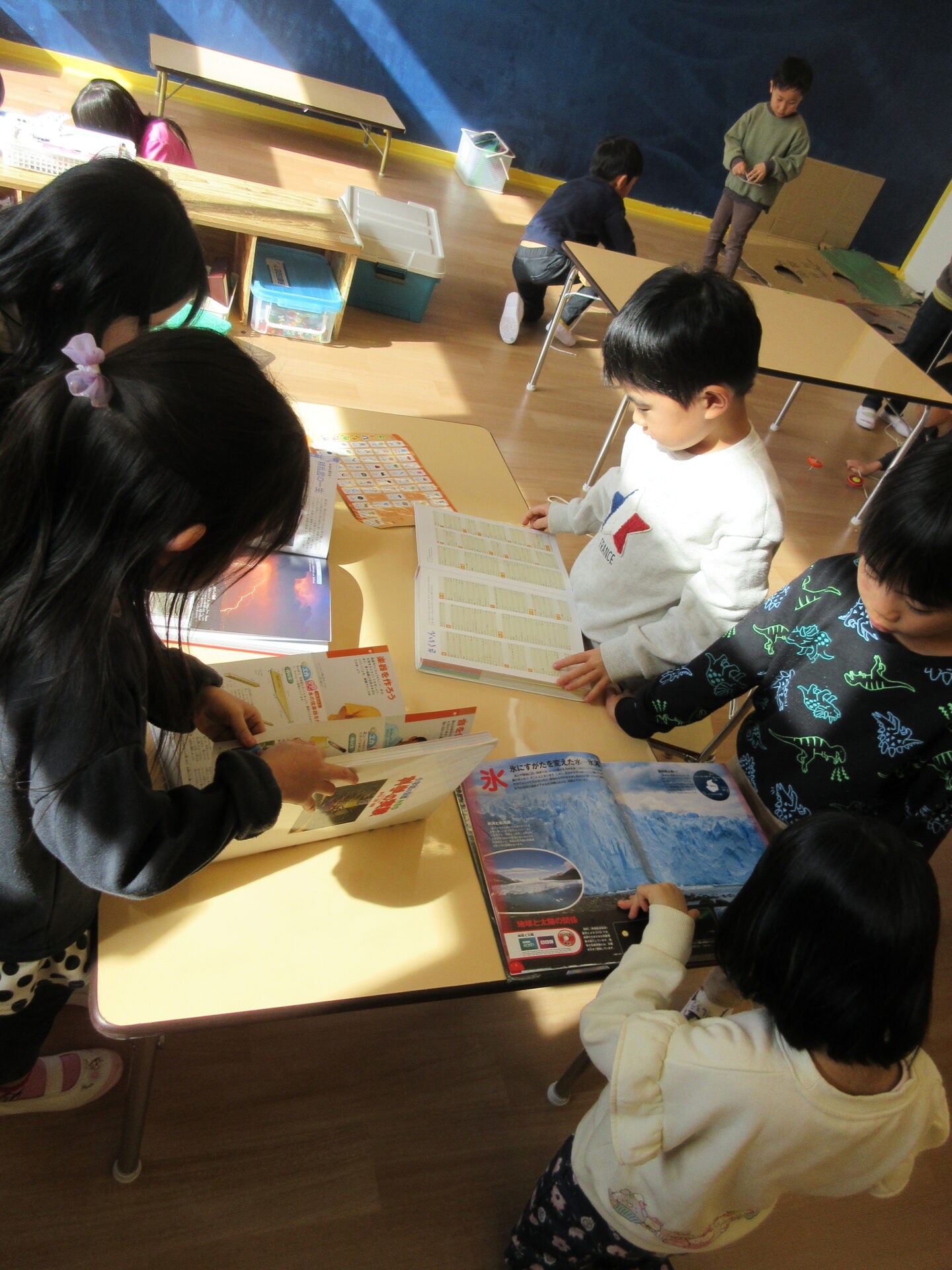 絵本コーナーから天気の図鑑を探し、みんなで調べます。