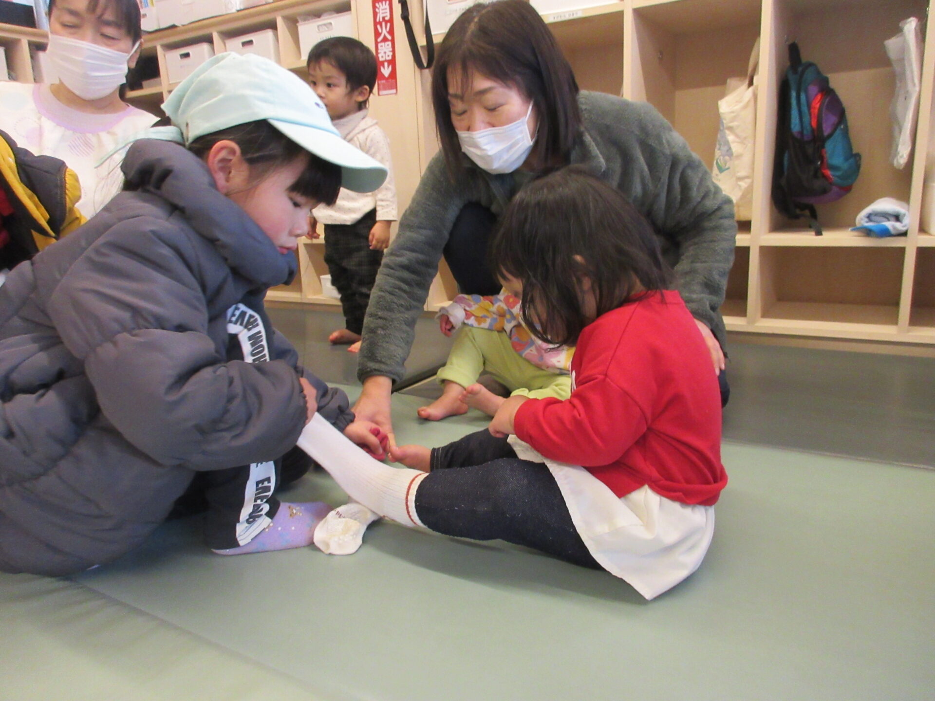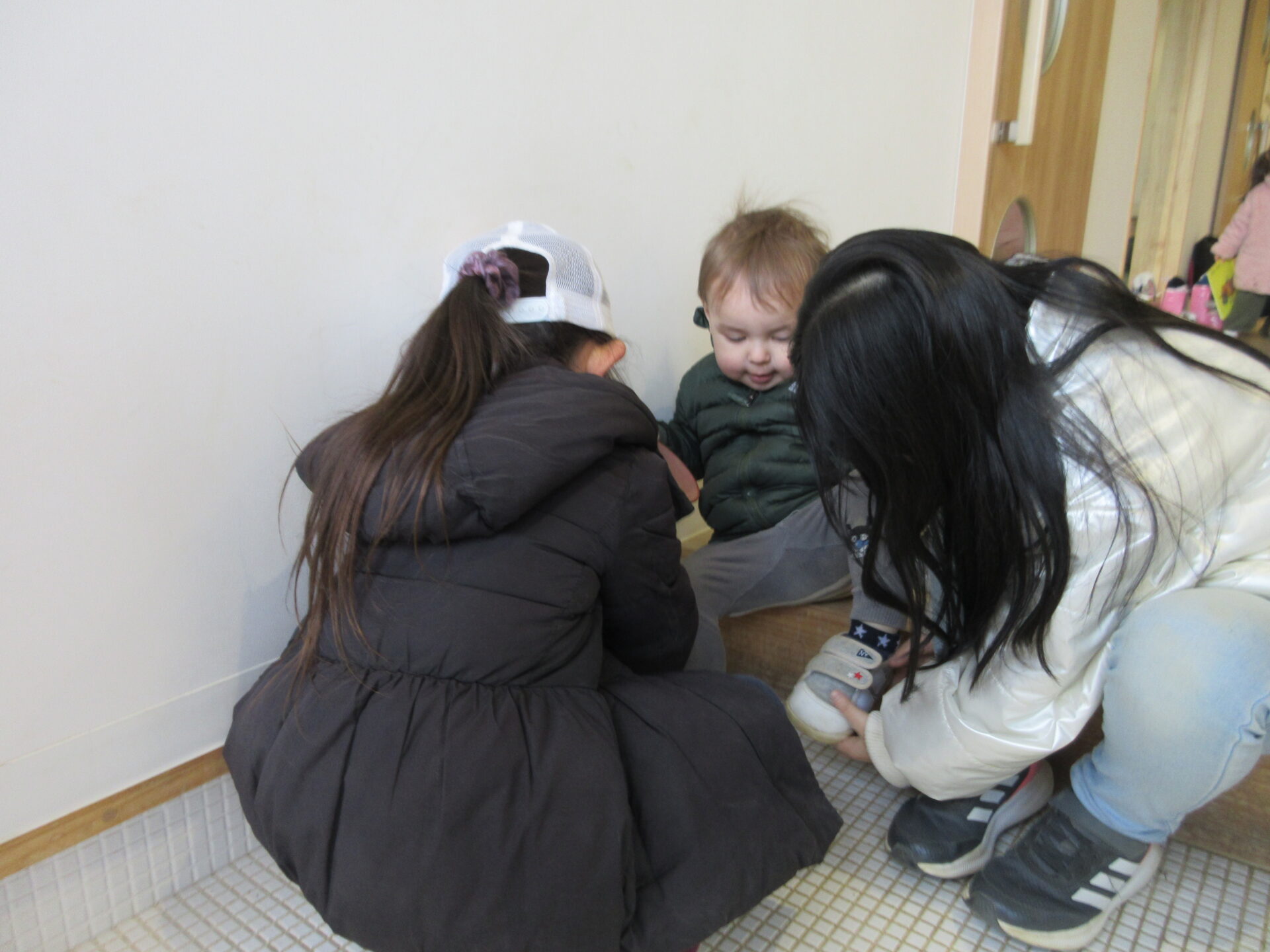 靴などの脱ぎ履きを手伝ってあげたい5歳児のこどもたちにお世話してもらった0歳児のこどもたちはお兄さん、お姉さんたちとの関わりに甘える様子が見られ、みんなの笑顔が絶えない交流になりました。
