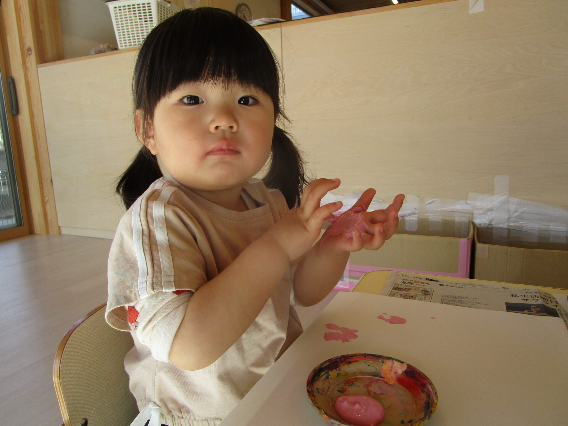 だいち組(0,1歳児)のこどもたちが「ゆび絵の具」を使って遊びました。
