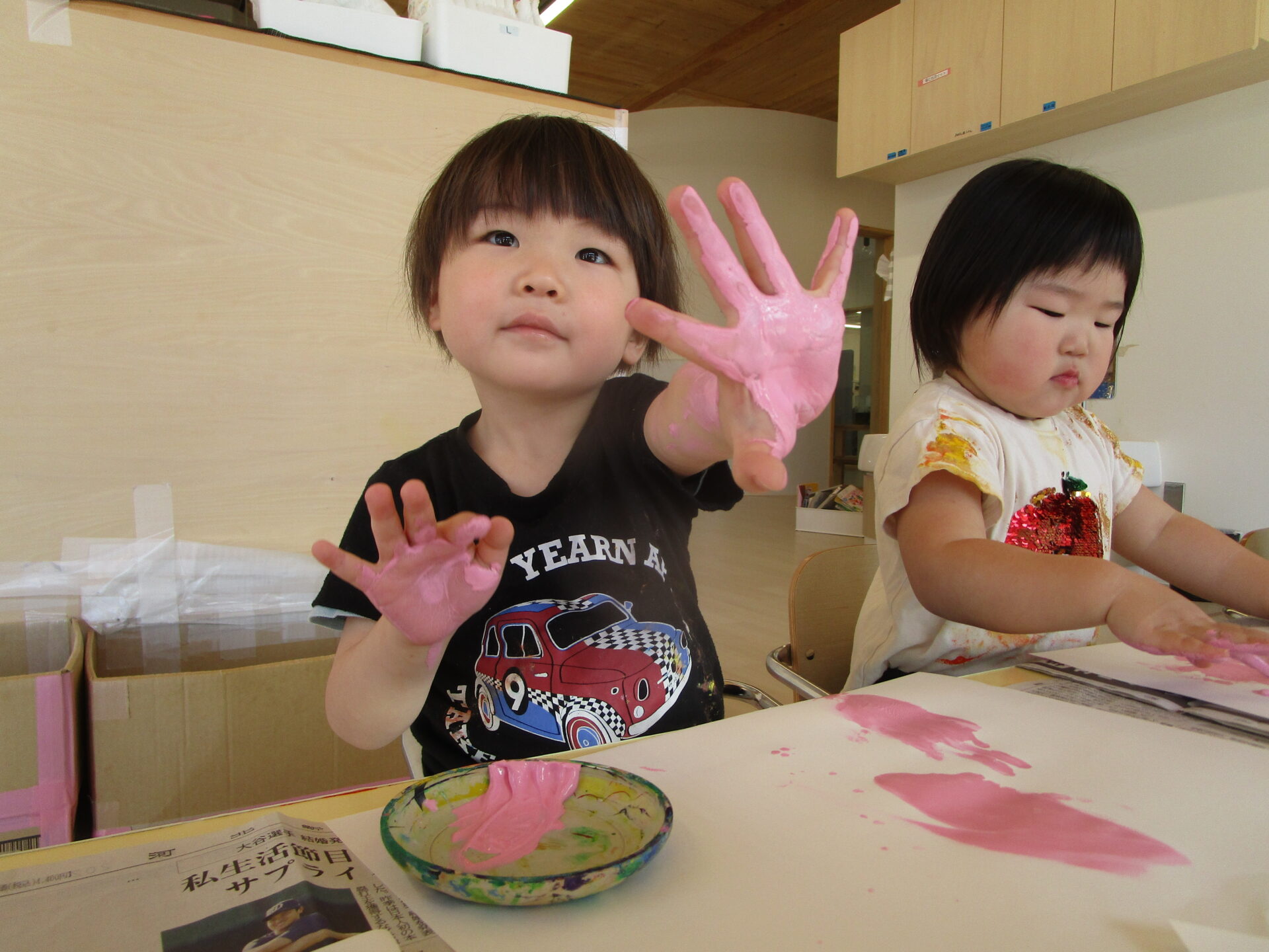 だいち組のこどもたちが思い思いに絵の具遊びを楽しんだ紙には、いろいろな桃色の模様が表れただいち組のお部屋は一足早い「春」が訪れたようでした。