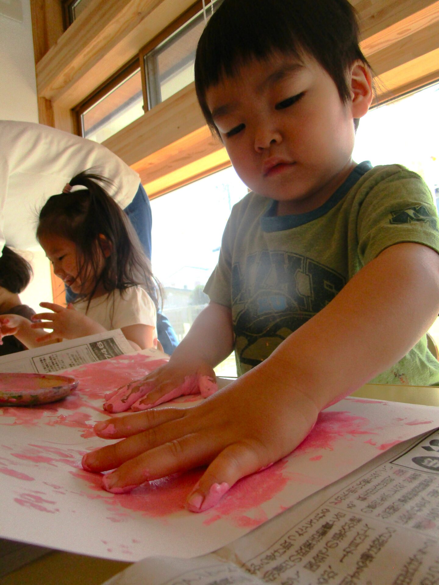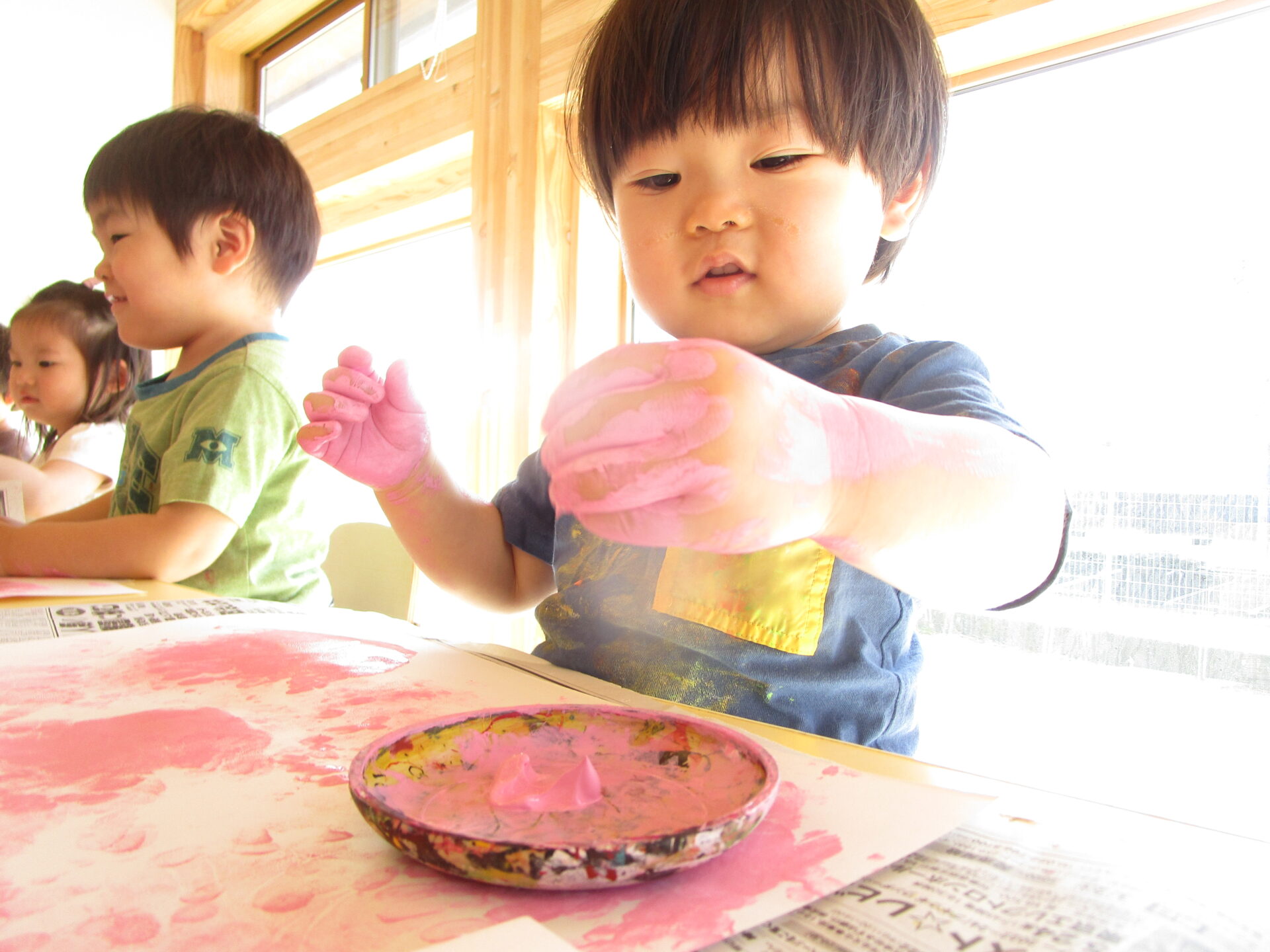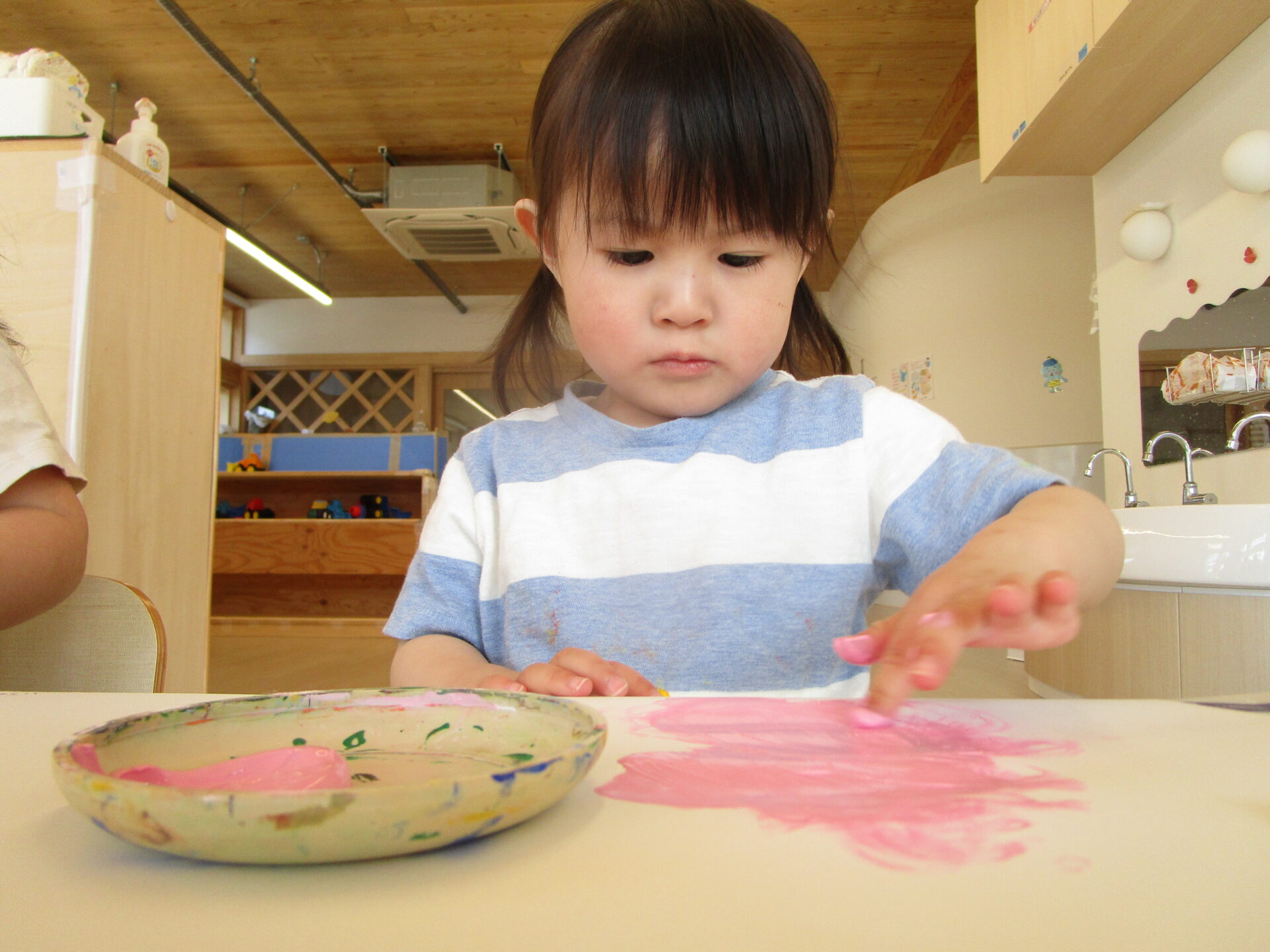 いろいろな感触を手のひらで楽しむこと、指先を使って絵の具をのばすことなど、思い思いに楽しんでいます。