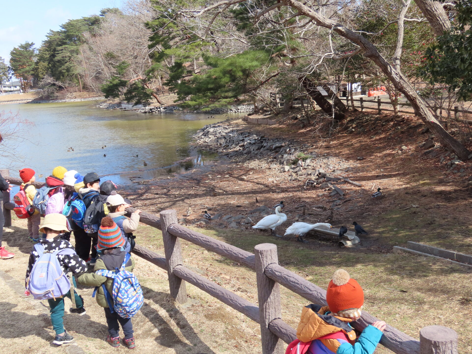 広い公園をみんなで散策していくと、餌を食べている鳥たちに出会いました。
