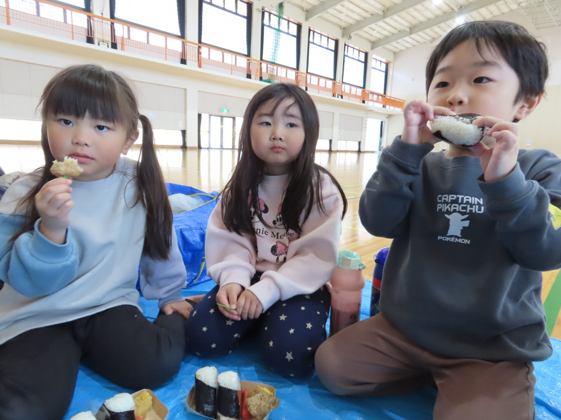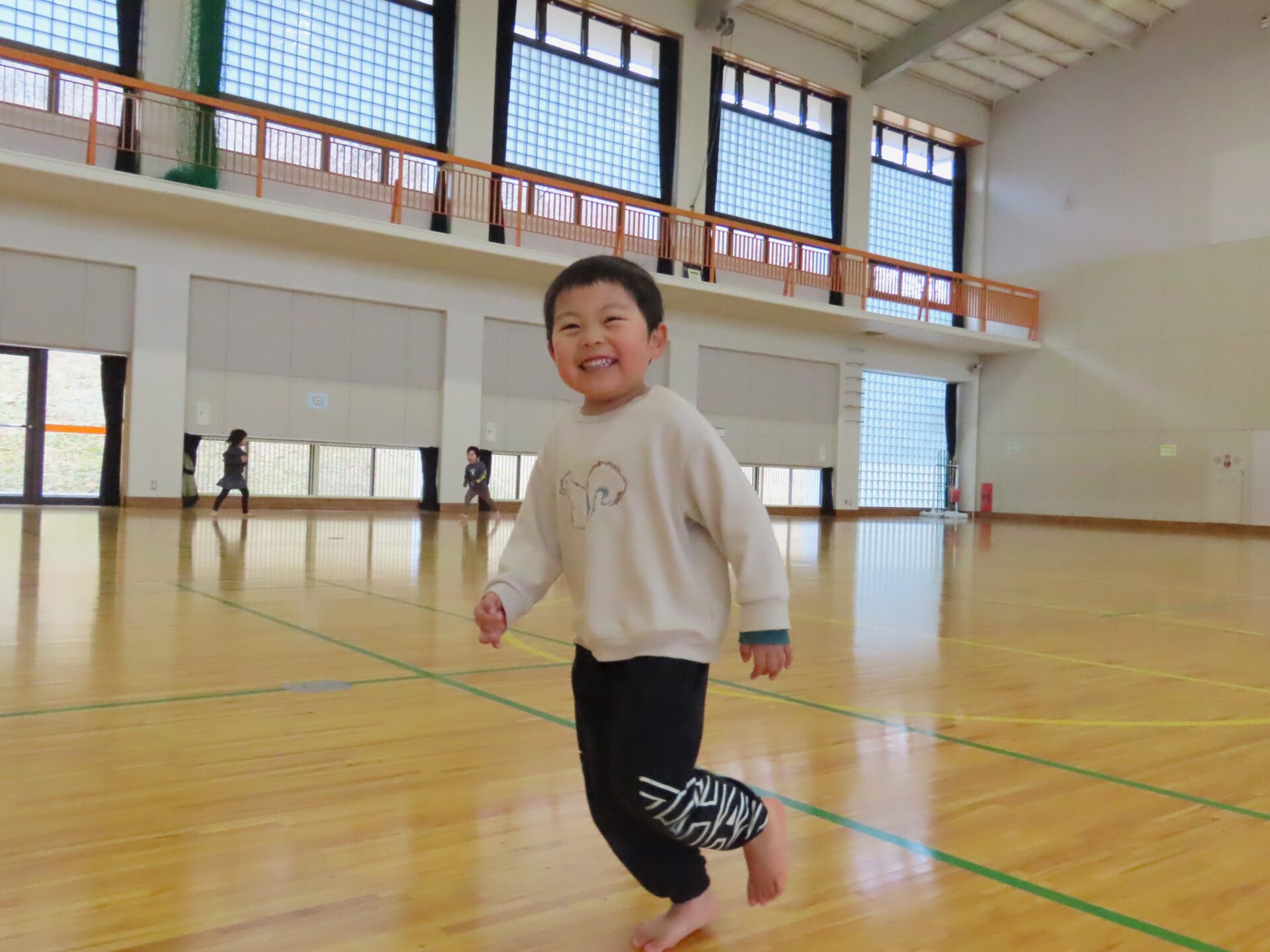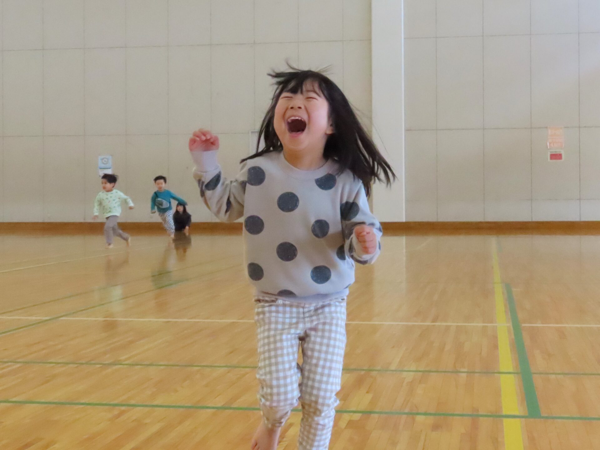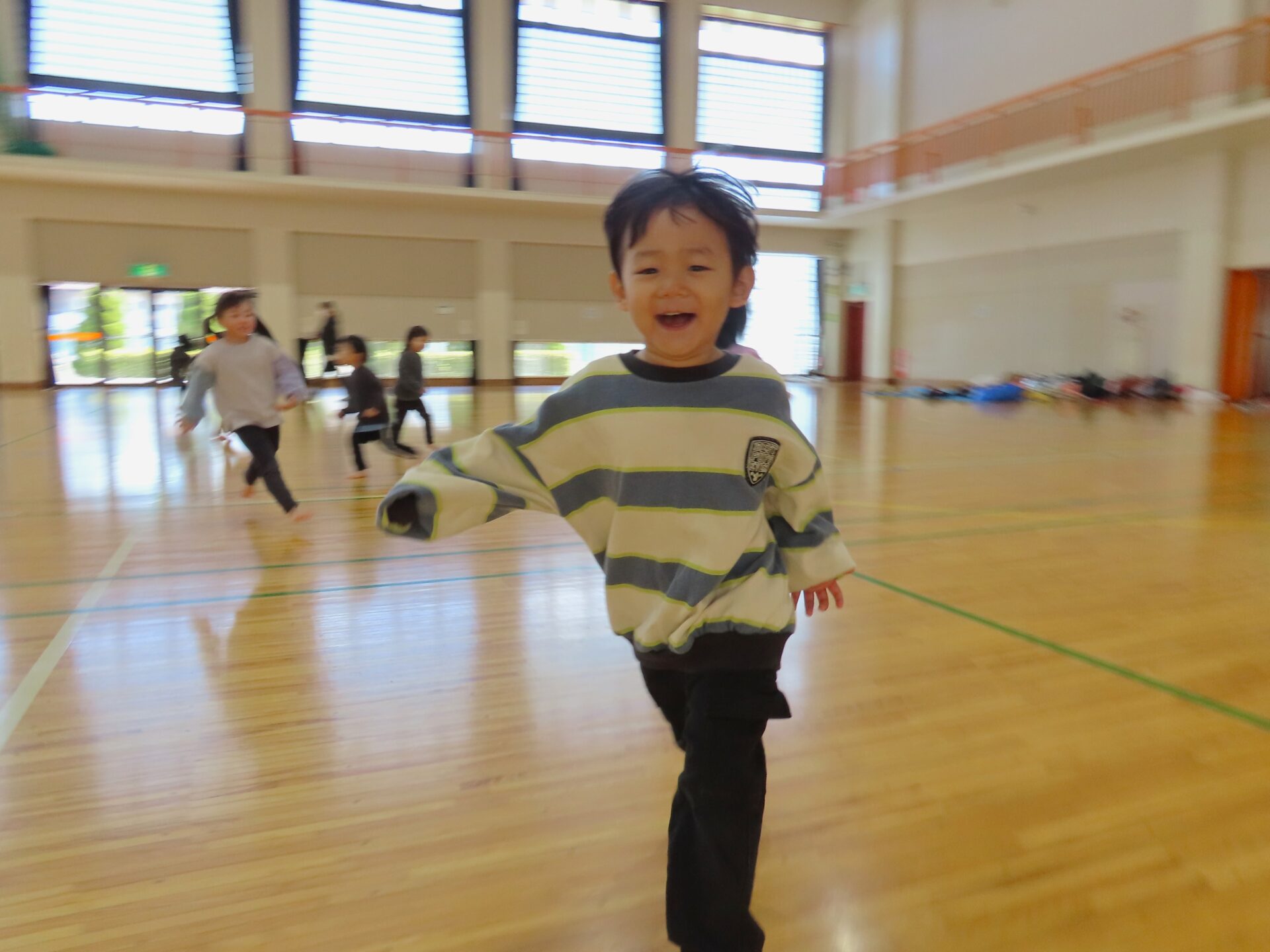 体育館に到着すると、広さに驚きと楽しさが爆発したかのように、こどもたちは走りだしていました。