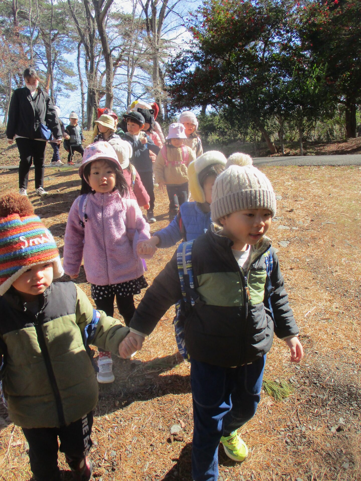昨年の秋に雨で延期になっていたにじ組(3歳児)の「朝日山公園散策」計画。