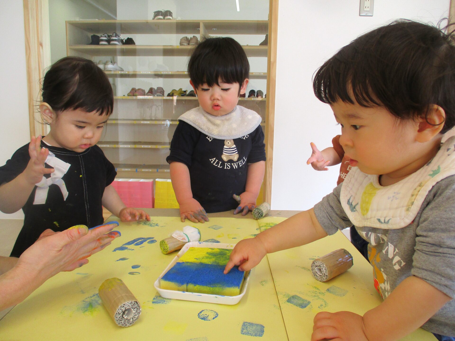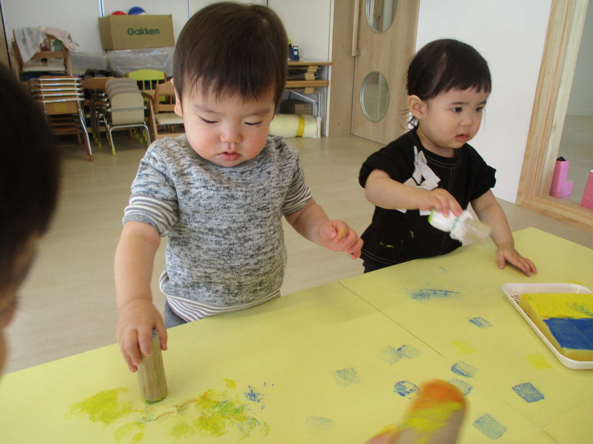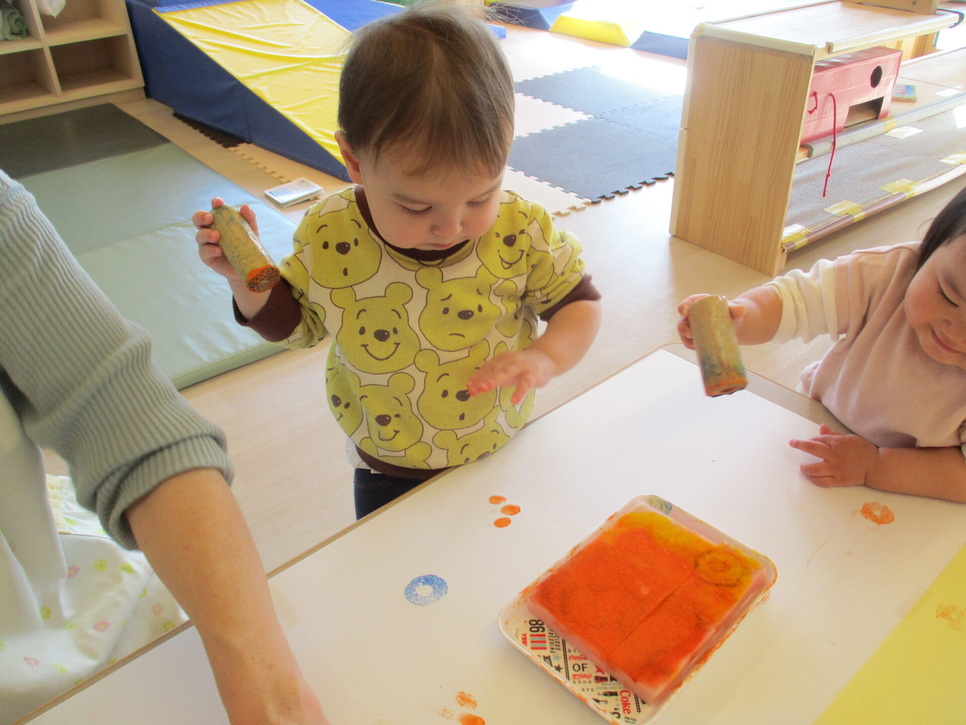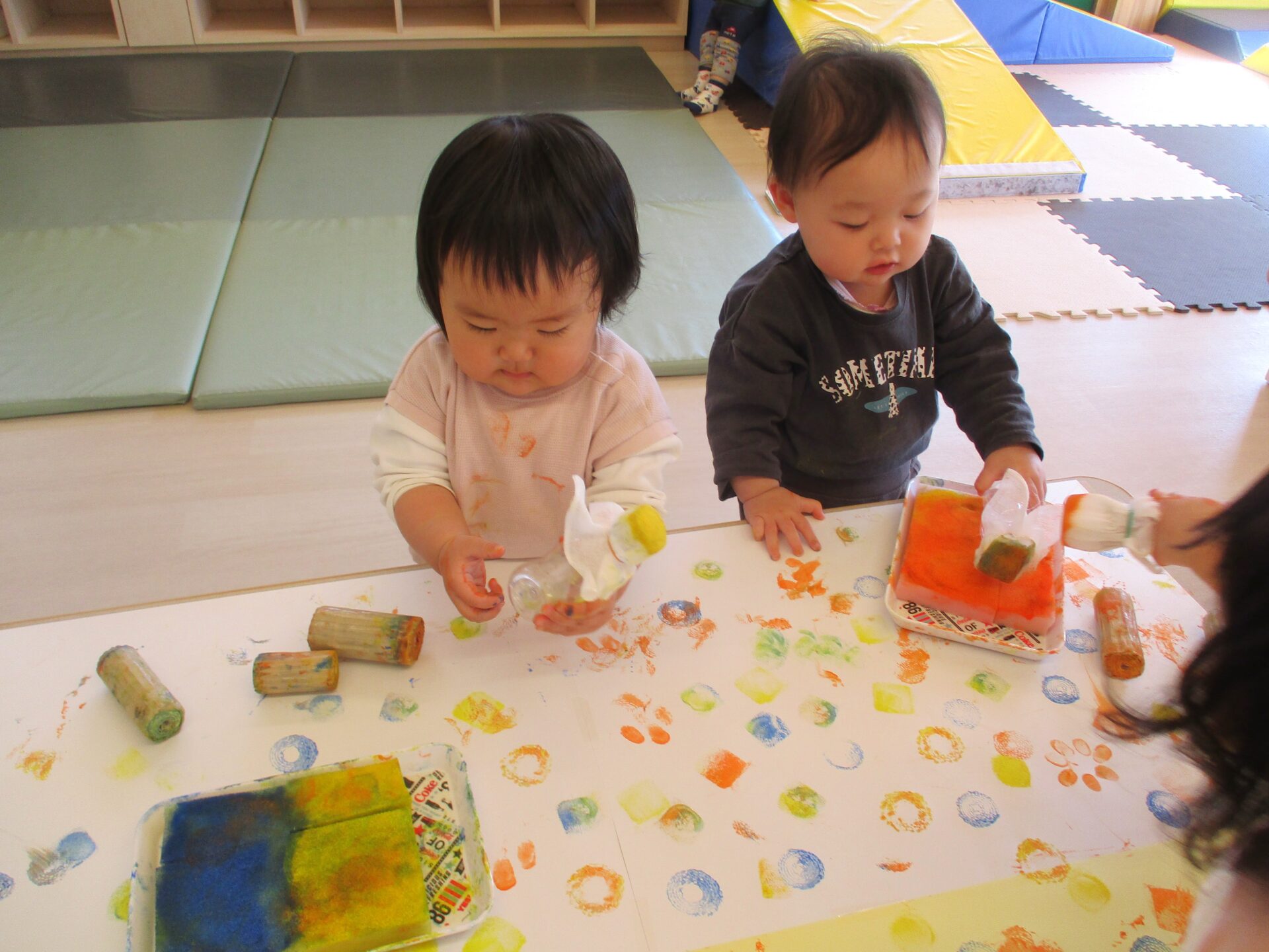 うみ組(0歳児)では、職員手作りのスタンプを使って、スタンプ遊びを楽しみました。