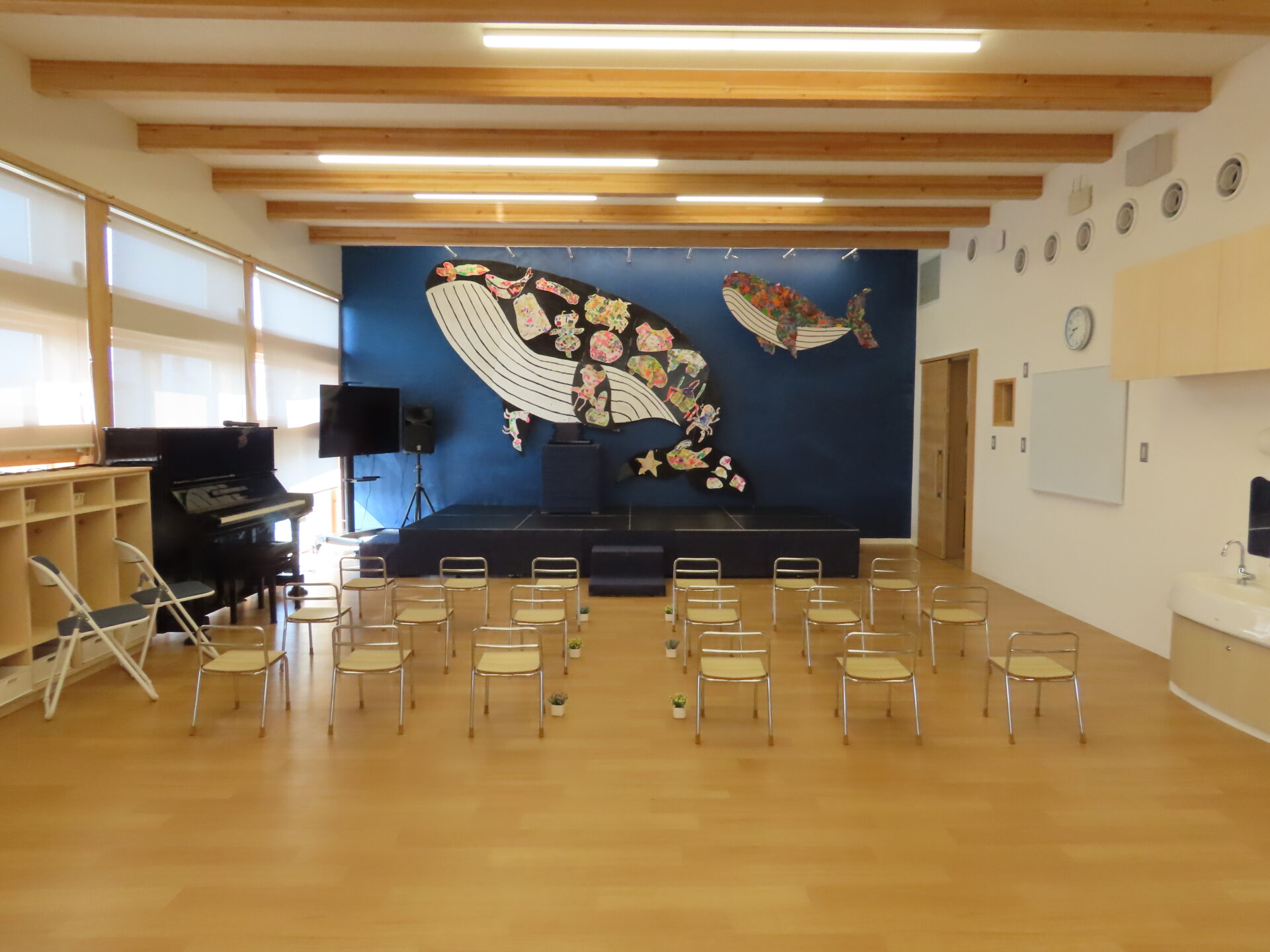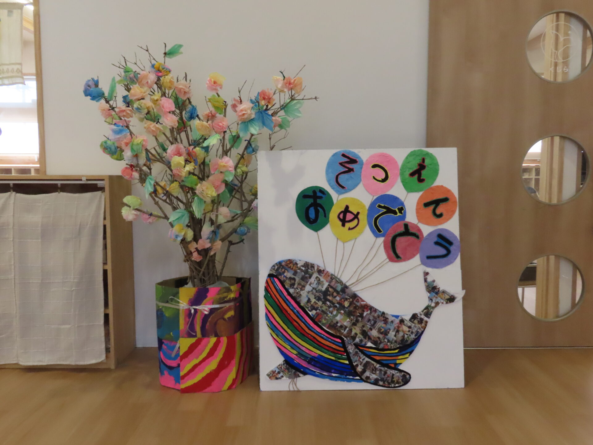 くじらの模様は夏のアートイベントで制作した親子作品です。今年度は背景の壁のペンキ塗りも親子で行い、5歳児親子の想い出いっぱいの共同作品になりました。