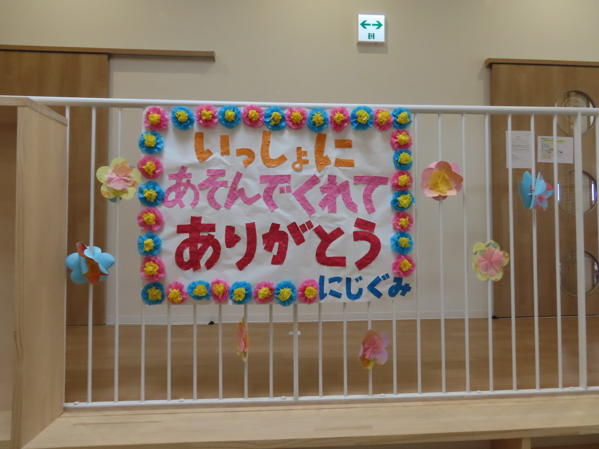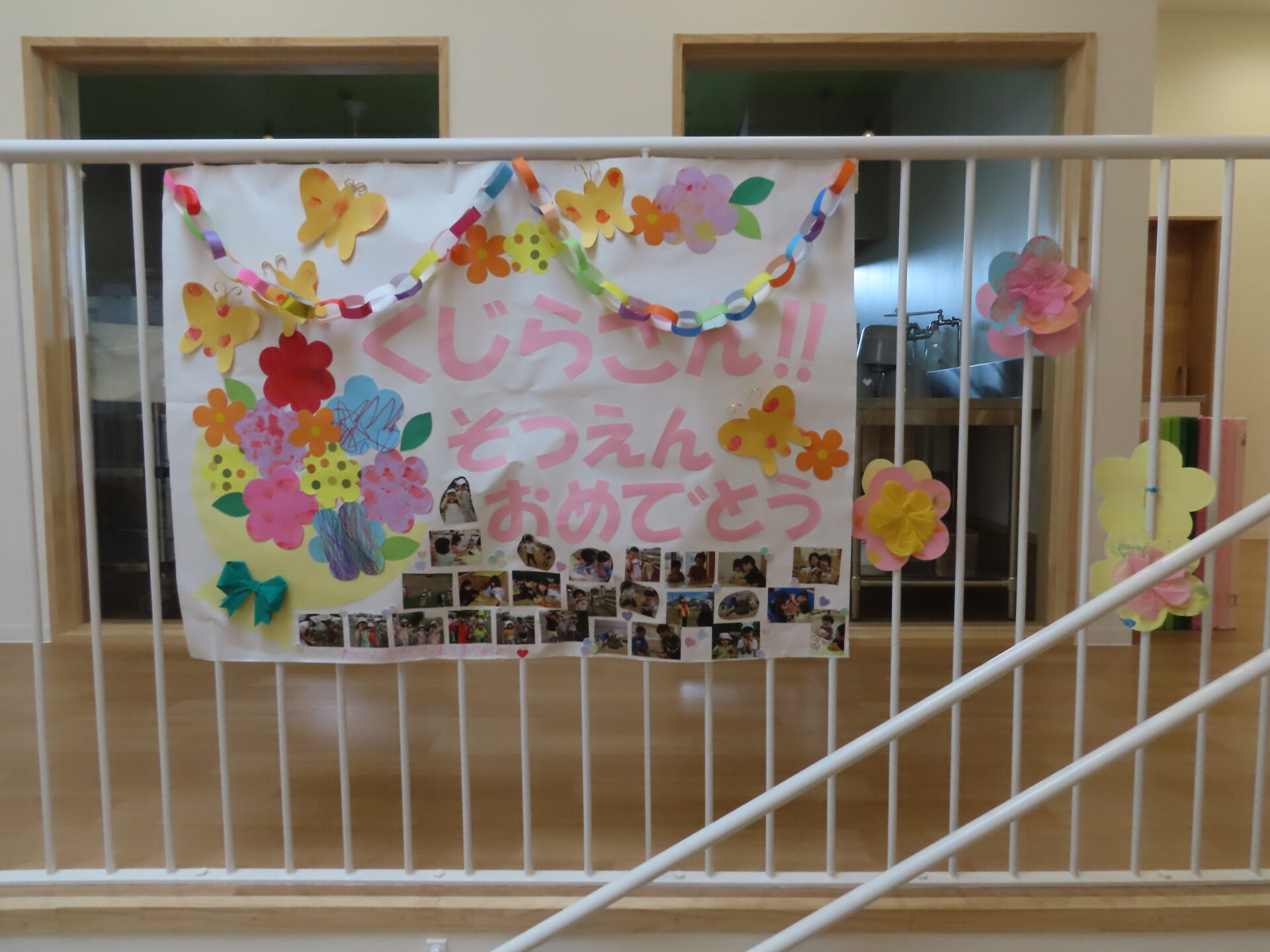 在園児からの祝福で彩られた階段を抜けると、お祝いメッセージが卒園児をお迎えします。