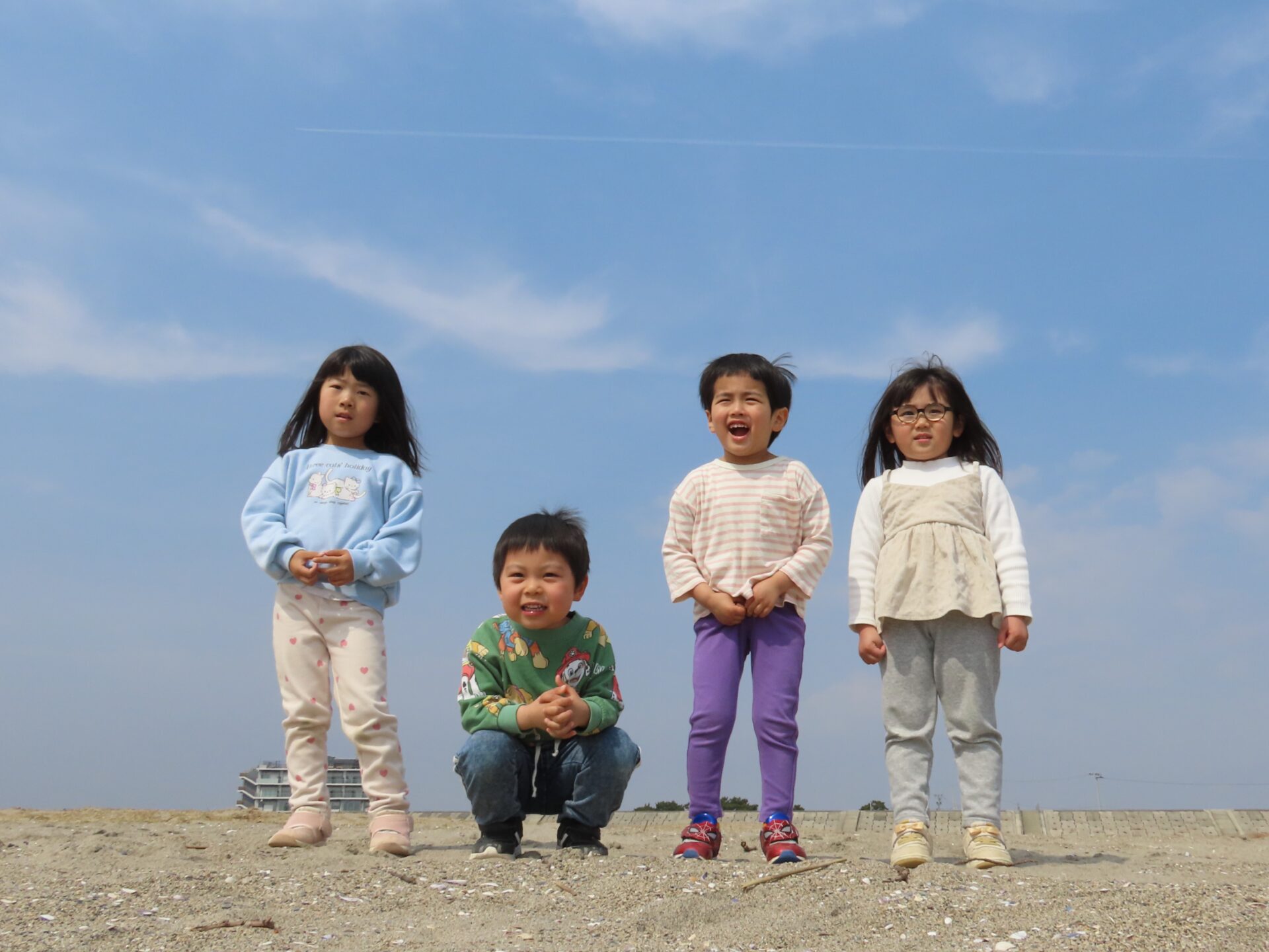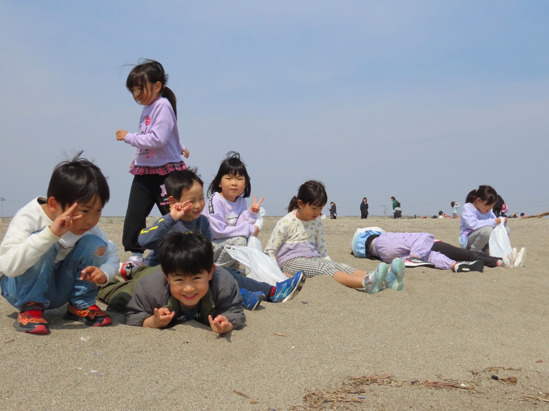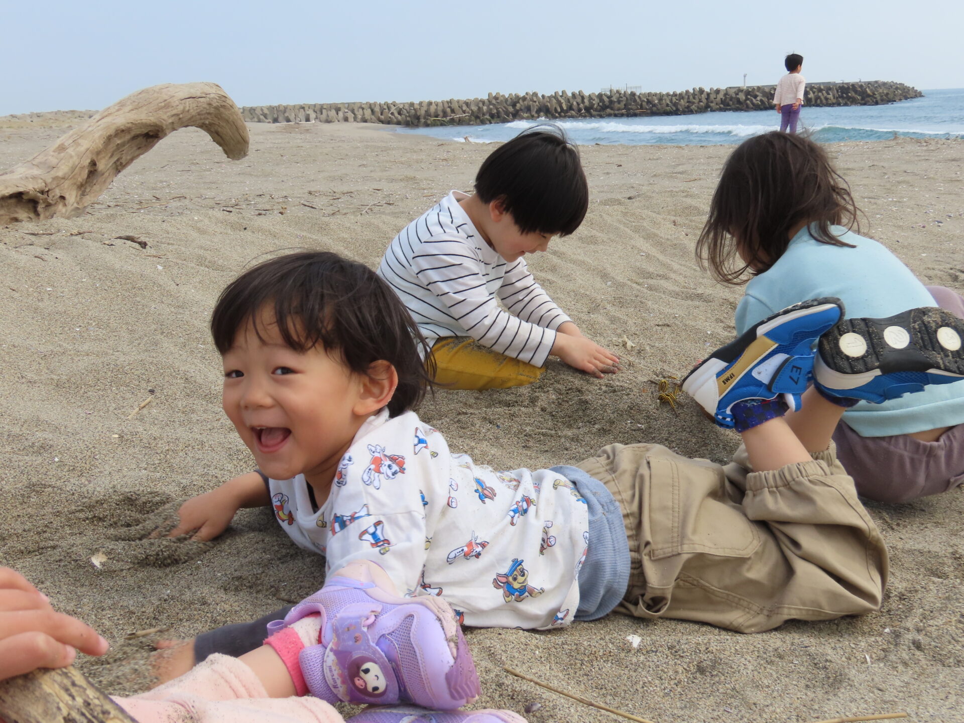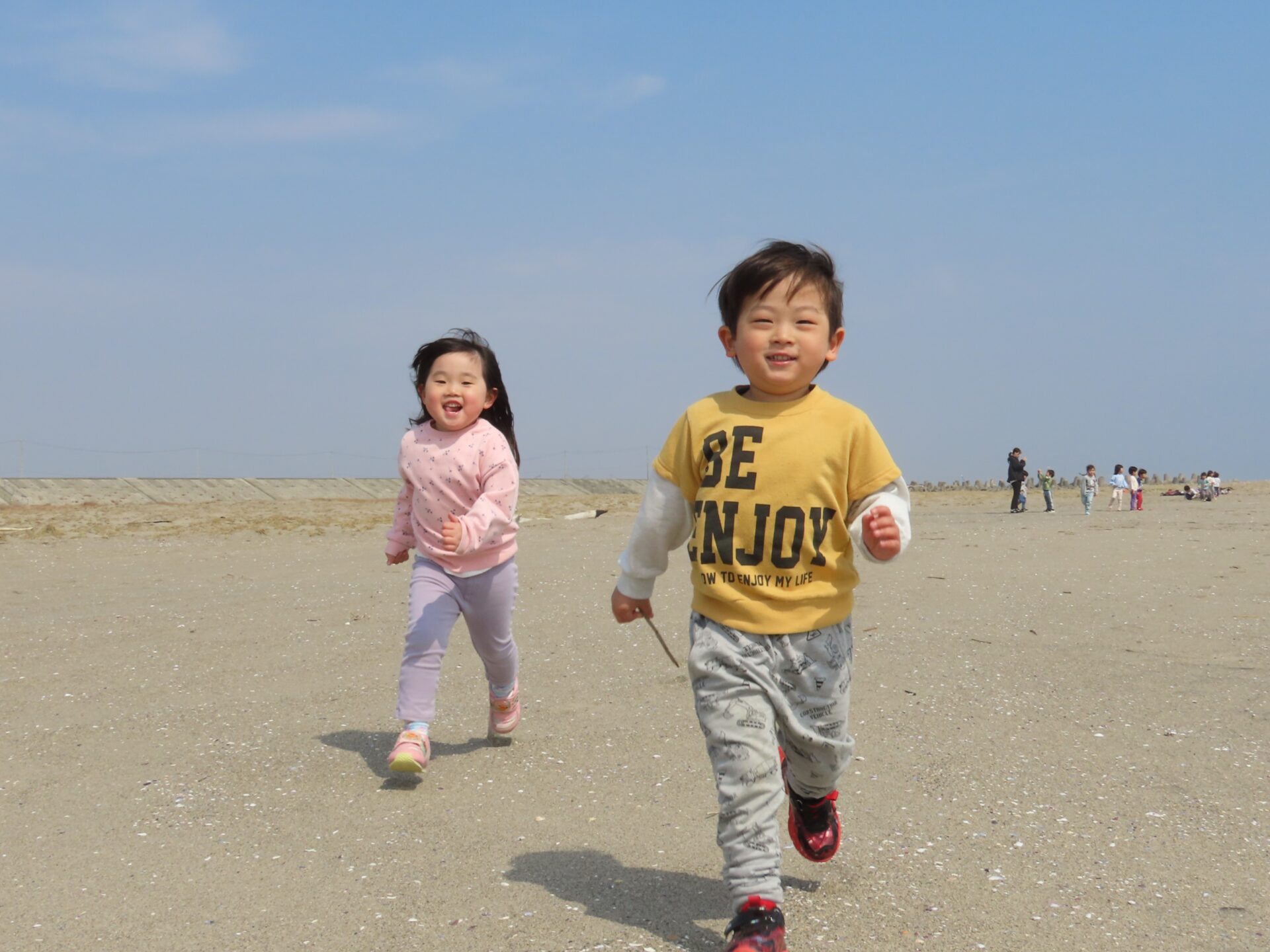 もうすぐ卒園する5歳児と一緒に「思い切り遊びたい!」と、にじ組(3歳児)とくじら組(5歳児)が閖上海岸散策に行ってきました。