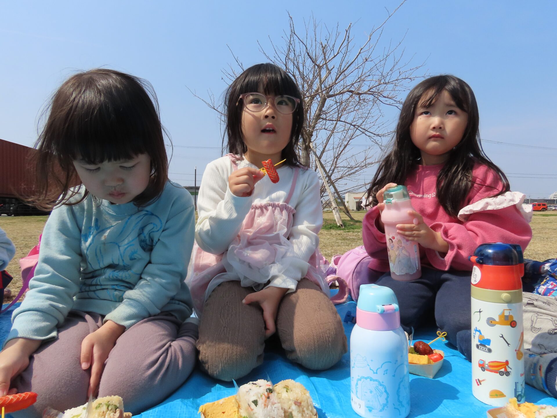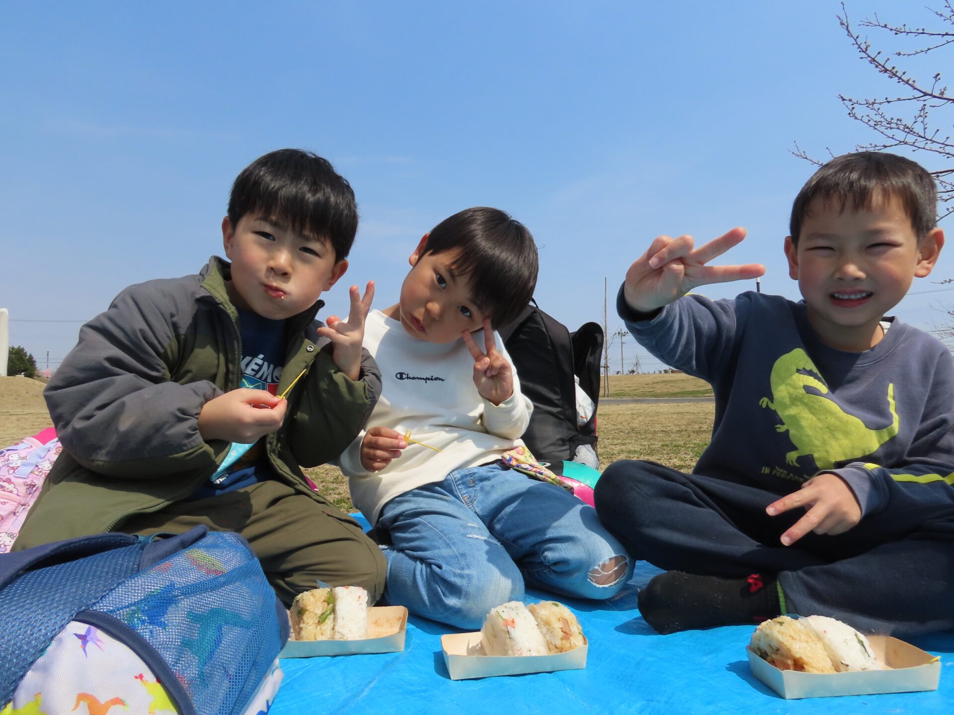 暖かい春の日差しの下でお楽しみのお弁当タイム。