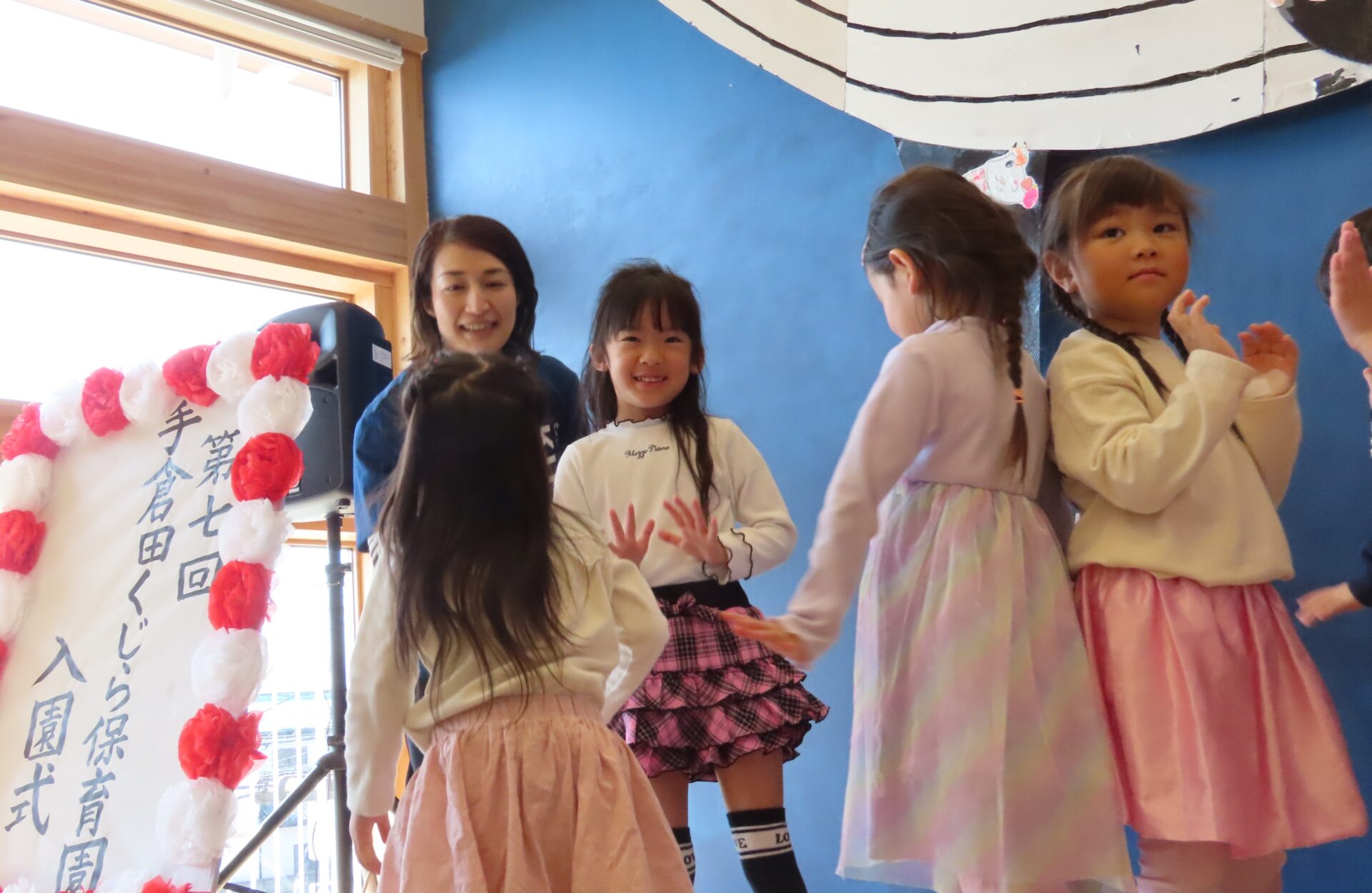 入園式に参加する在園児のこどもたちに「小さいお友だちが名前を呼ばれて、お返事するところを一緒に応援してね」と話していたところ、お姉さんたちから「踊りたい」「歌いたい」とリクエストがありました。