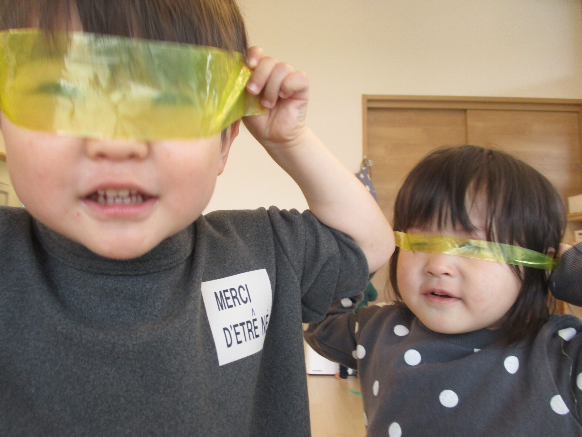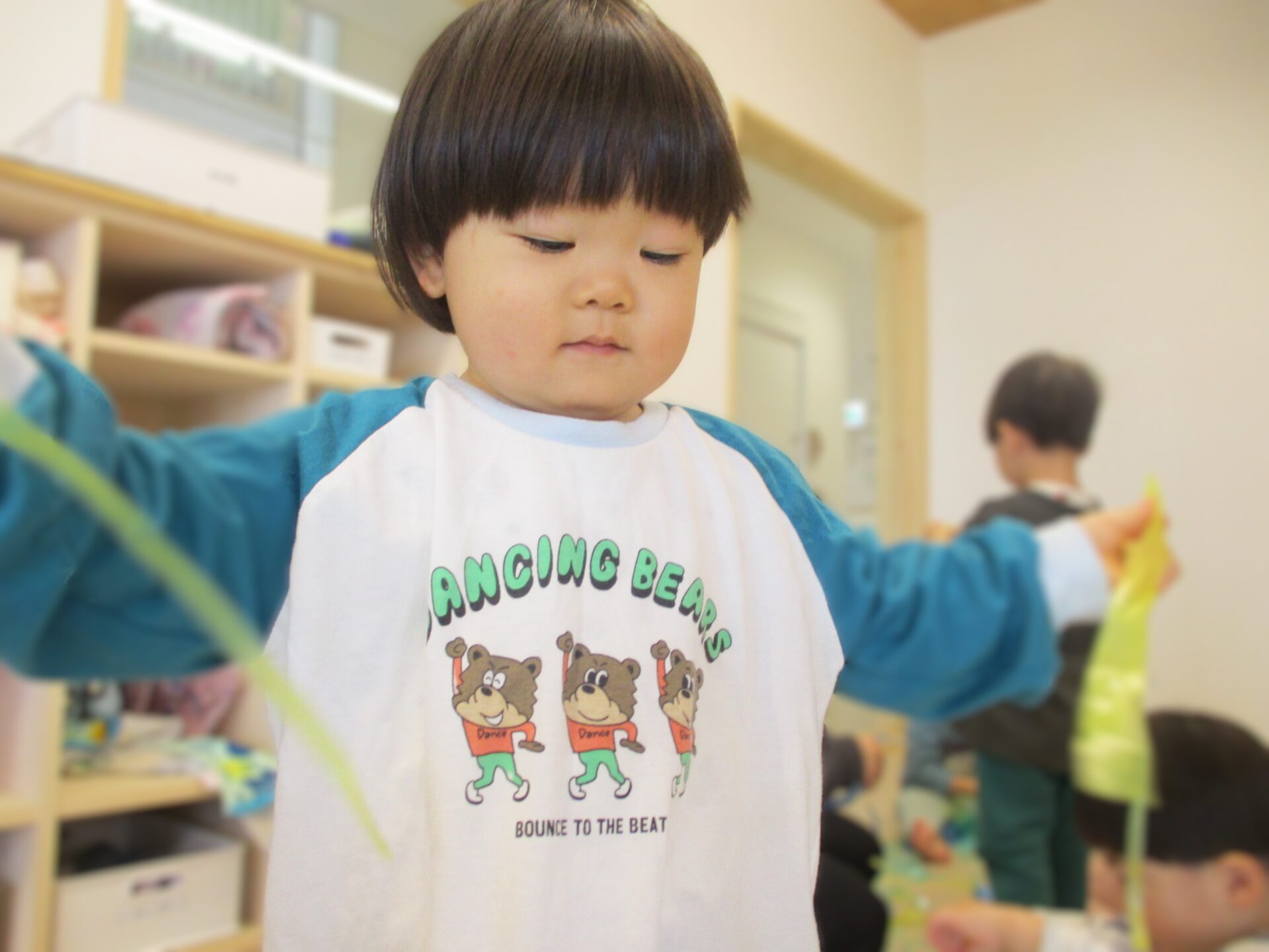 あめ組(2歳児)のこどもたちがスズランテープを使って遊んでいます。