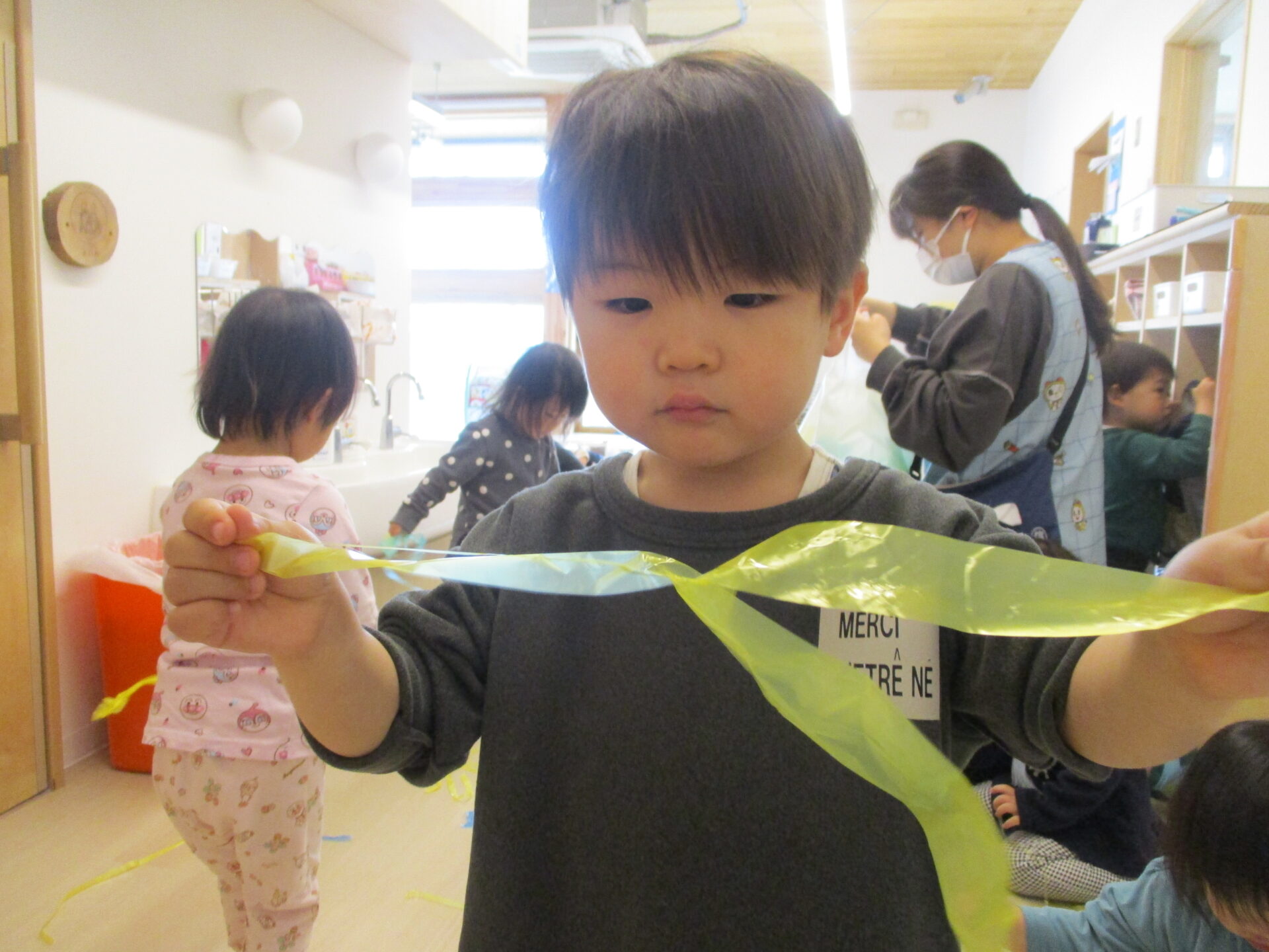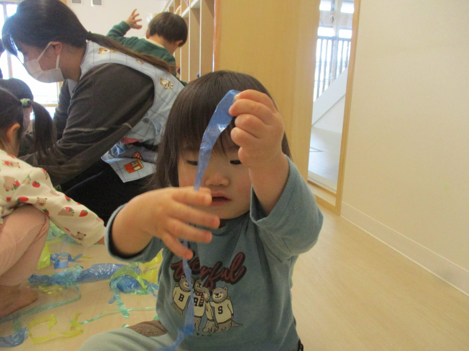 薄いスズランテープを指先でつまんで裂いたり、細長くなったスズランテープを上に投げてヒラヒラさせたり・・・、思い思いに感触を楽しみます。