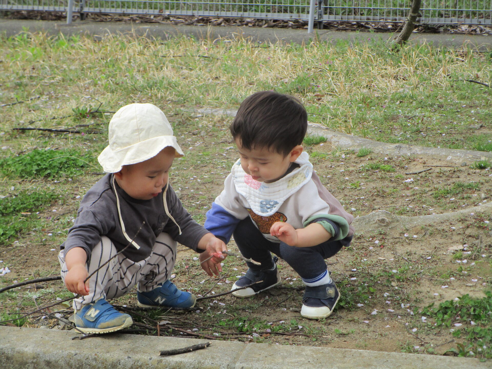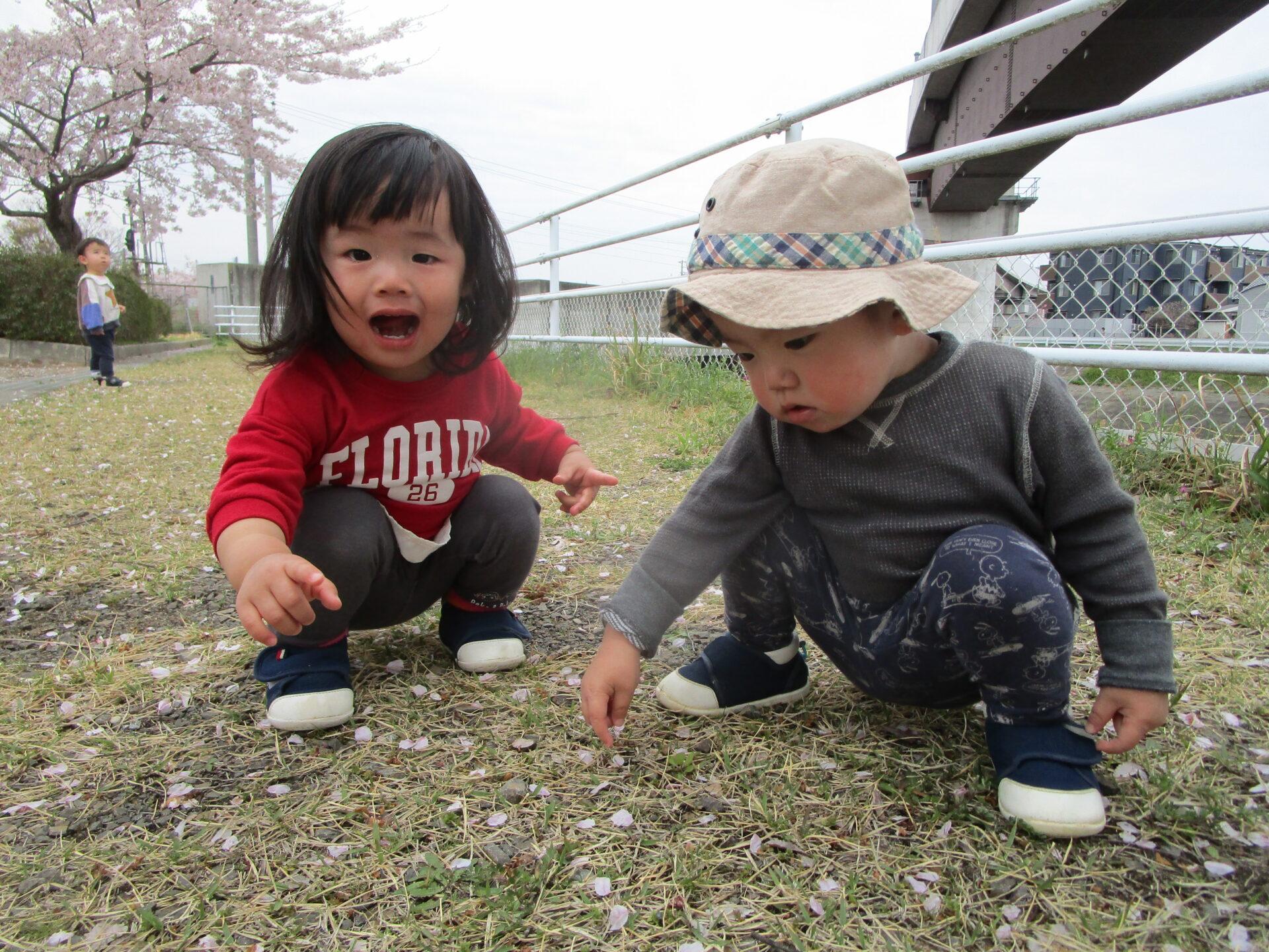花びらをつまんだり、小枝を拾ったり、春のお散歩はお楽しみがいっぱい!