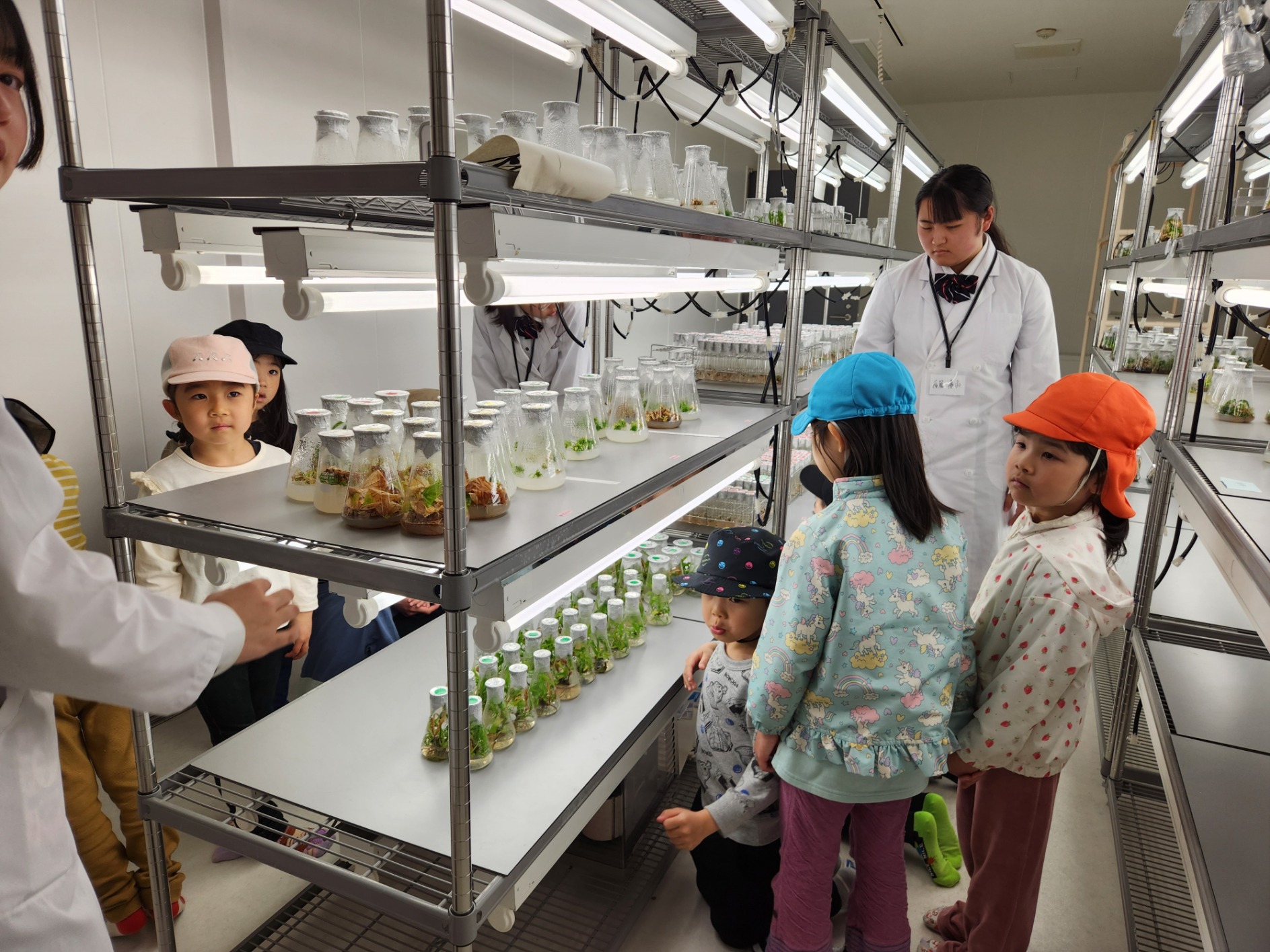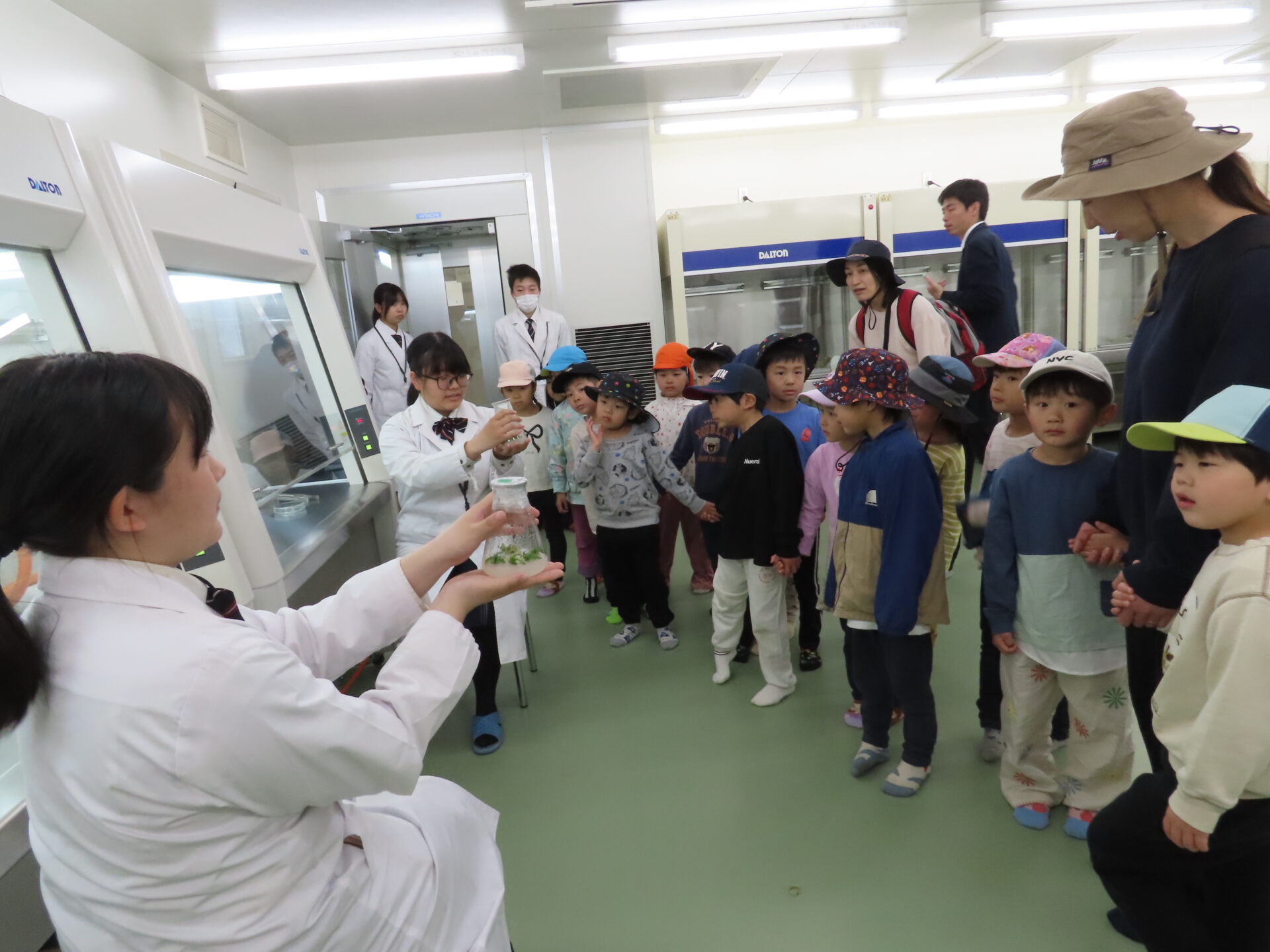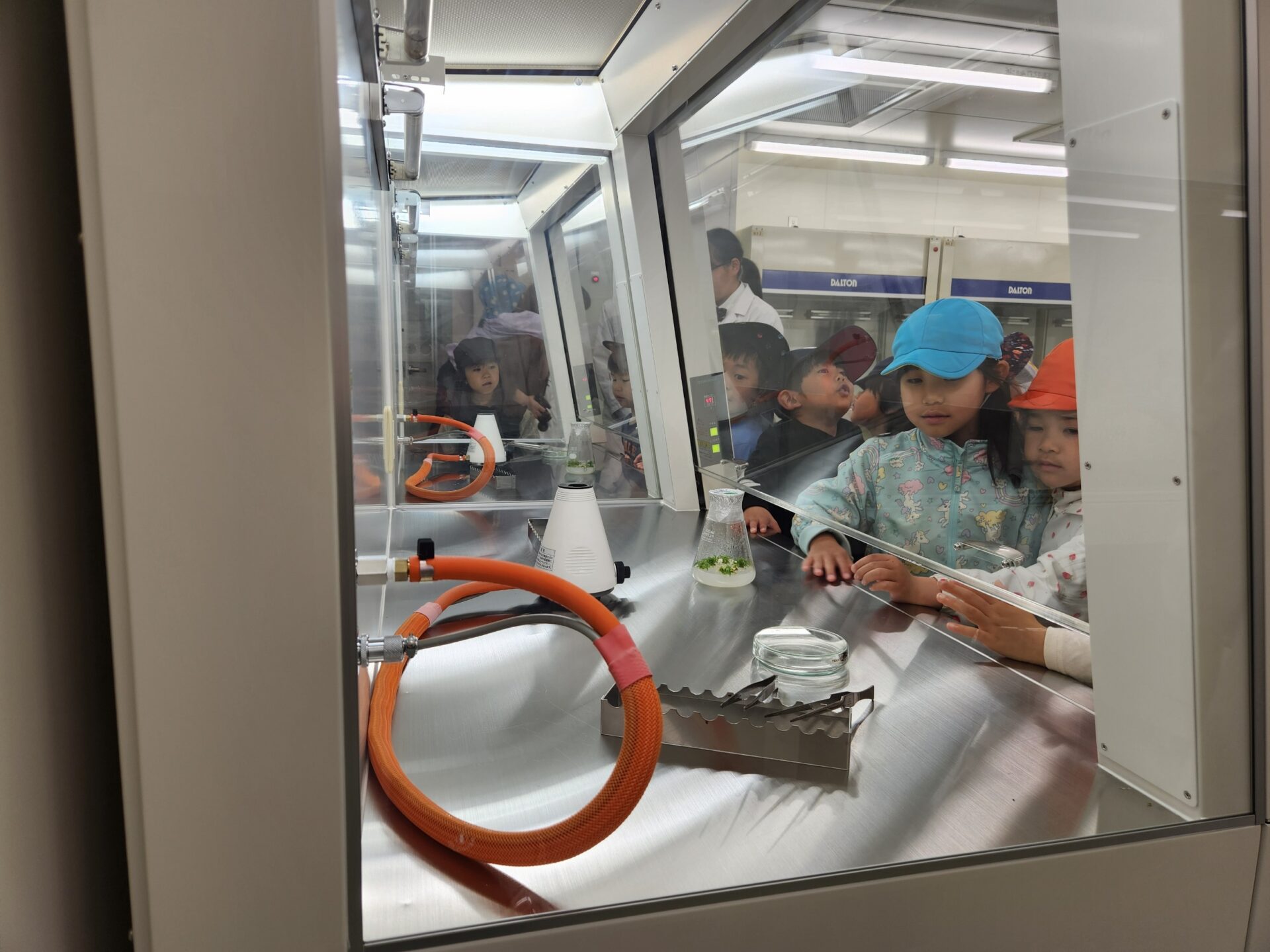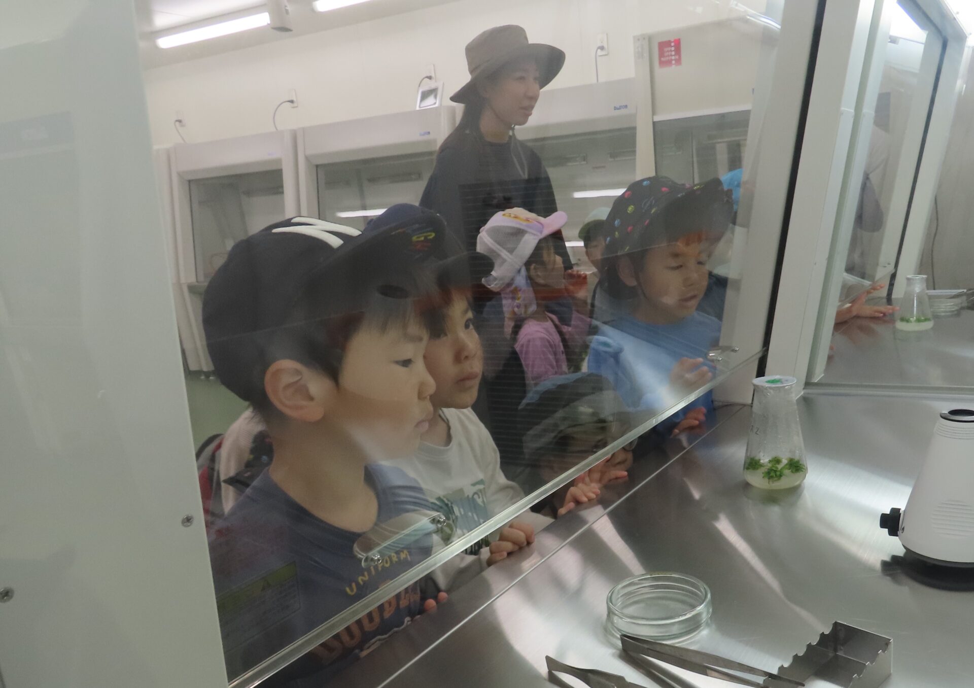 園に植樹していただいた「玉夢桜」を培養した場所は、無菌状態にするために絶えず風が吹き出しており、こどもたちは手をかざして確認していました。