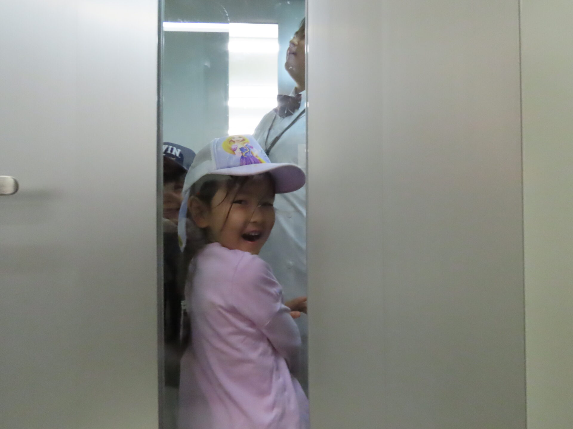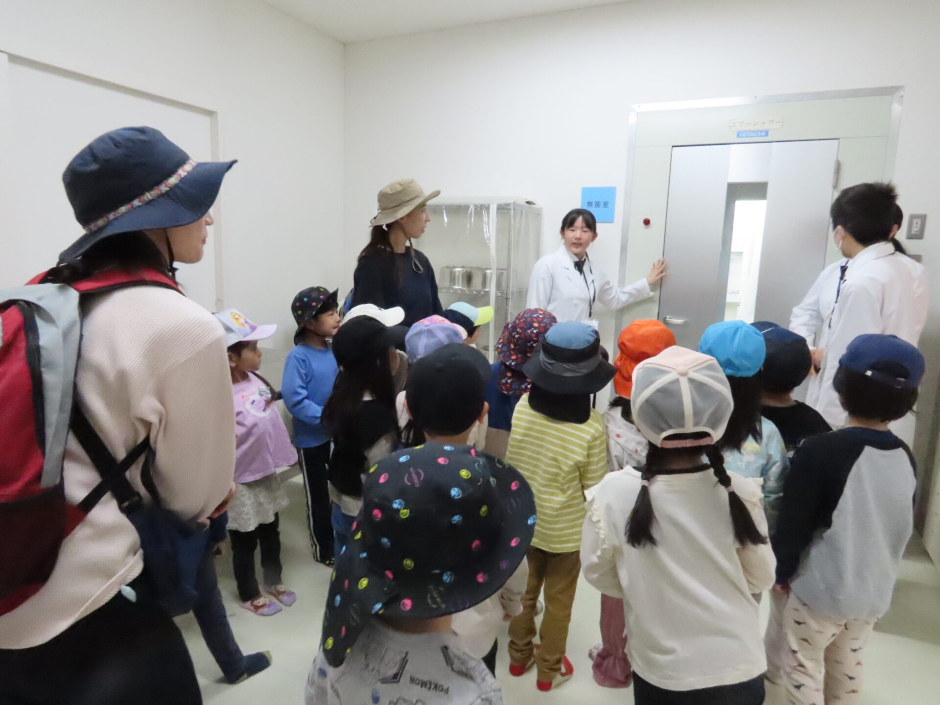 次に案内していただいた場所は「無菌室」です。入室するために2人1組でエアーシャワーを浴びてから入室します。順番を待つ時間がアトラクションを待つような気持ちで、こどもたちはワクワクしていました。