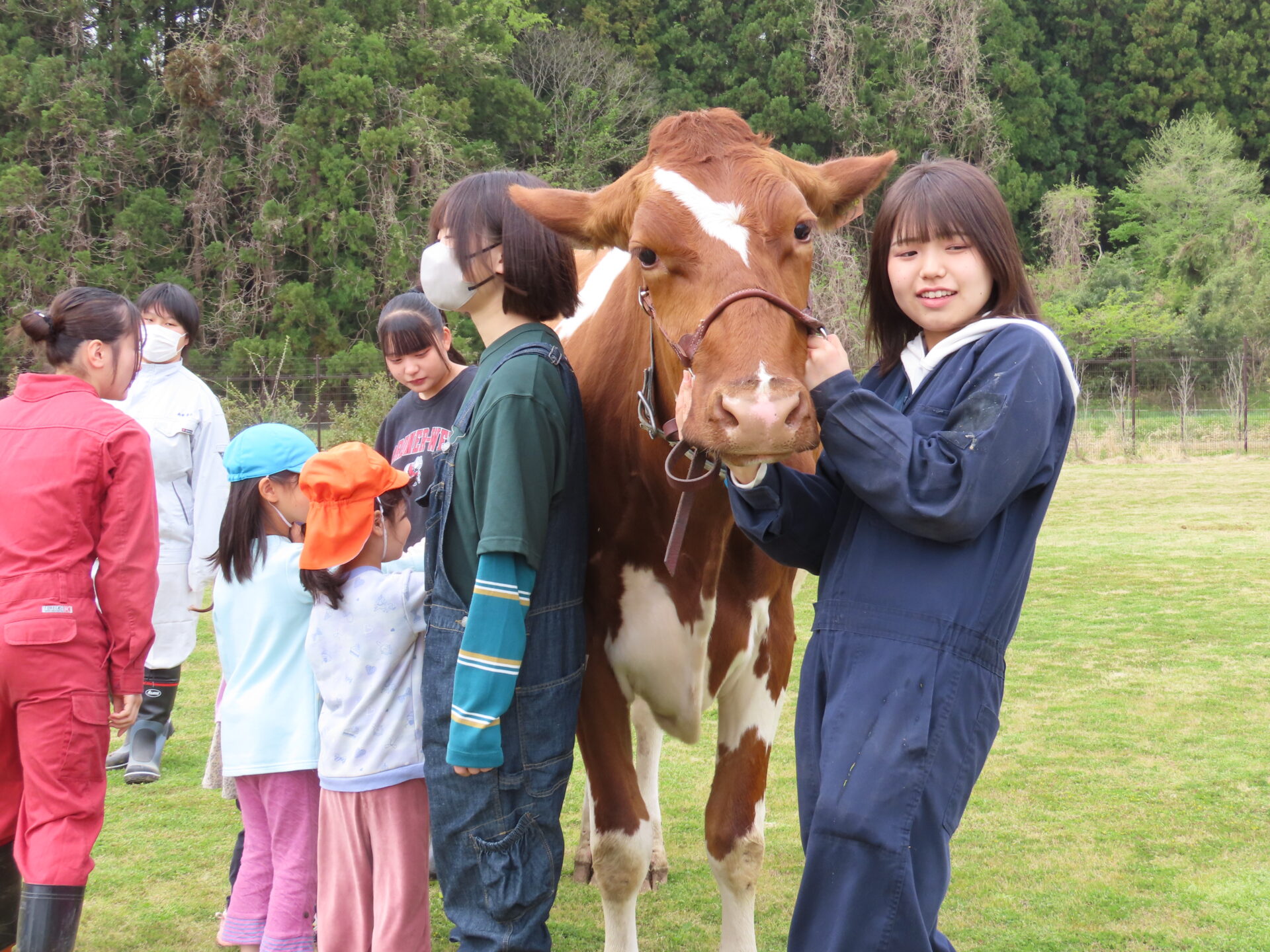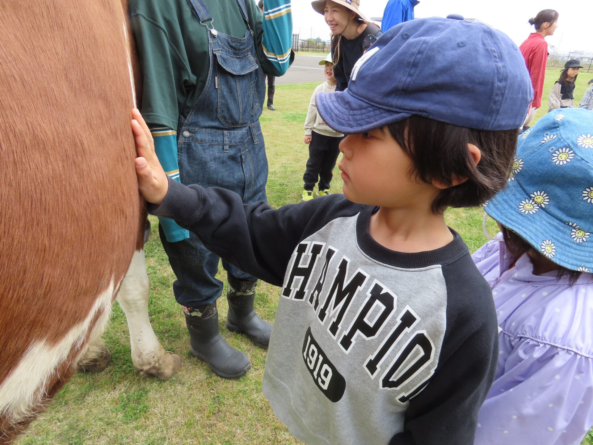 こどもたちより大きな動物を間近で観察できる機会は少ないため、広い芝生の上を悠々と歩く牛たちの姿を、こどもたちは興味津々で見つめていました。