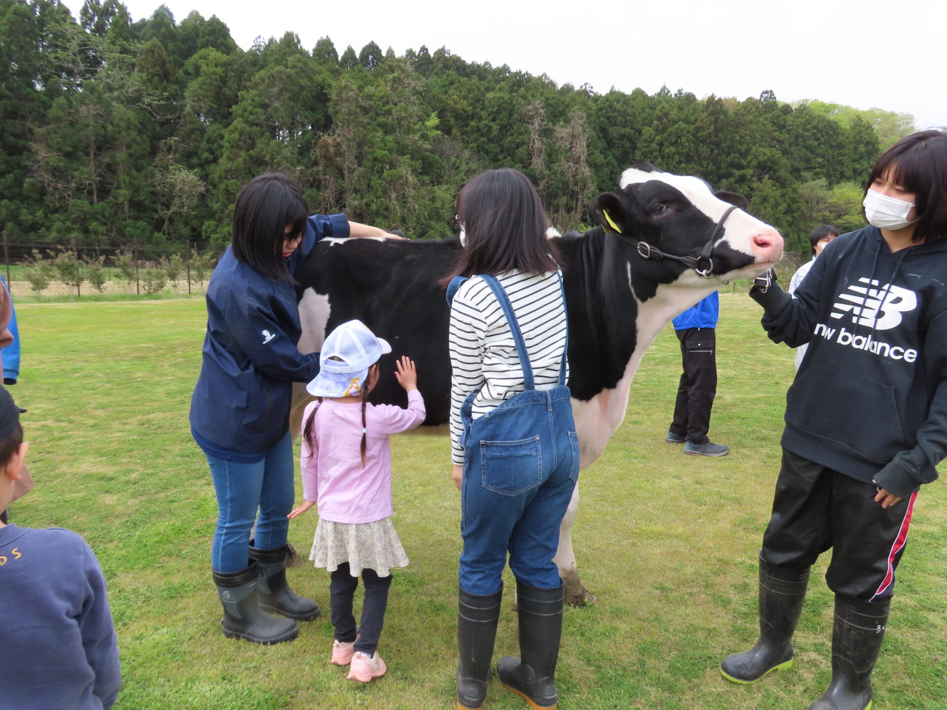 牛部の学生さんたちに誘導していただき、ひとりずつ、牛のおなかを触る体験をしました。