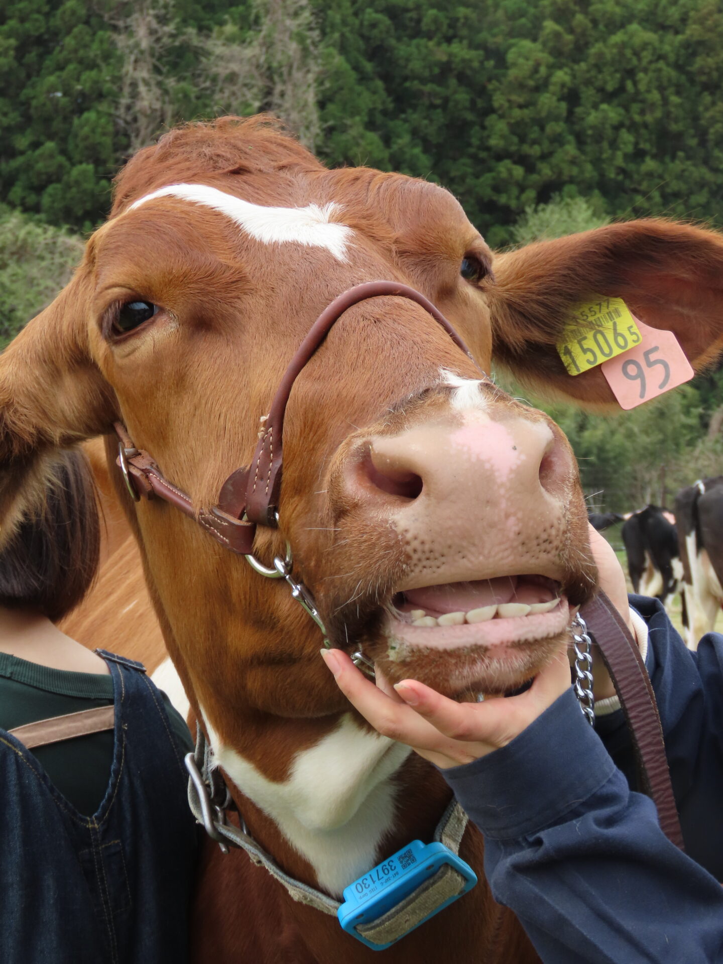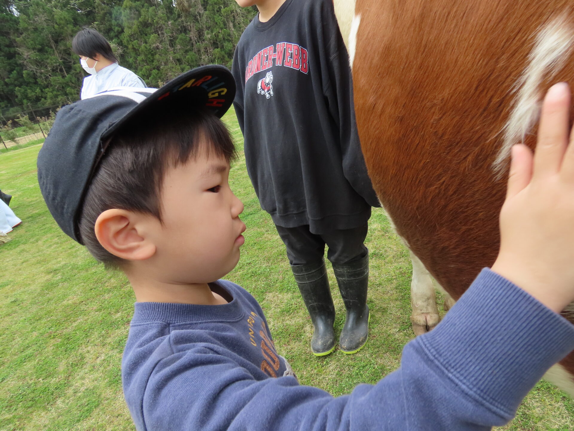 くじら組(5歳児)のこどもたちが訪問した宮城県農業高等学校では、牛部の学生さんたちのご厚意で、牛の見学とふれあい体験もさせていただきました。