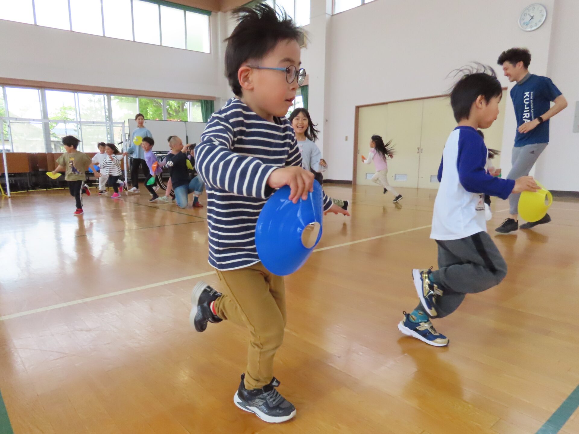 それから、コーナーコーンを持ってBGMと共に走り、BGM停止でお友だちのコーナーコーンと取り換えっこをする運動遊びを行いました。