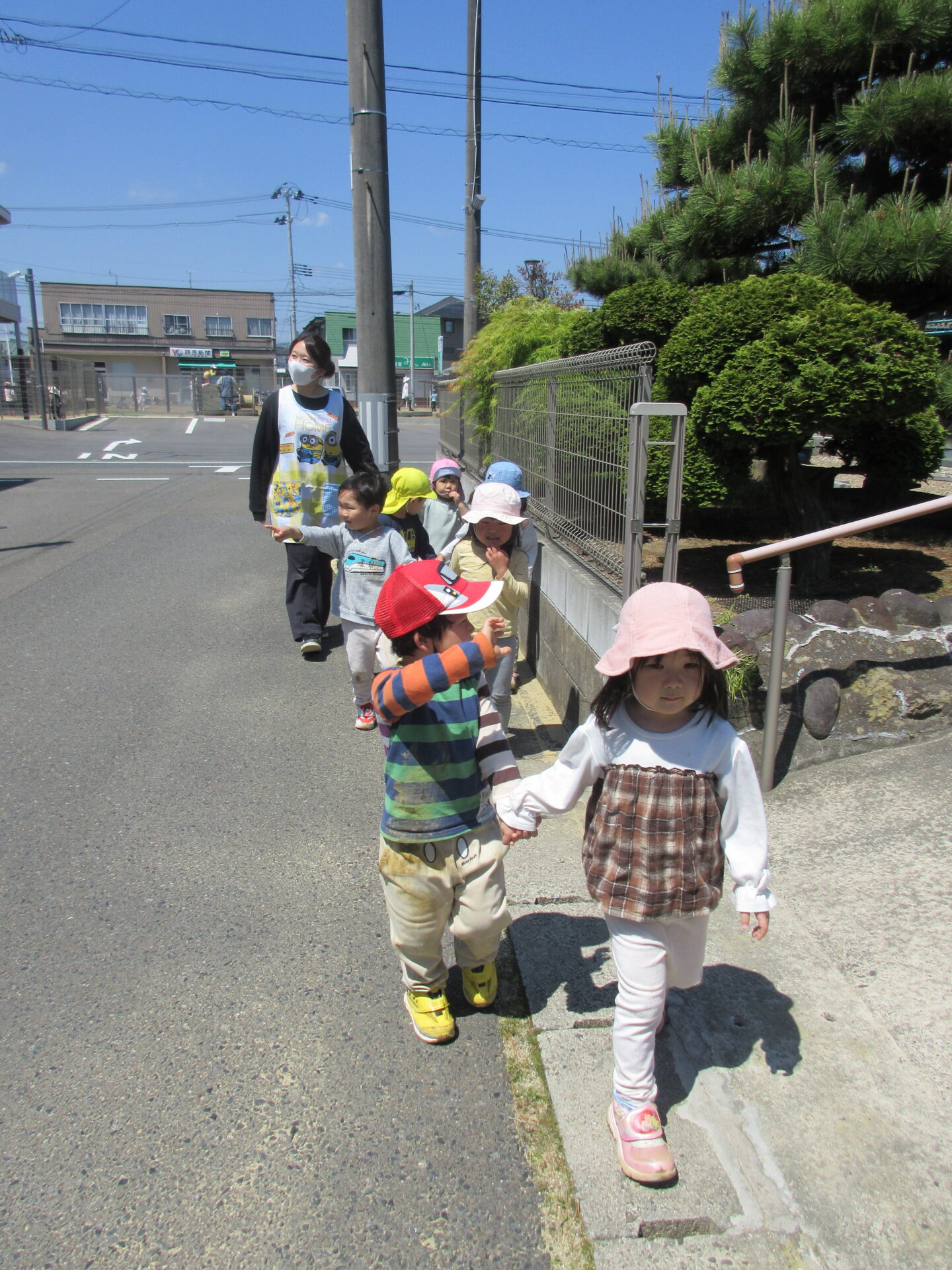 にじ組(3歳児)では、こどもたちの遊びたい遊具がある公園へお散歩に行ってきました。