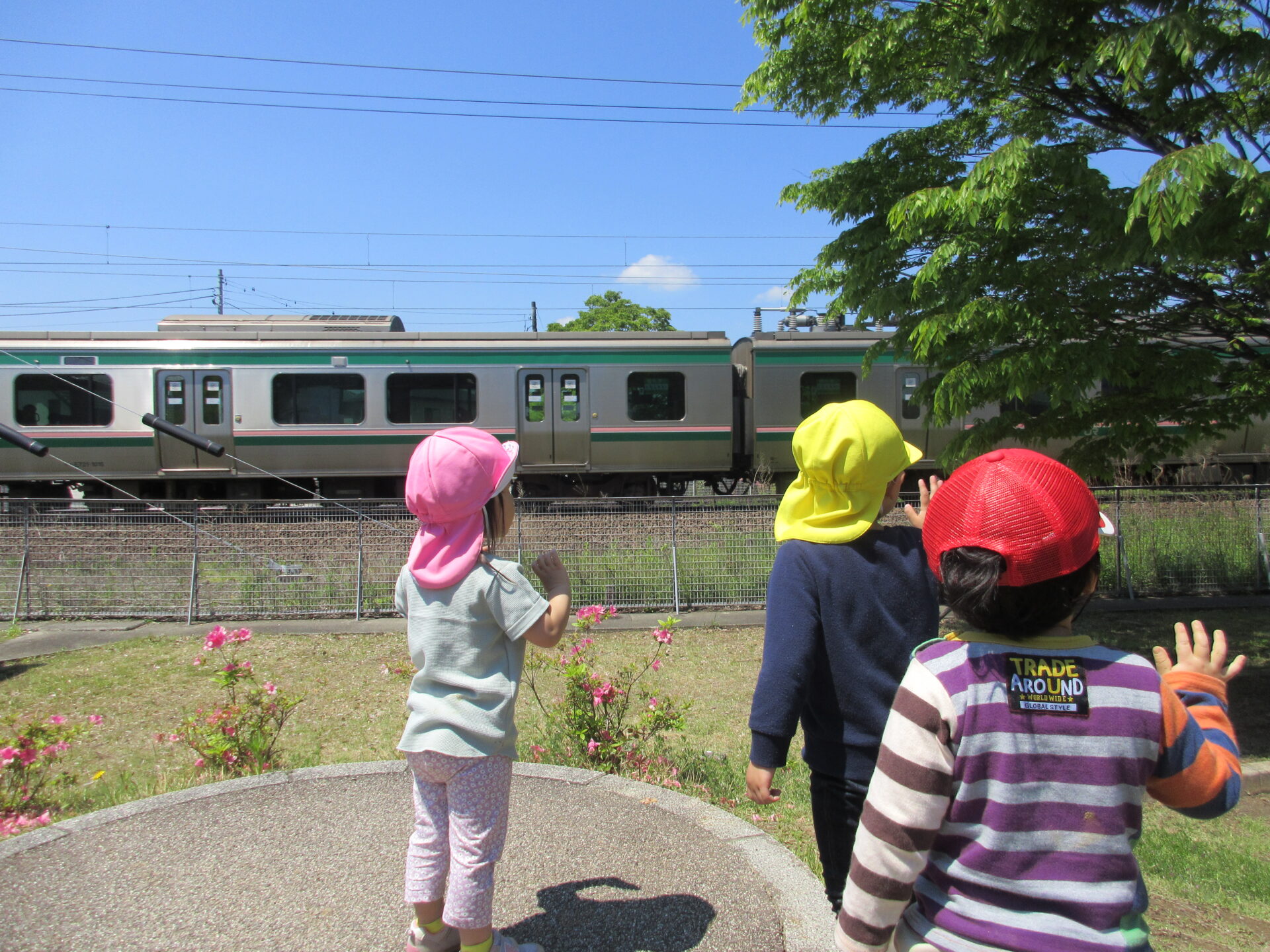 目の前を走る電車に夢中になり、バイバイしていた手も止まってしまうほど見入っていました。