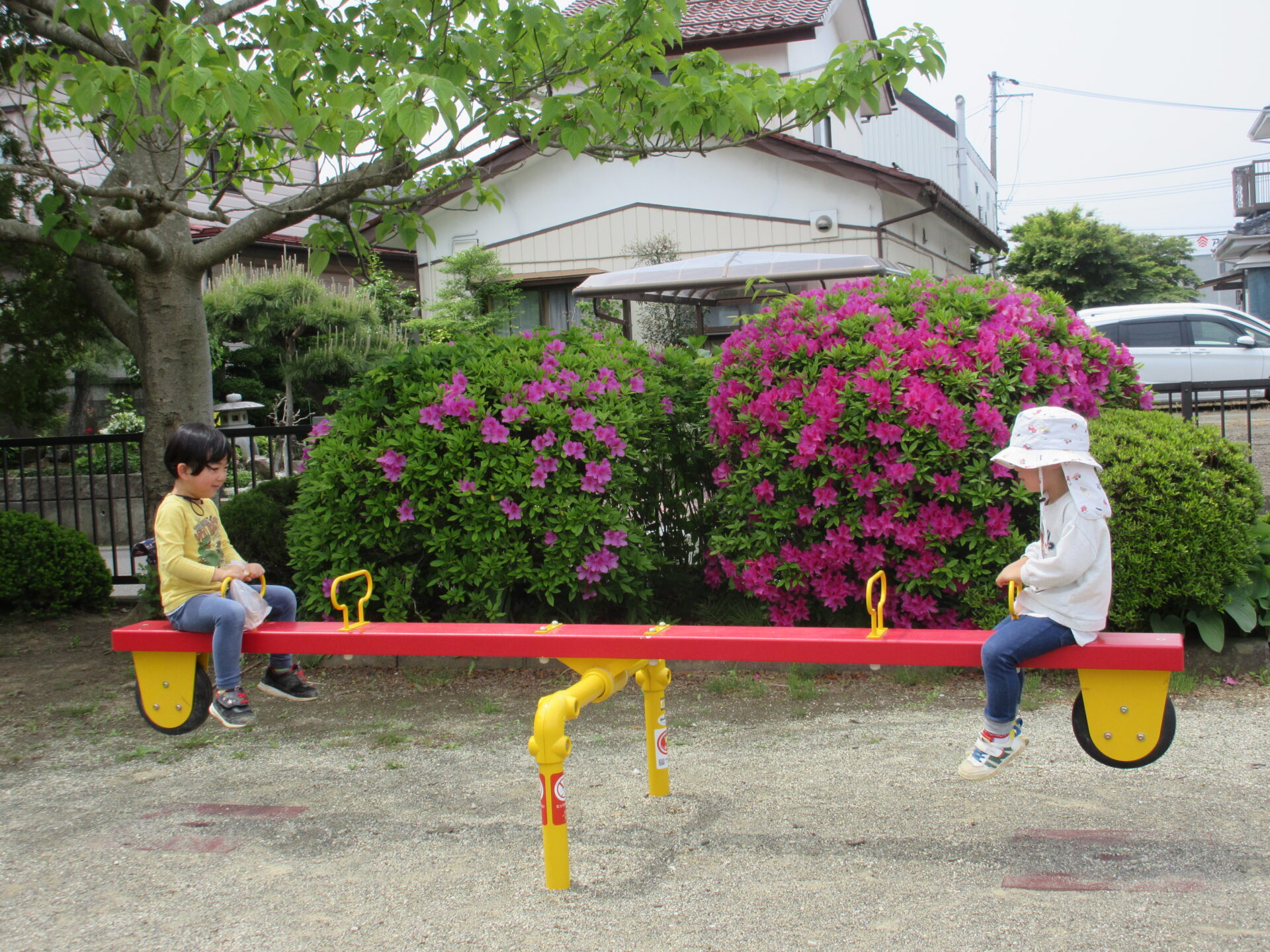シーソーに挑戦するBくんとCくん、バランスよく止まったことが面白くてケラケラ笑っていました。