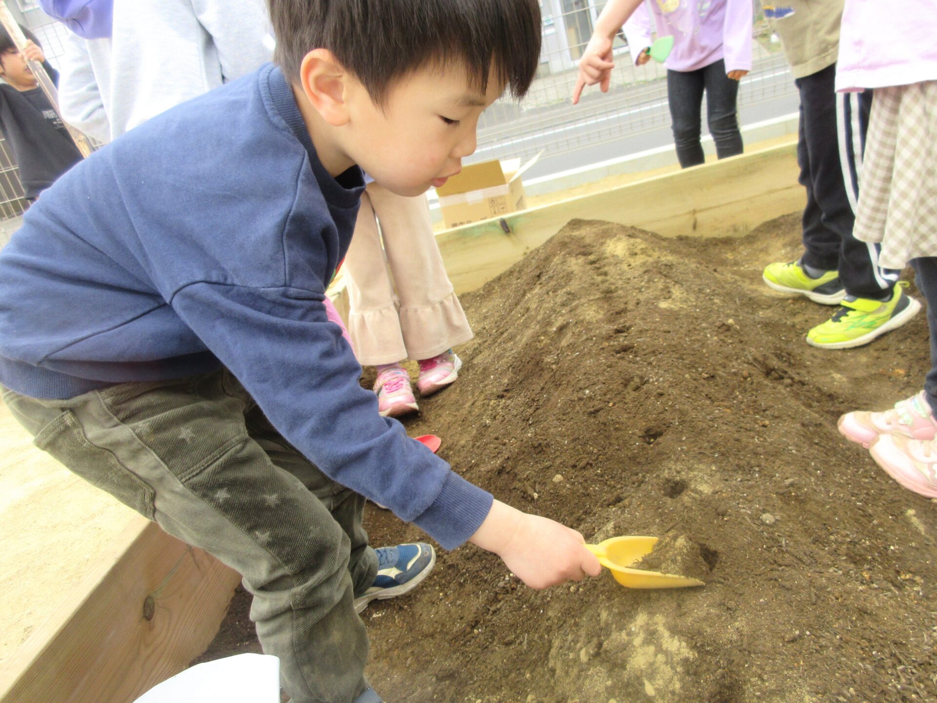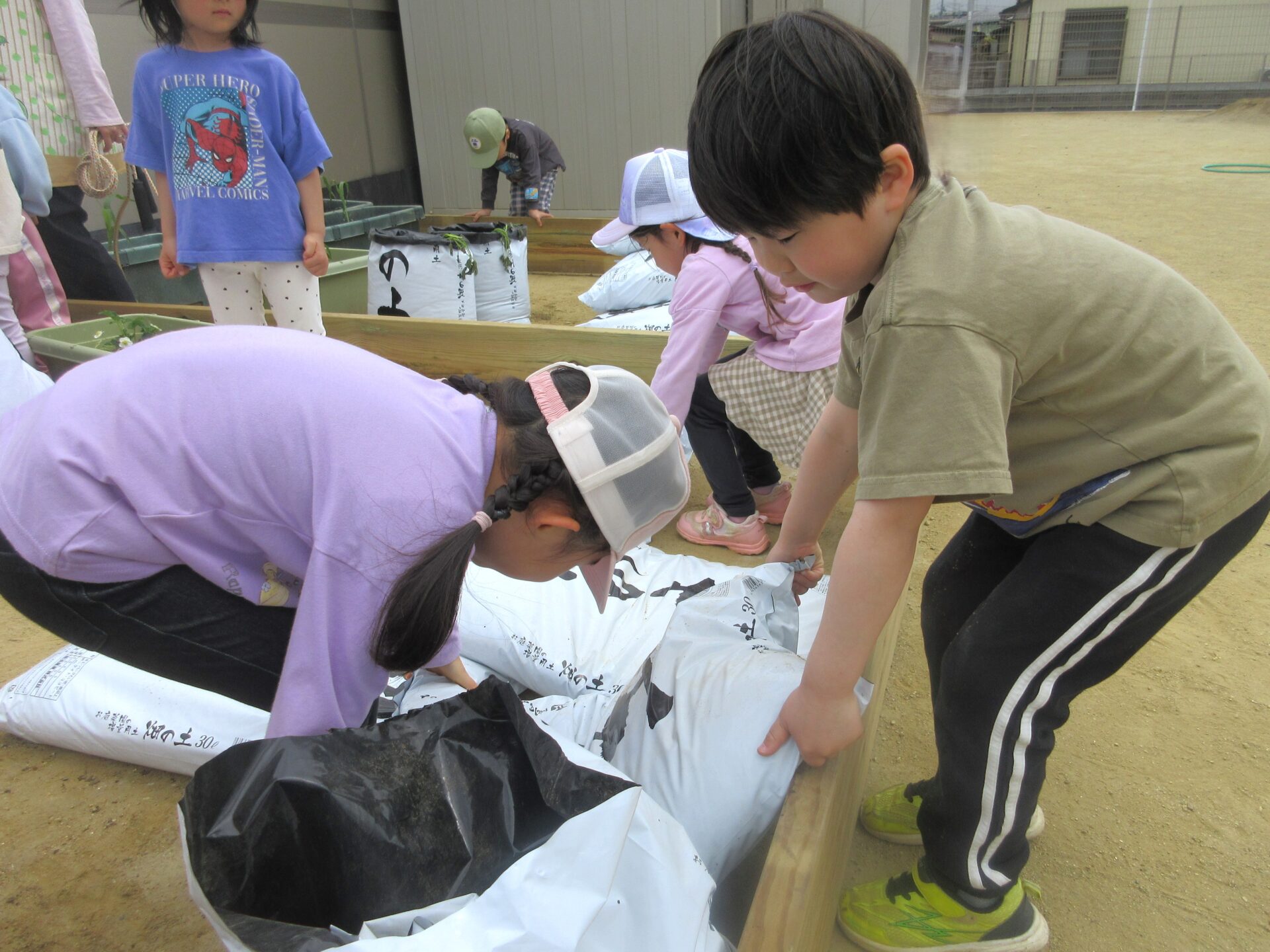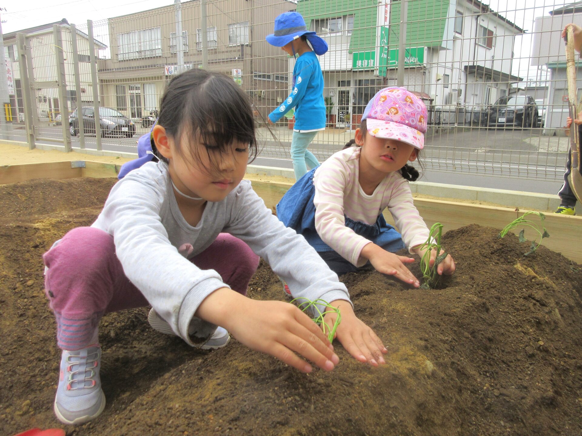 『おおきくなるのが楽しみだね』と友だちや保育者と話しながら植えていきます。