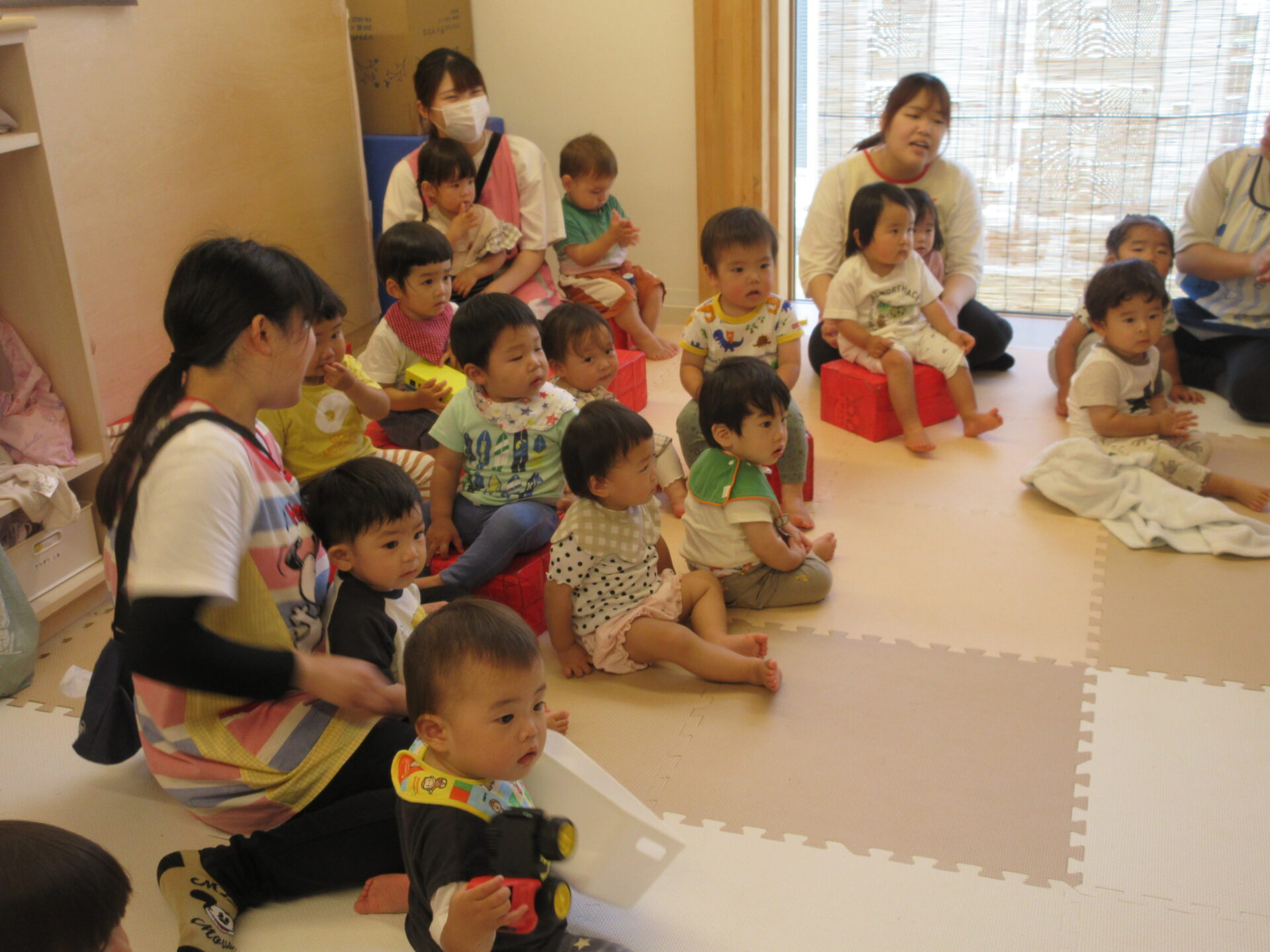 だいち組は、『なにがはじまるんだろう』と少し緊張した様子が見られながらも歌を聞いています。