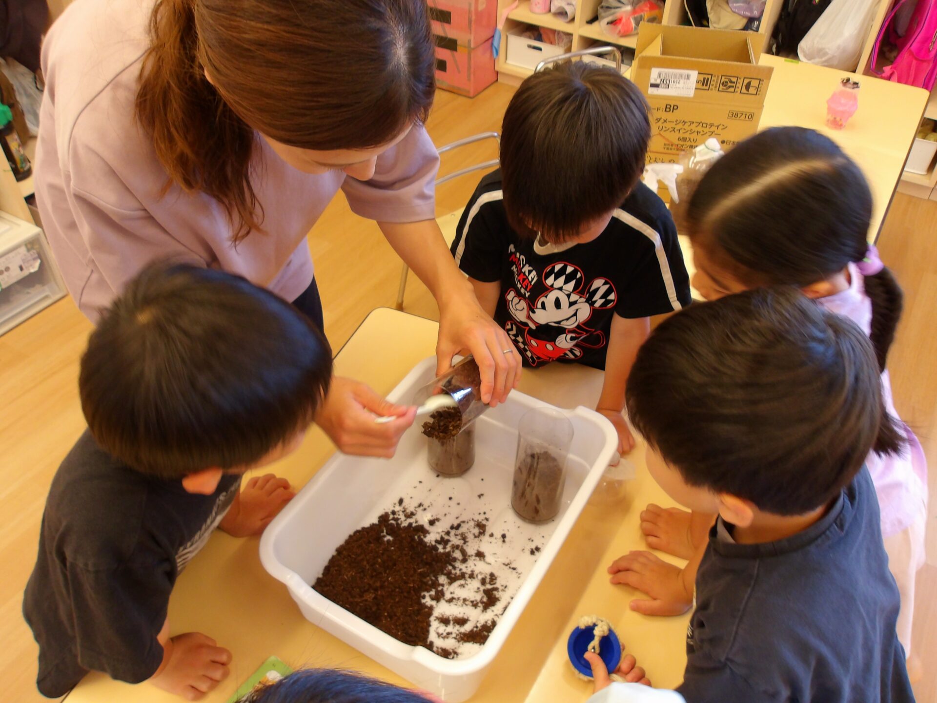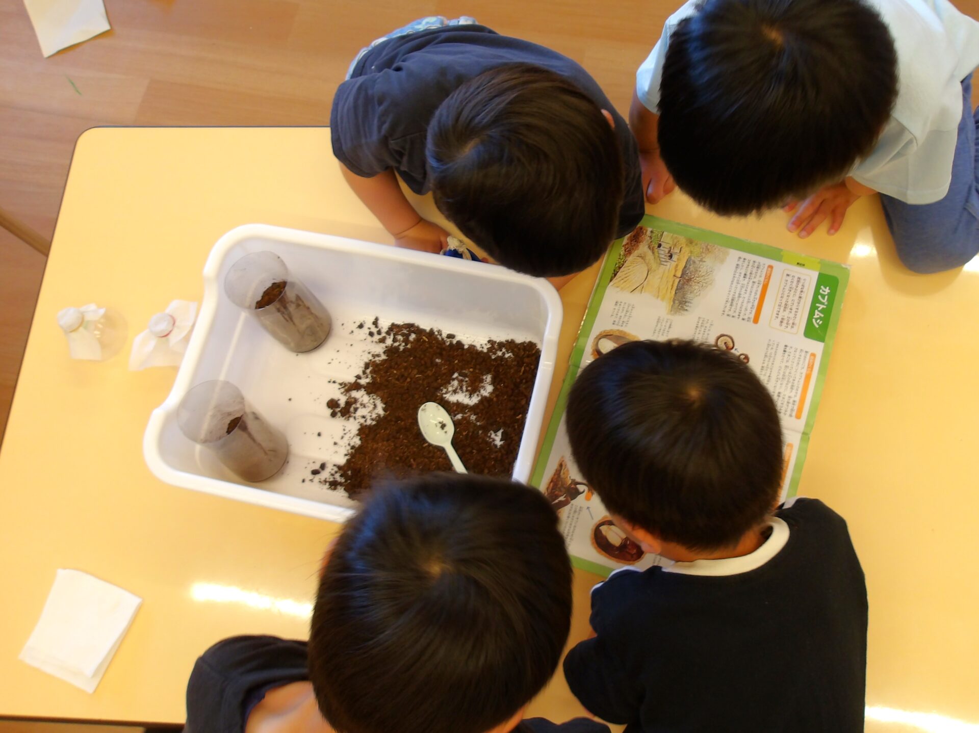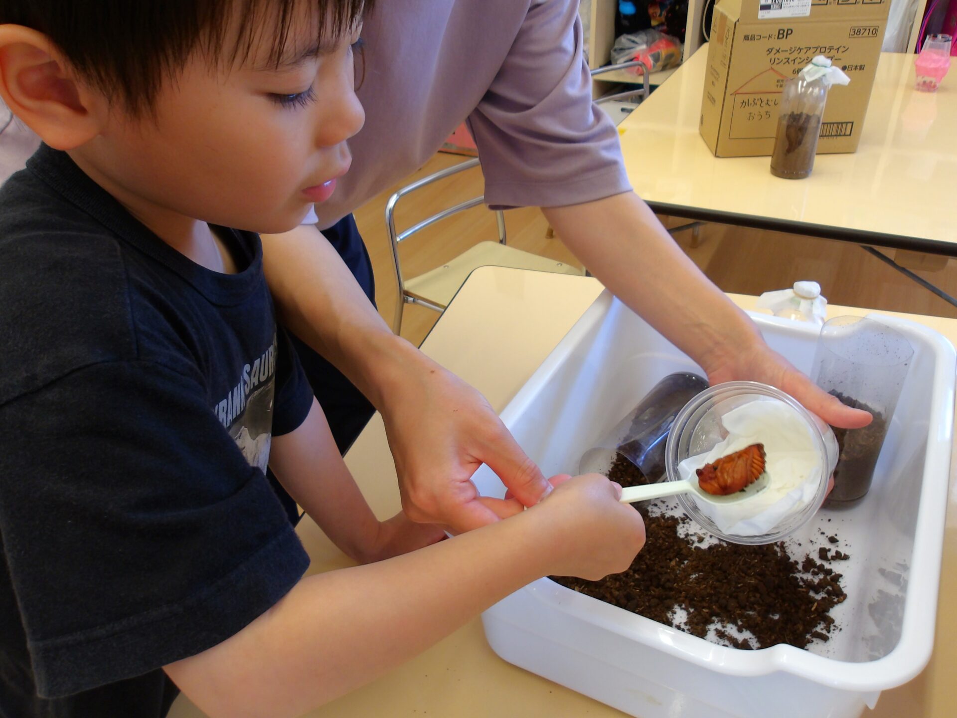 蛹(さなぎ)の姿で動くかぶとむしに驚きつつも、落とさないように慎重に運びます。