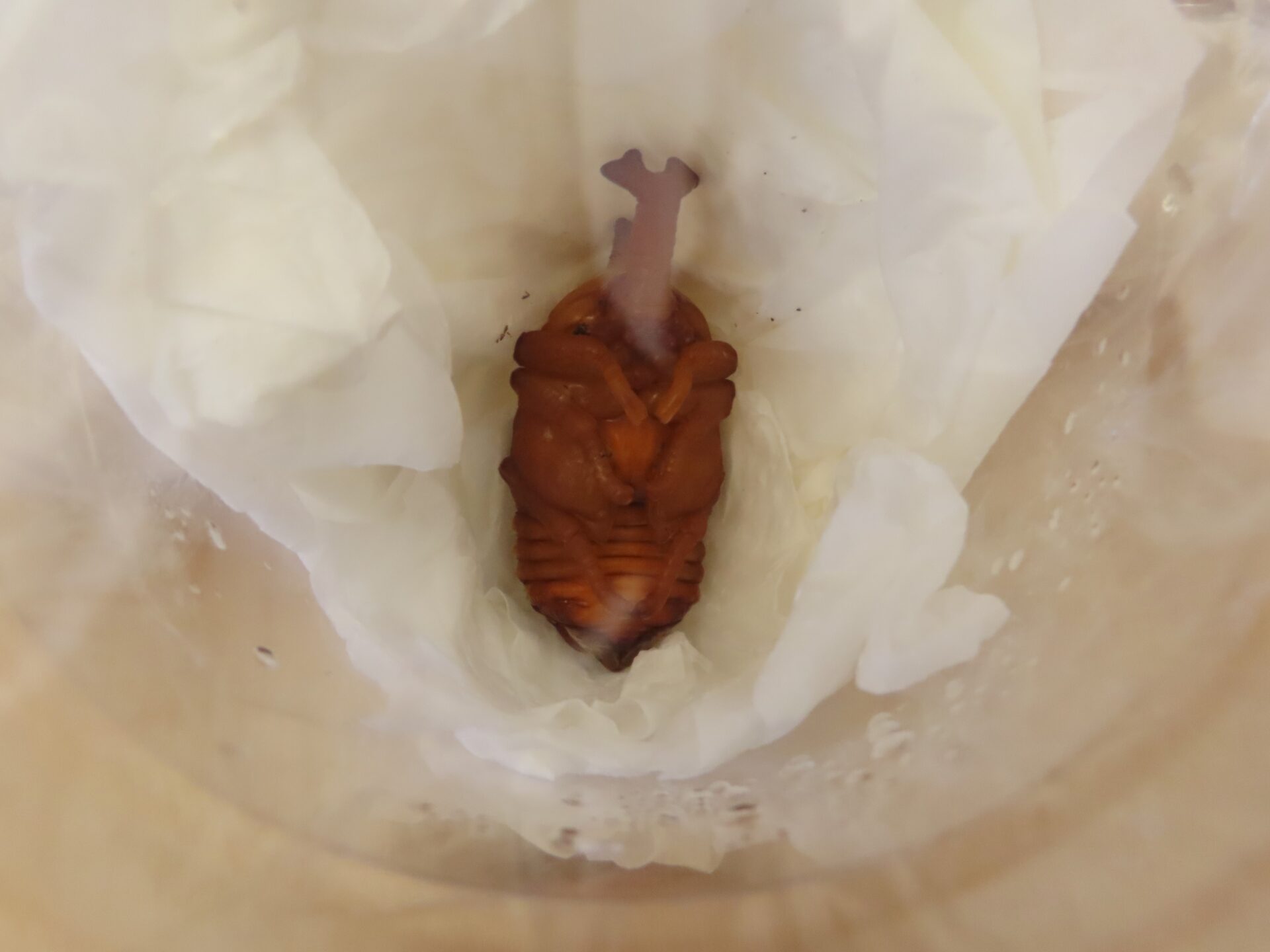 無事にペットボトルとキッチンペーパーで作った人口蛹室に引っ越しができました。