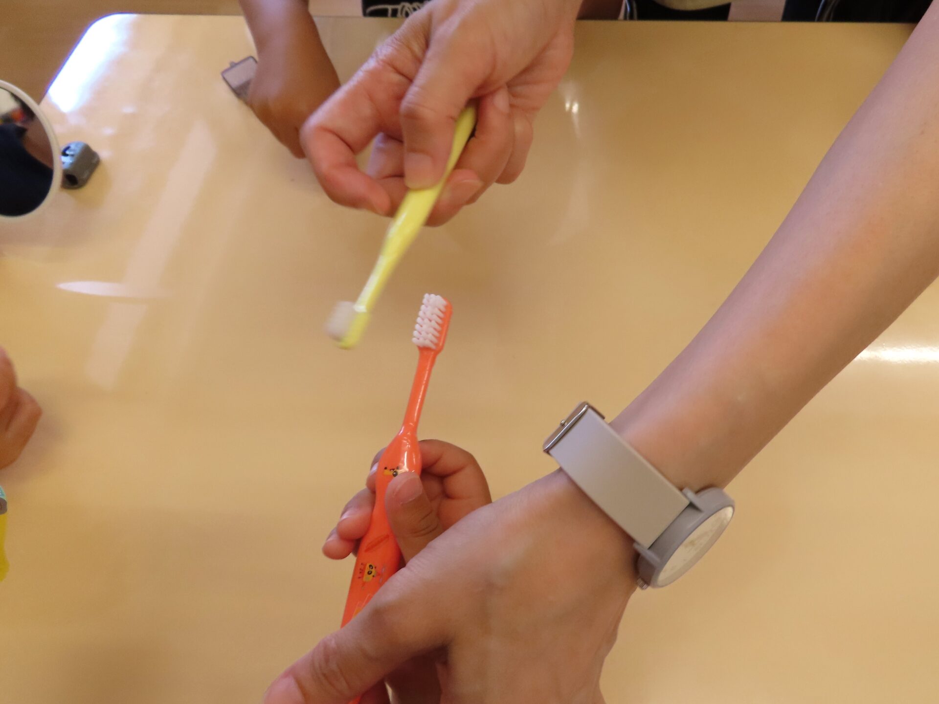 今年も名取市保健センターより歯科衛生士の方に来園いただき、歯の磨き方を教えてもらいました。