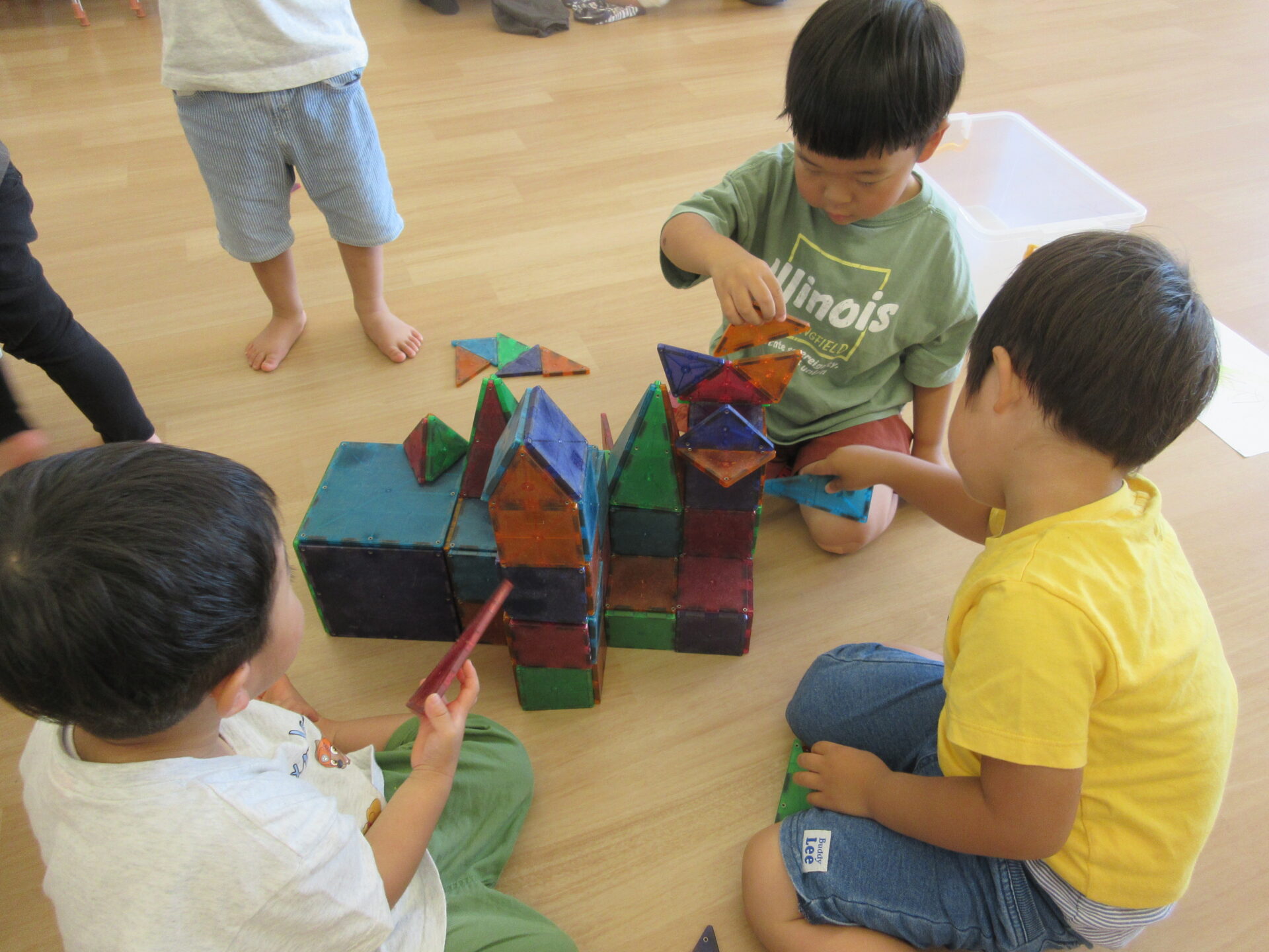 にじ組(3歳児)のこどもたちがピタゴラスブロックで遊んでいます。はじめは平面に並べて遊ぶことを楽しんでいたのですが、だんだんと立体的に組み立てて作ることも楽しんでいます。