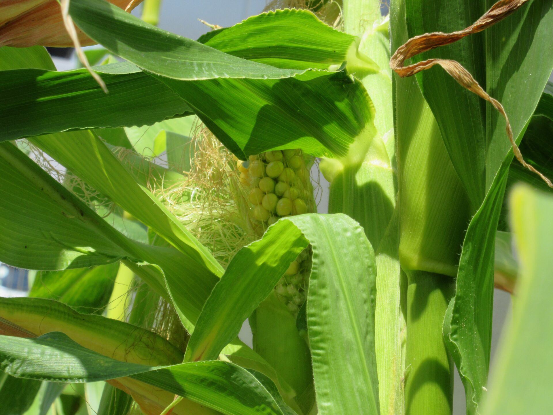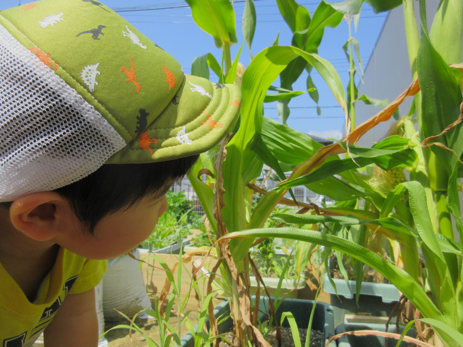 水遊び中に野菜の水やりや観察もしていて、この日は、Aさんがとうもろこしの実ができていることを発見しました。