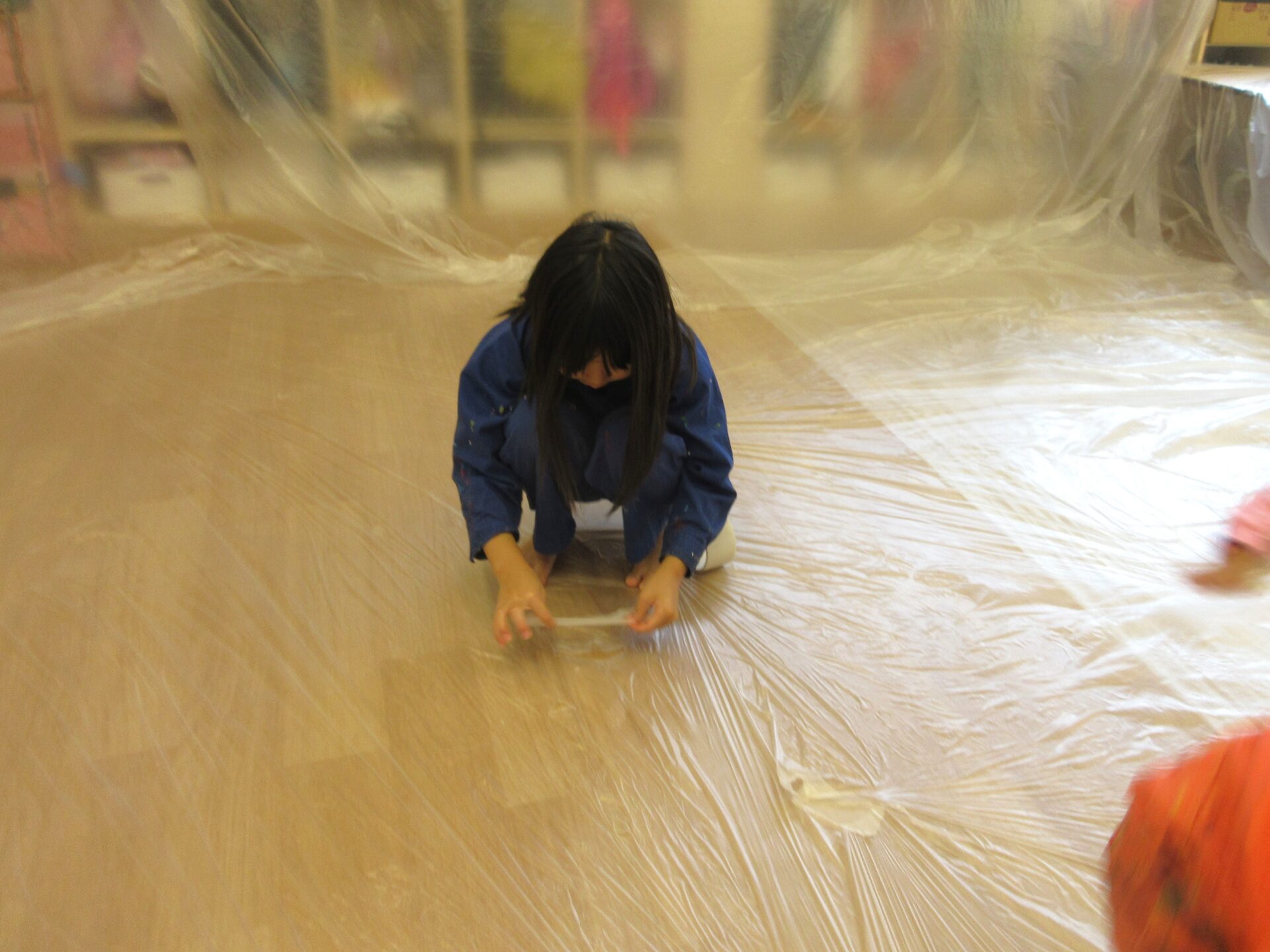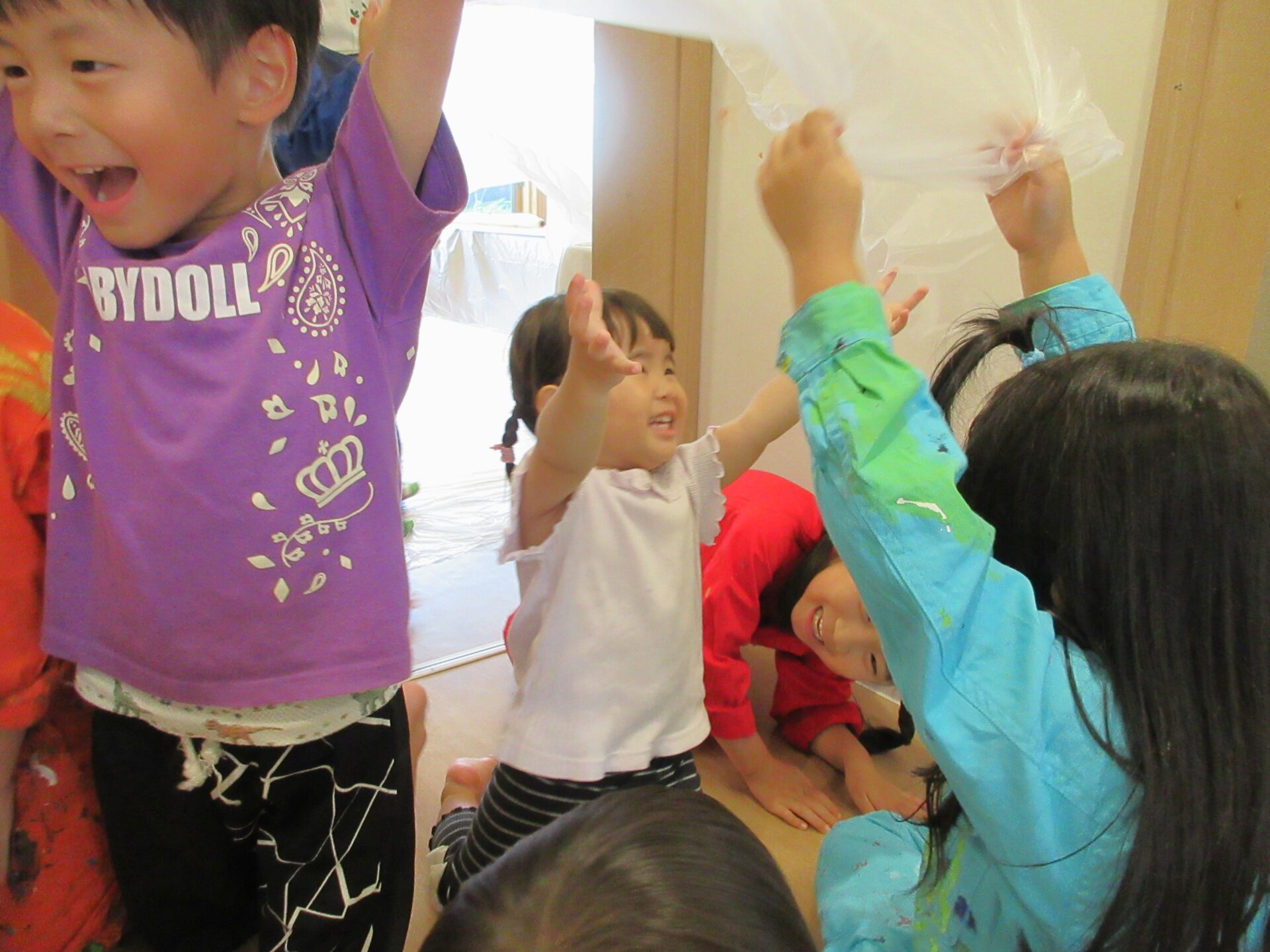 絵の具遊びの準備は、保育者とくじら組のこどもたちで行いました。