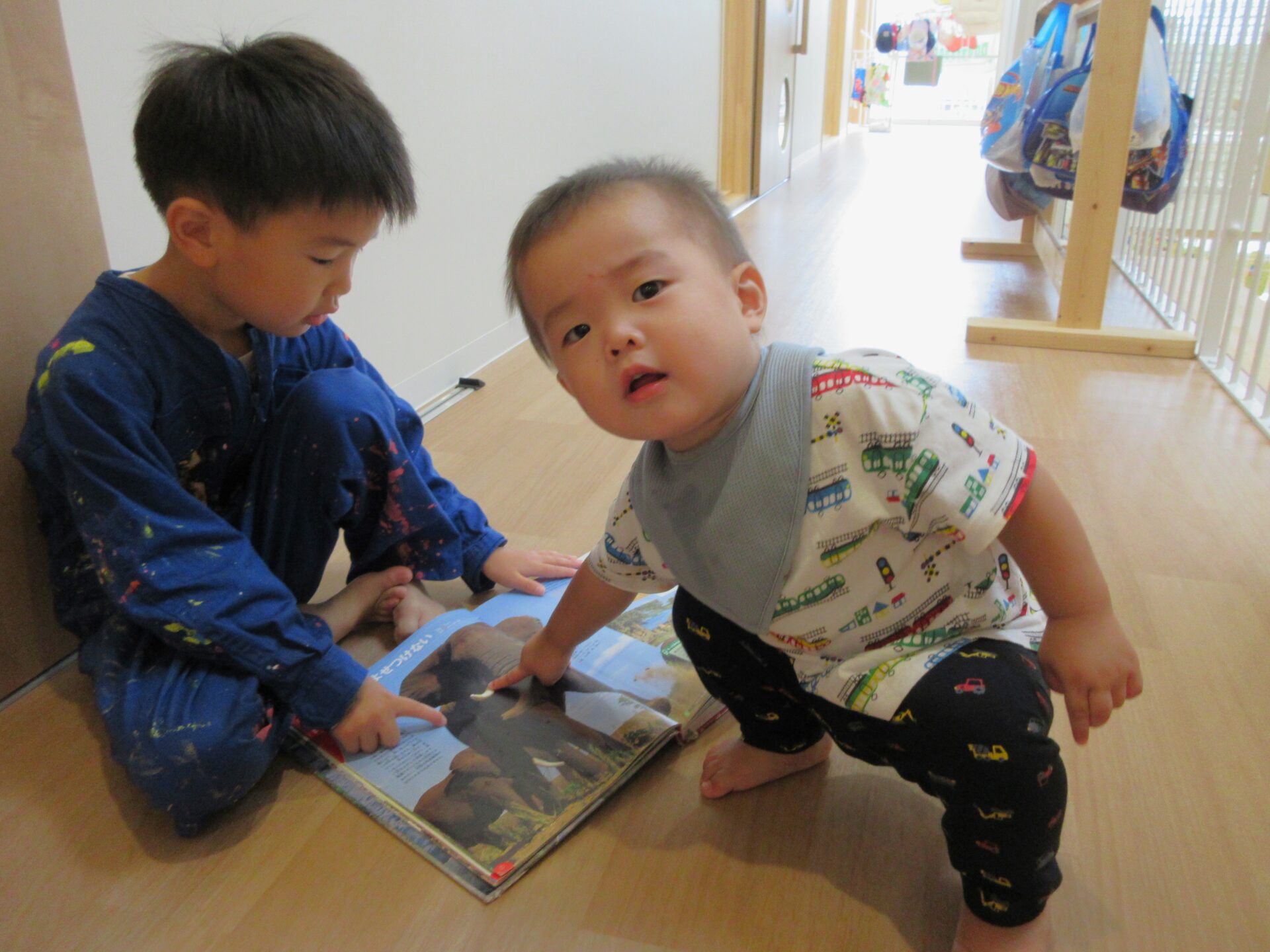 準備が終わるまでの間、他のくじら組のこどもたちは『○○くんは、どんなことが好きなの?』とだいち組の保育者に聞いて、だいち組のこどもたちが興味のある本を選んで、一緒に見てくれました。