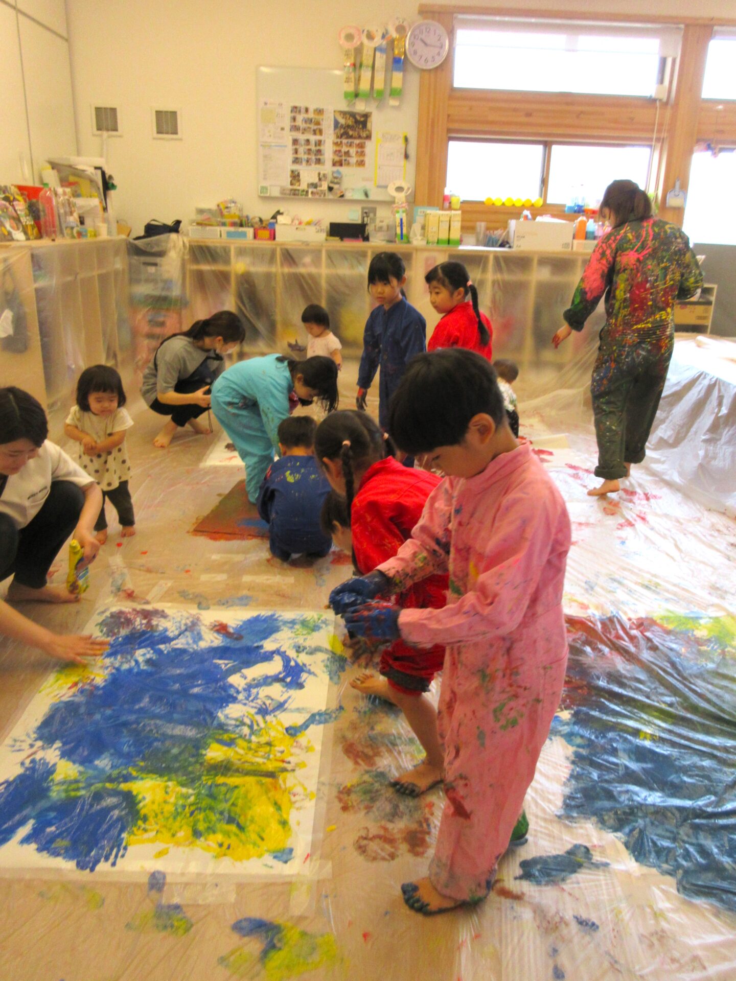 だいち組が絵の具に慣れ始めると…遊び方はダイナミックになります!