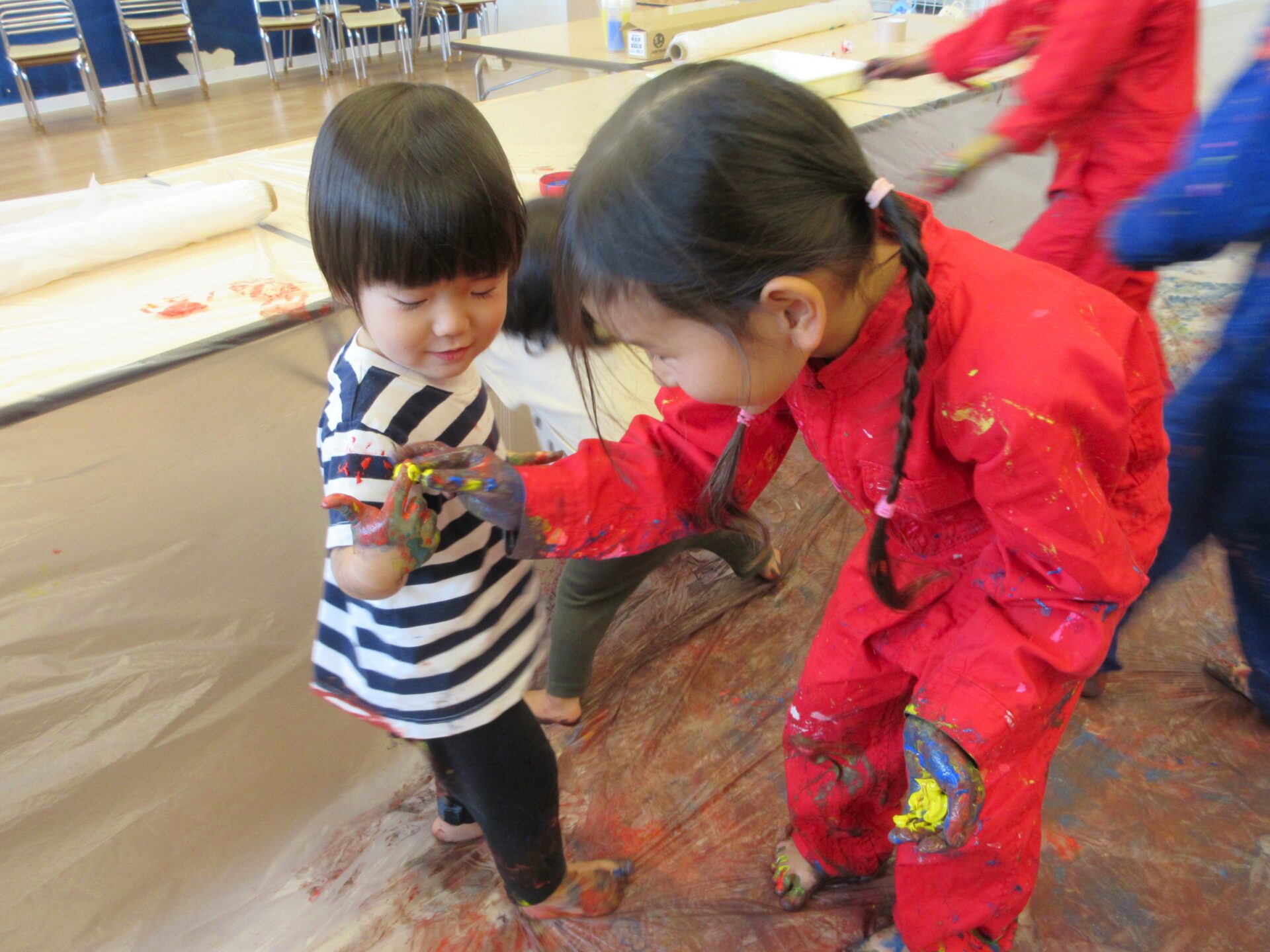 絵具のぬるぬるでつるっと滑らないように、くじら組がだいち組と手を繋ぎ、一緒に歩くこともありました。