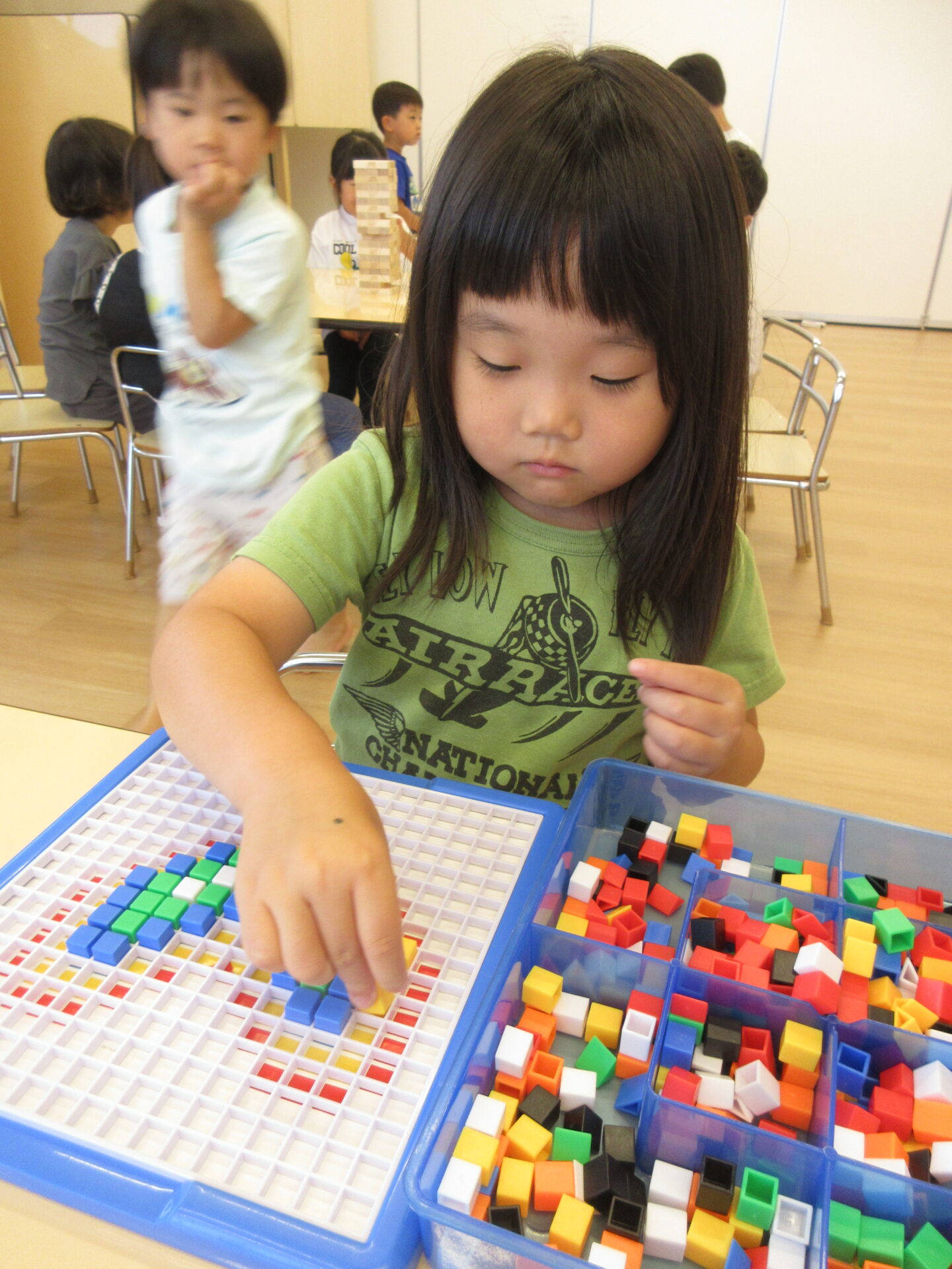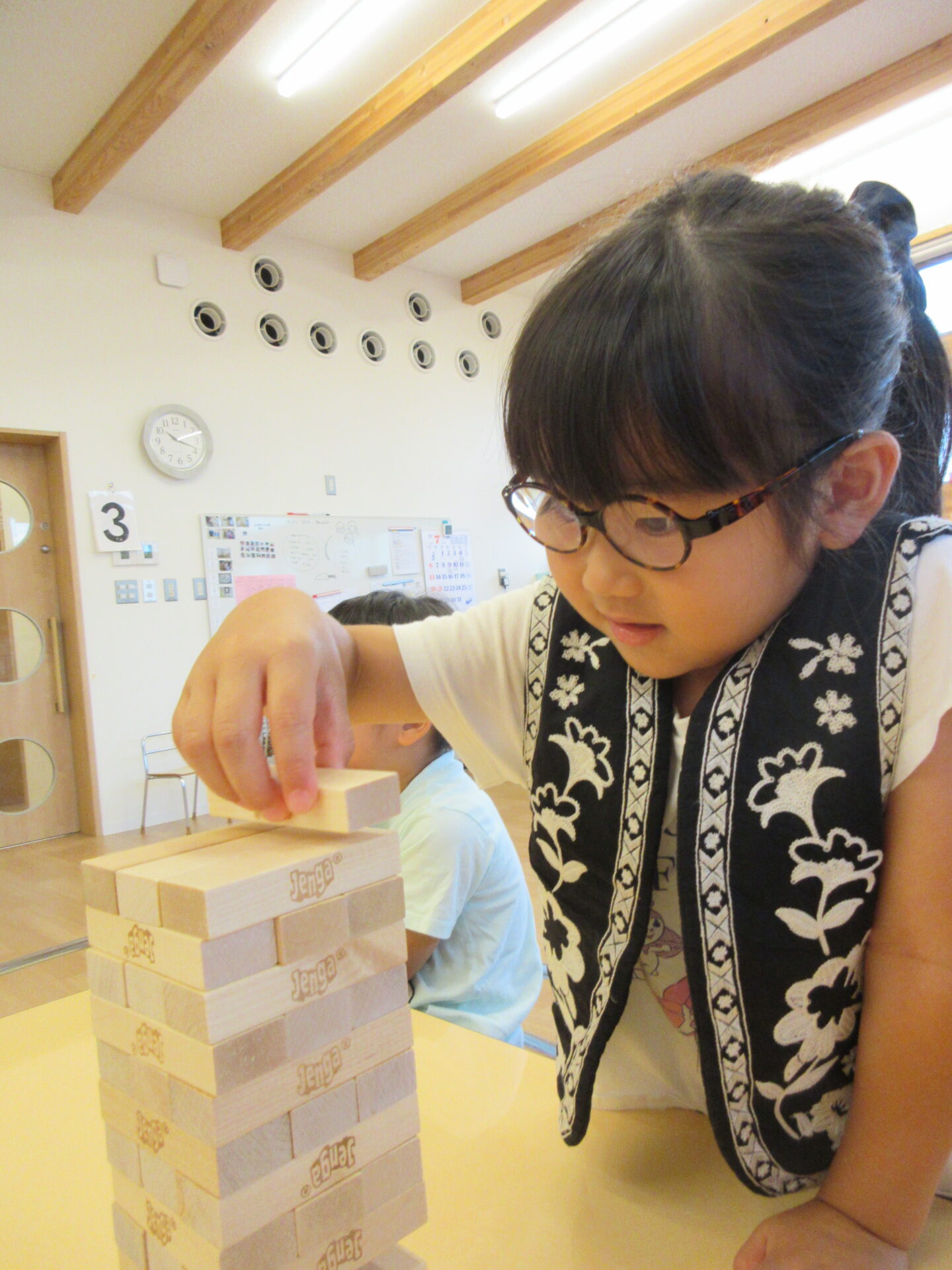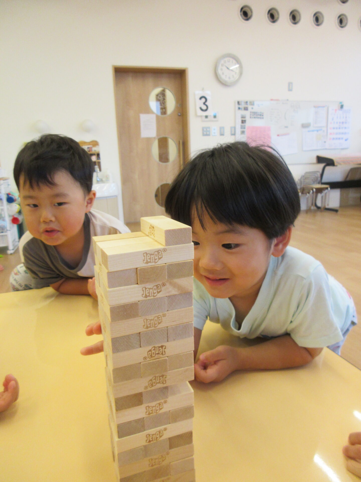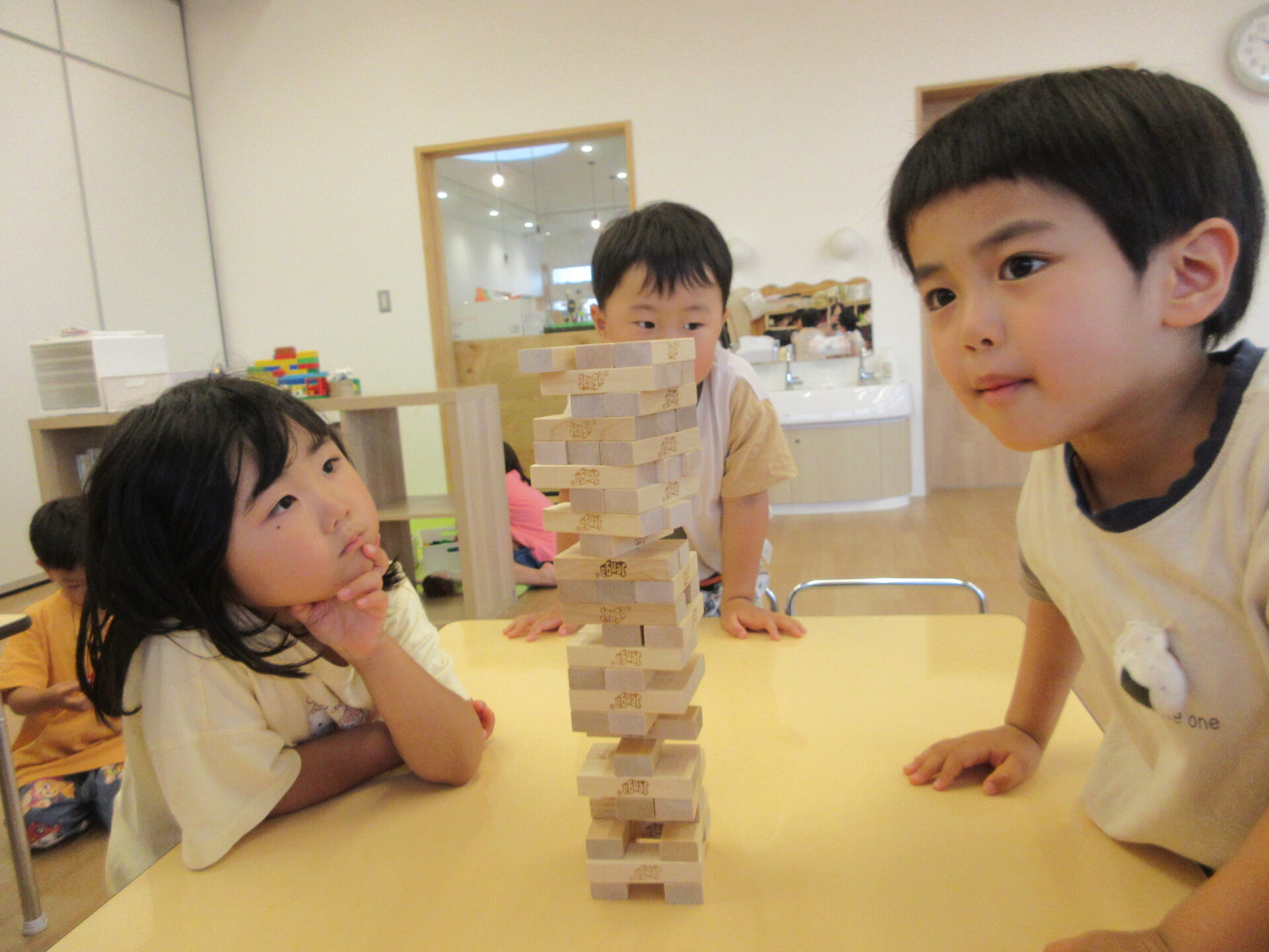 ジェンガは崩さずに抜くために、指先の細やかな動きと集中力が必要ですが、友だちと一緒に挑戦することを楽しんでいます。