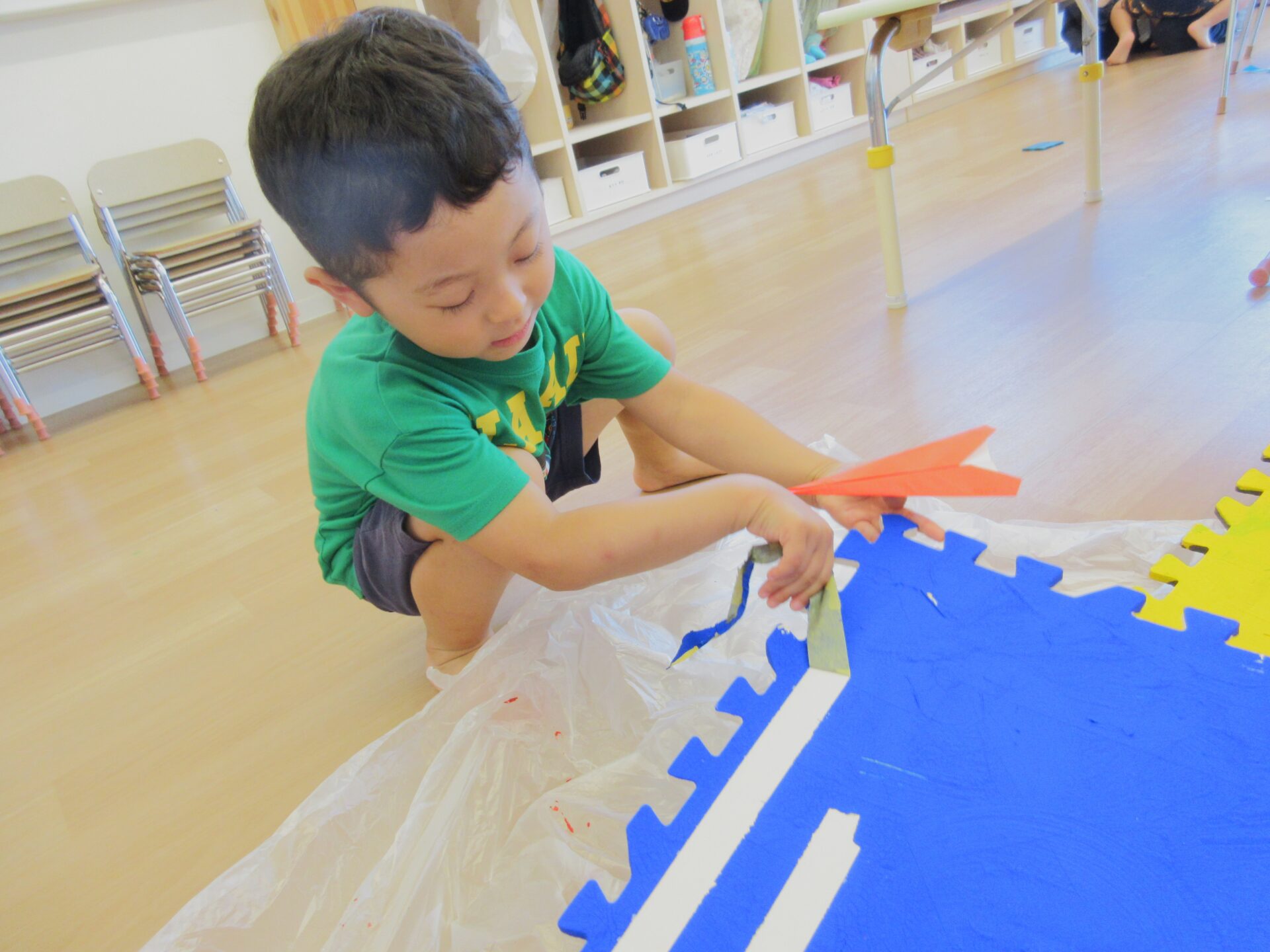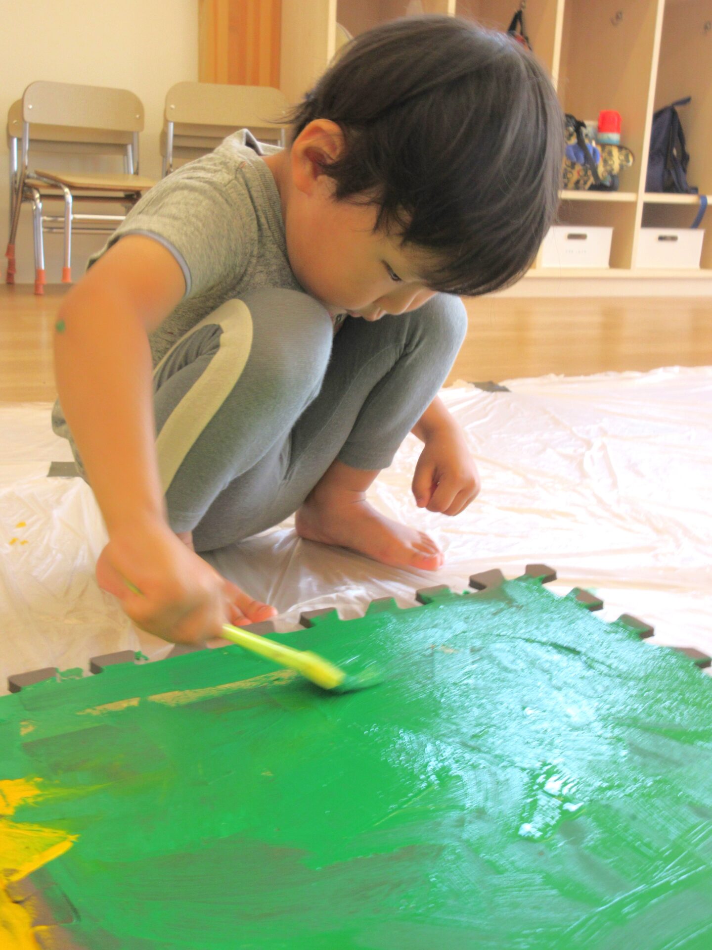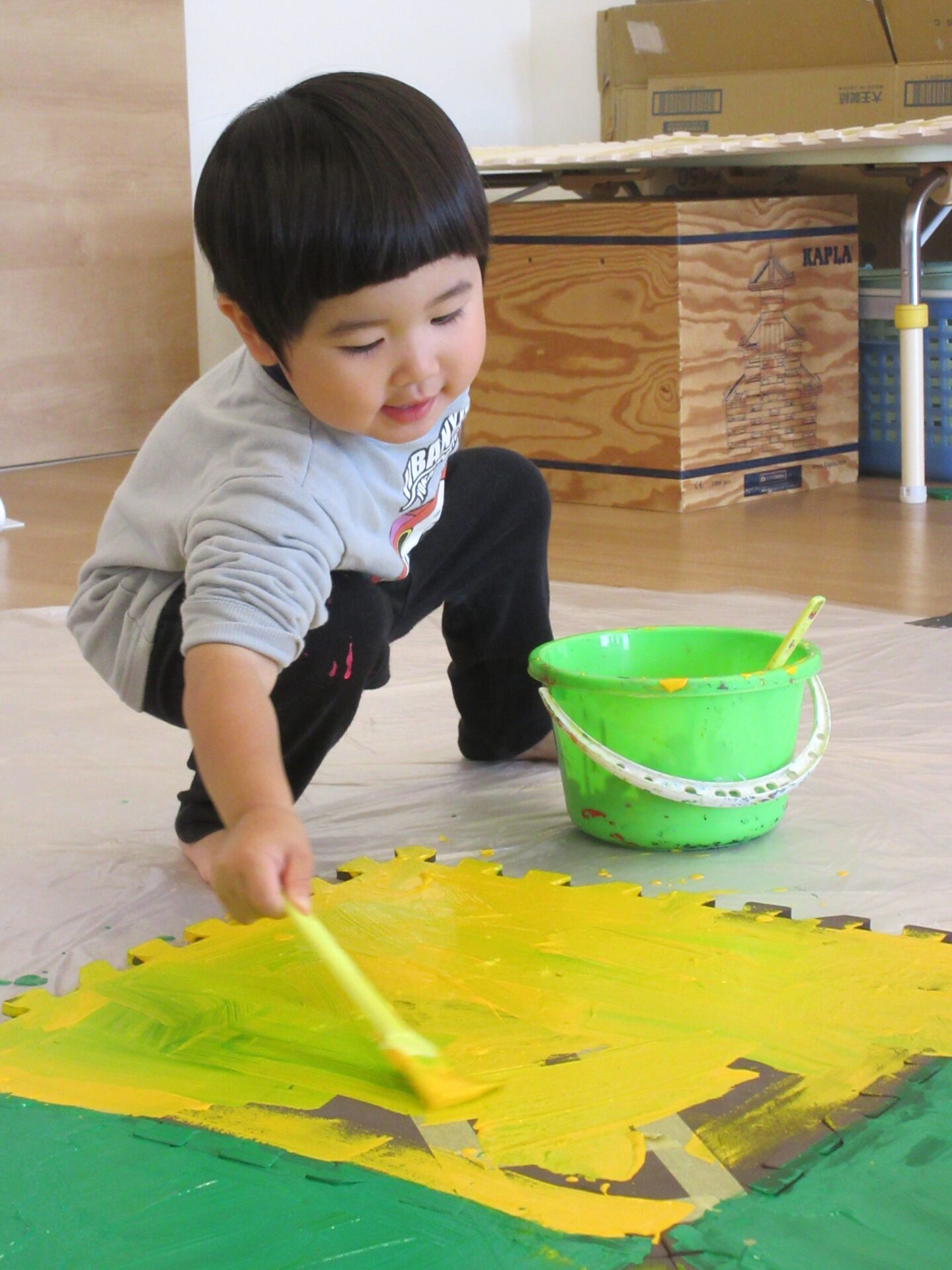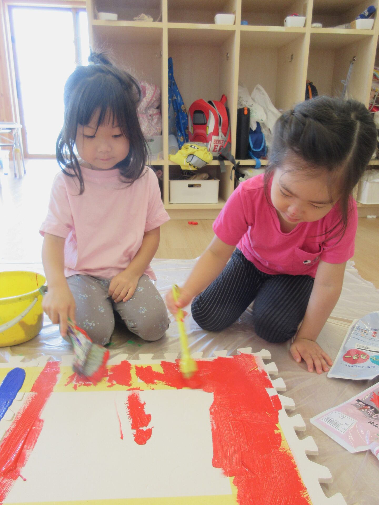 にじ組(3歳児)のこどもたちが絵具を塗っているものは…